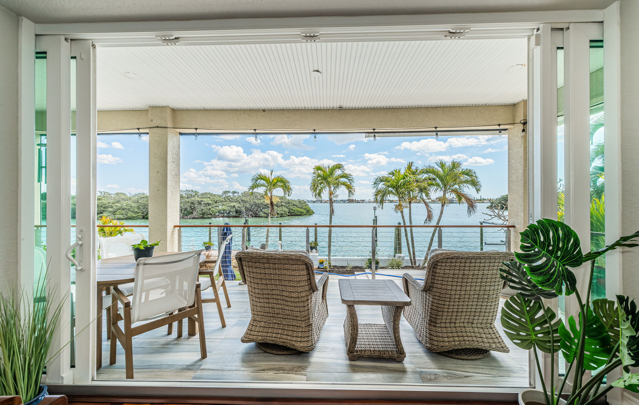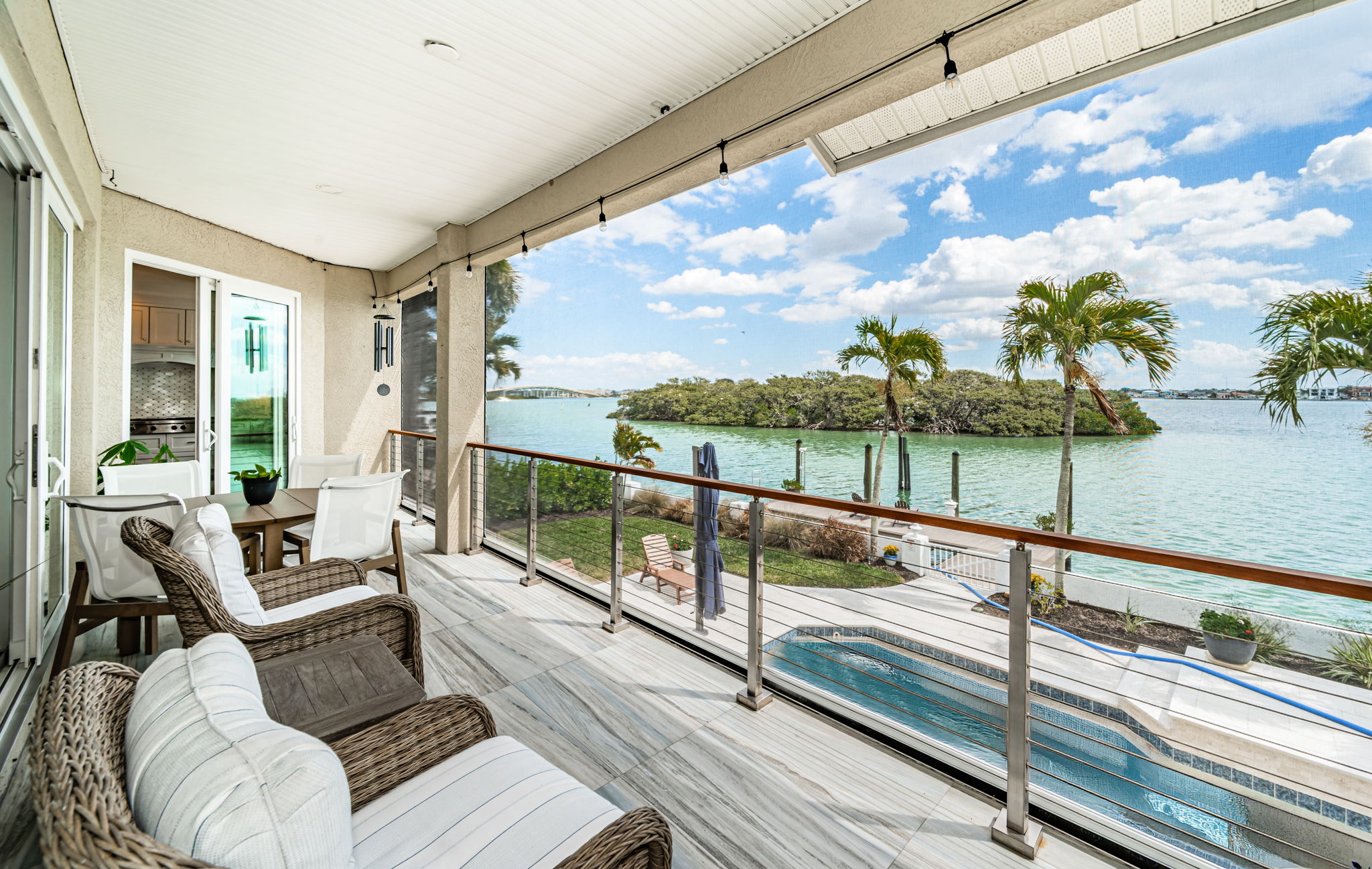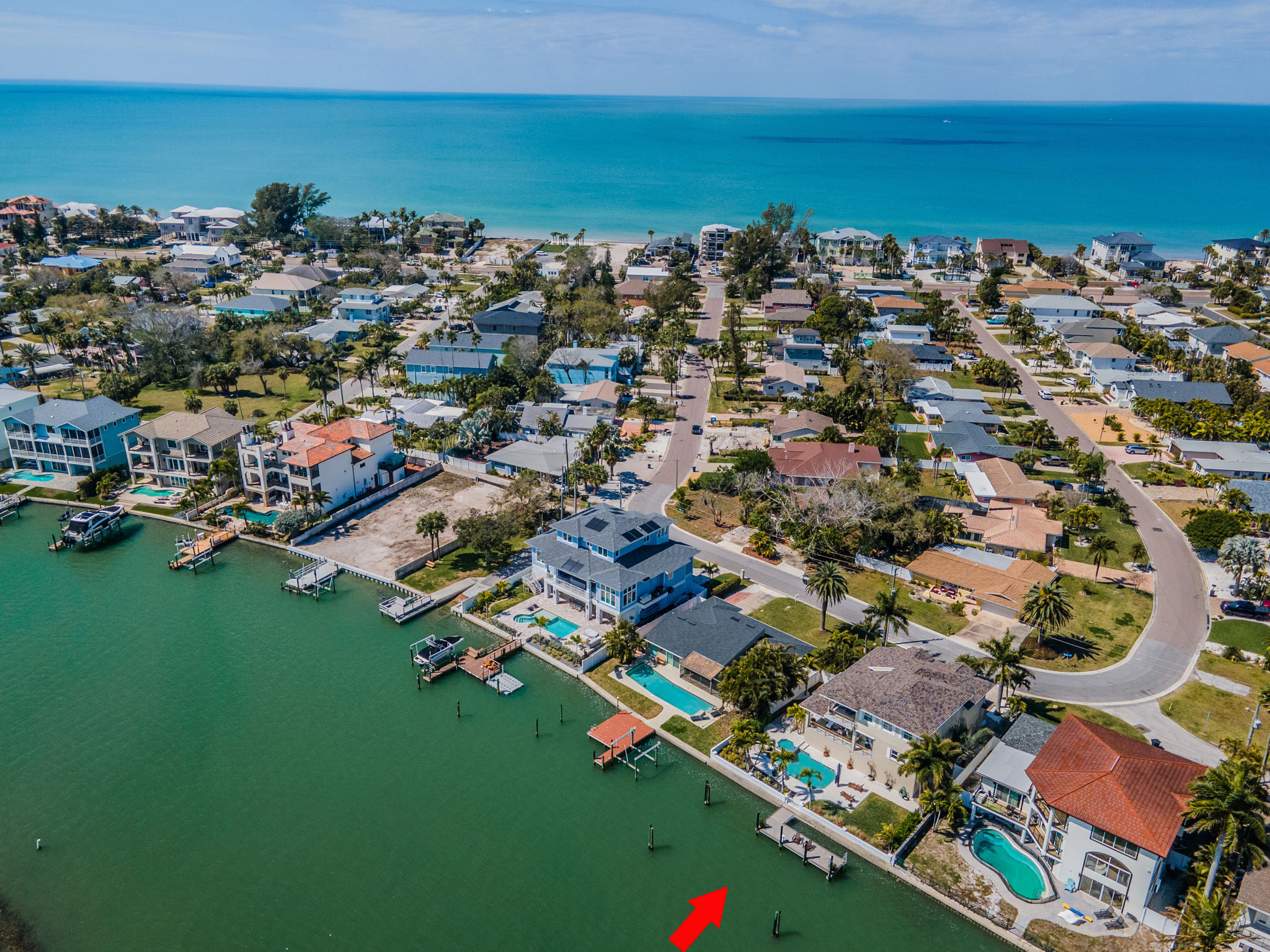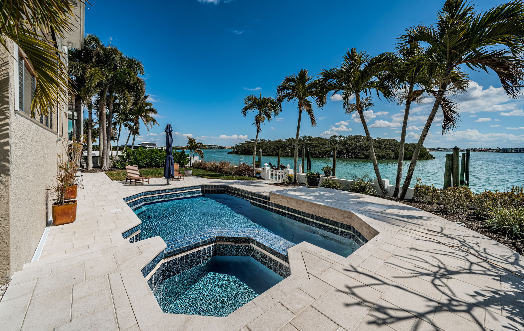 ENJOY THE BEST OF BOATING AND THE BEACH IN THIS BEAUTIFULLY UPDATED COASTAL LUXURY RESIDENCE WITH ASSUMABLE FLOOD INSURANCE POLICY COSTING JUST 897/YEAR! Located on the terrific boating water of the intracoastal waterway, and just a short five-minute walk to the beach, welcome to a home that breaths elegance and refinement! An appealing circular brick paver driveway introduces a lovely covered entry and wonderful views of the waterfront. Gorgeous Brazilian cherrywood floors, superb woodworking, fine window treatments and radiant lighting deliver a distinctive and inspiring allure. The resplendent living room area, with 13ft-high vaulted ceiling and exquisite custom built-in media/storage center, features pocketing sliding-glass doors that transition to 28ft wide covered luxury balcony with a motorized screen enclosure system. Pocketing sliders enable a fantastic indoor-outdoor living and entertaining experience. Overlooking the waterfront, your sumptuously-appointed kitchen makes cooking a true joy – with lavish marble and pounded granite surfaces, richly-tiled backsplash areas, generous coastal white cabinetry, high-end appliances including Wolf gas cooking, a large island bar and prep-center, a spacious pantry closet, and immediate access to two dining areas. The upper level is a dedicated owner’s suite with the grand bedroom and sitting area overlooking the intracoastal waterway; bedroom features his and her closets (hers is an oversized walk-in) and a private covered balcony with commanding views of the waterfront. The owner’s bath is a posh, pampering experience – with a beautifully encased jetted spa tub, beaded-board wainscoting, splendid his and her vanities and a walk-in glass shower enclosure. A separate split ½ level contains a large en suite bedroom with graceful full bath and walk-in closet, and a second large bedroom with walk-in closet - supported by an adjacent full guest bath with luxury finishes. Out back you’ll discover a dazzling pool/spa with posh tilework, a newly-installed Pebbletec finish, and a fabulous shellstone paver deck. The composite dock, with extensive shore power and water, supports a large deepwater (8ft of depth) boat slip with tie pole support for a 28ft beam. This exceptional residence has a 6-month new roof and enjoys tankless gas hotwater heating, whole-house water softening, modern custom handrails, 1000 sqft of secure under-structure storage, Tesla vehicle charger, and Tesla whole-house battery backup system (with fully functioning solar panels in garage awaiting your installation). Home enjoys private “residents only” access to the beach and is a short drive from the dining, shopping and entertainment of Clearwater Beach and Indian Rocks Beach. An outstanding open waterfront value in Belleair Beach!