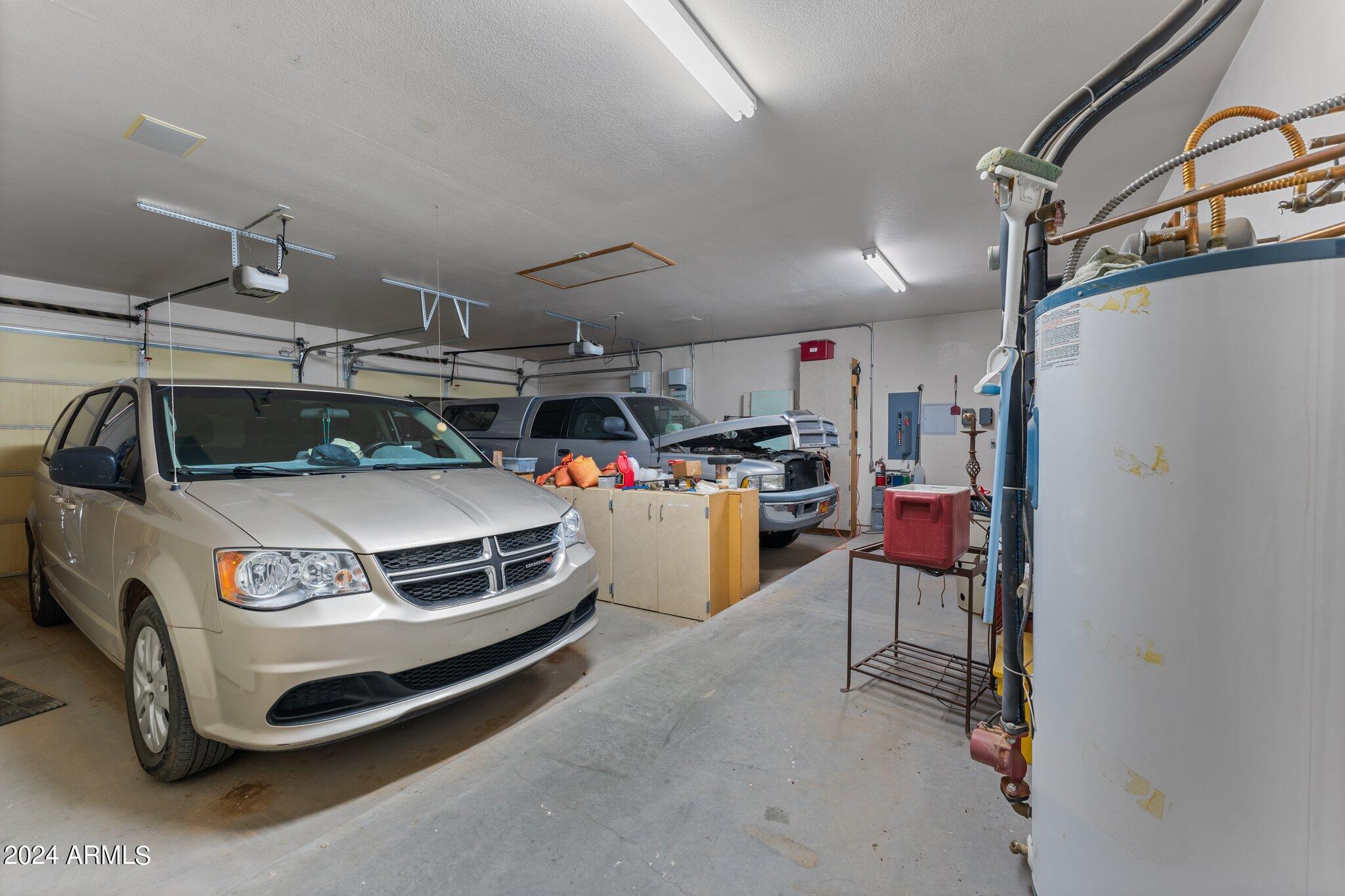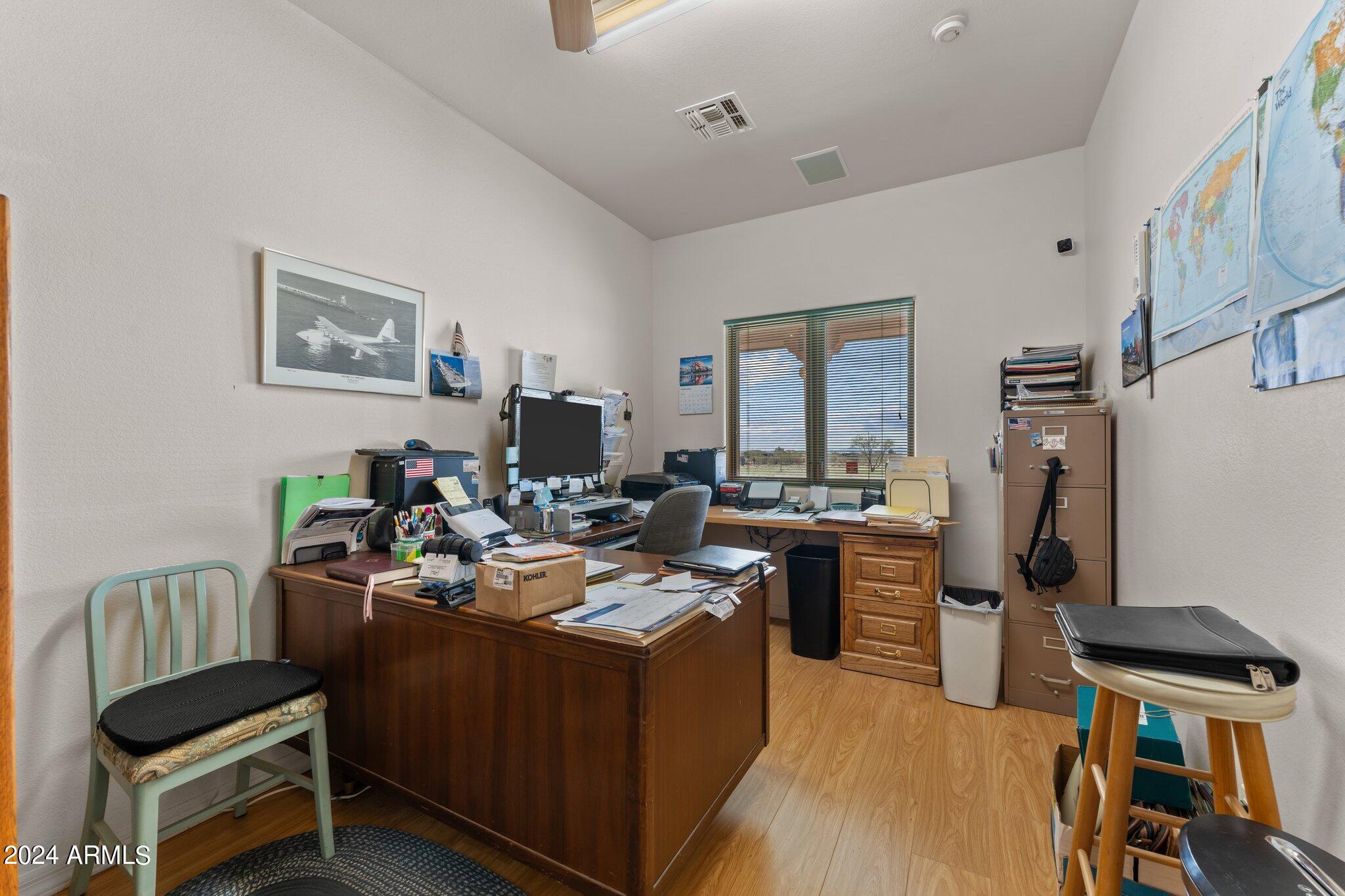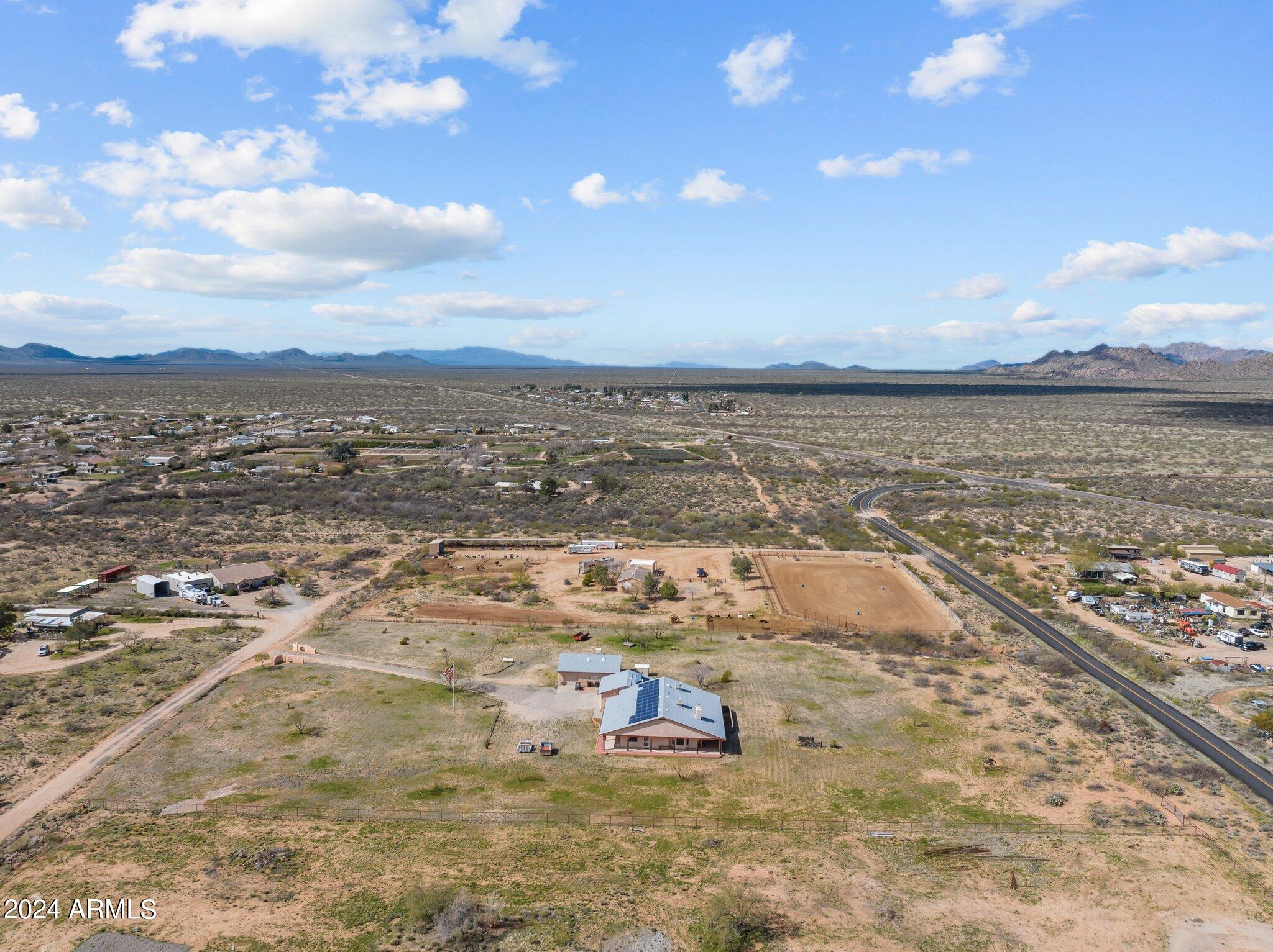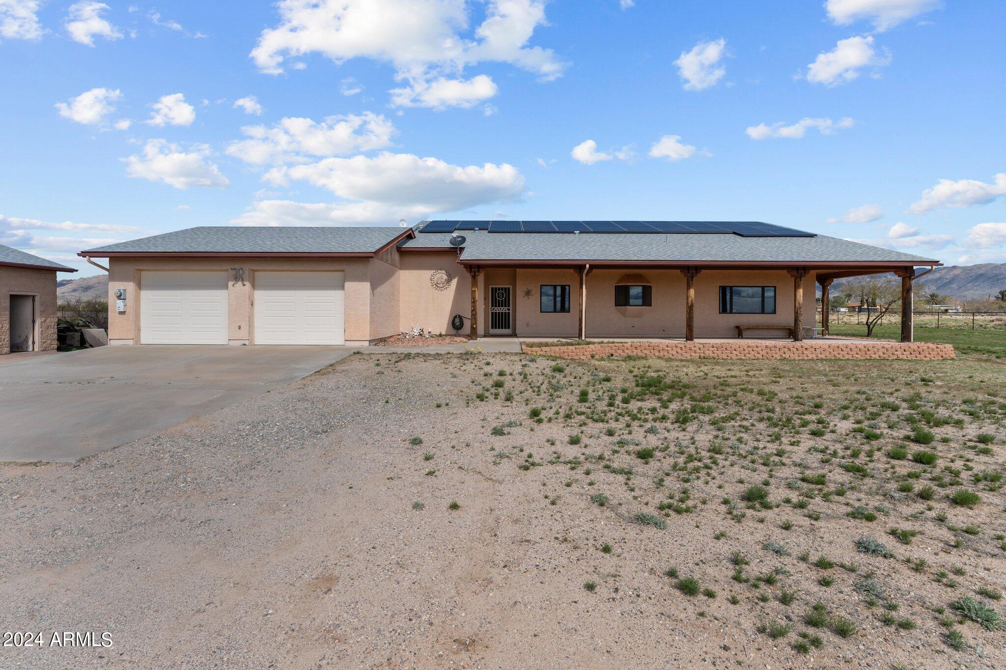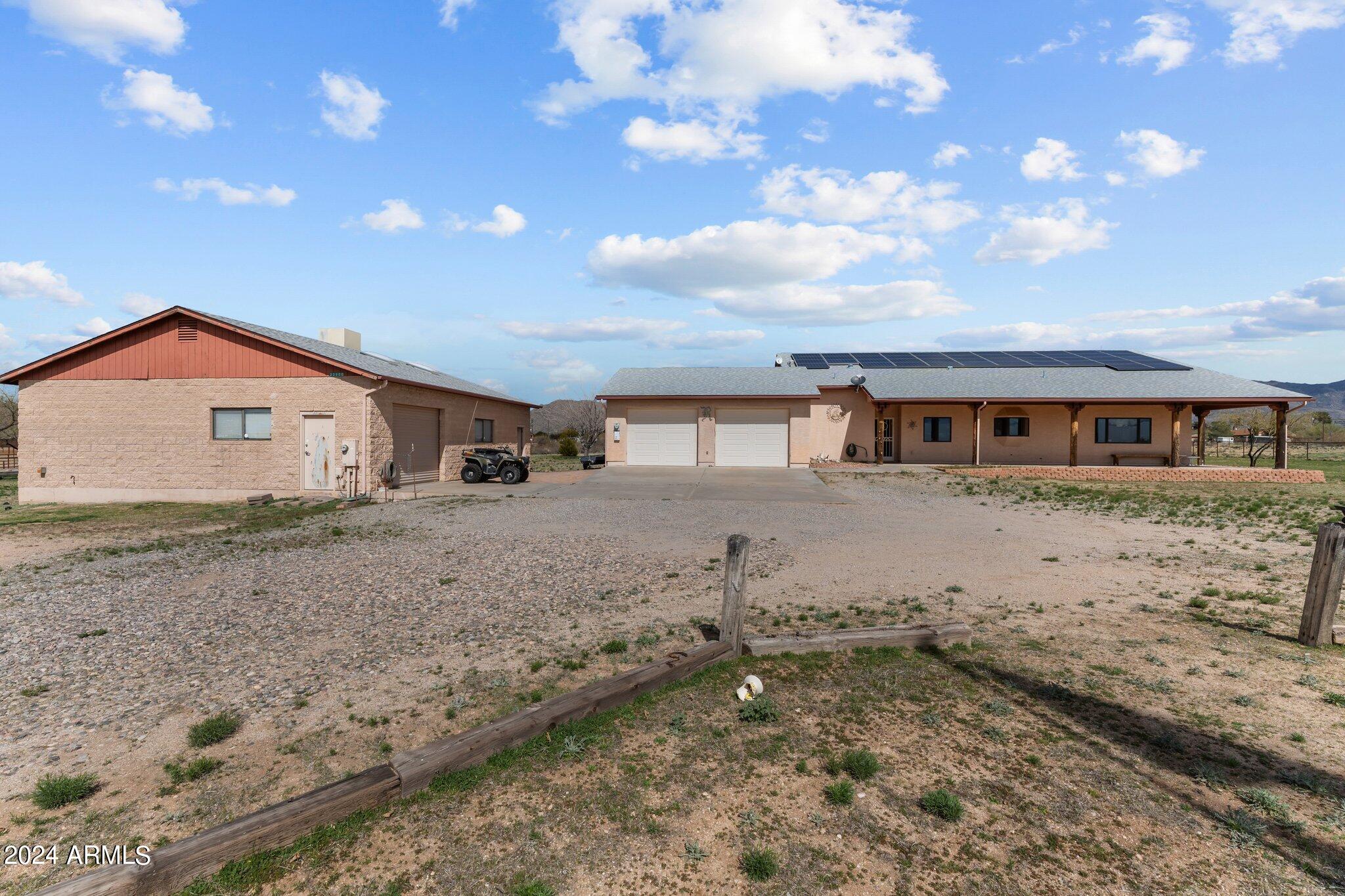 HORSE PROPERTY! 4.44 AC. NO HOA! Newly painted shop. Fenced in on 3 sides. Double gate & single gate entering through the back of the property. One owner. Lots of room for your horse setup. Located in a quiet community. Easy access to Wickenburg & Prescott. Relax on the covered wrap around porch. Security system. Open floor plan. Kitchen, dining and living room are all open for lots of entertainment. Relax by the fireplace while enjoying the built-in wet bar. Large master bedroom w/large walk-in closet & his & hers full bath. 2 offices. Full basement w/power, great for storage. Leave the 3 custom metal doors for nice evening breeze. Large, oversize workshop/garage. Solar panels & solar hot water heater. Full RV Hookup. New roof on home and workshop. Property sold with most furnishings .