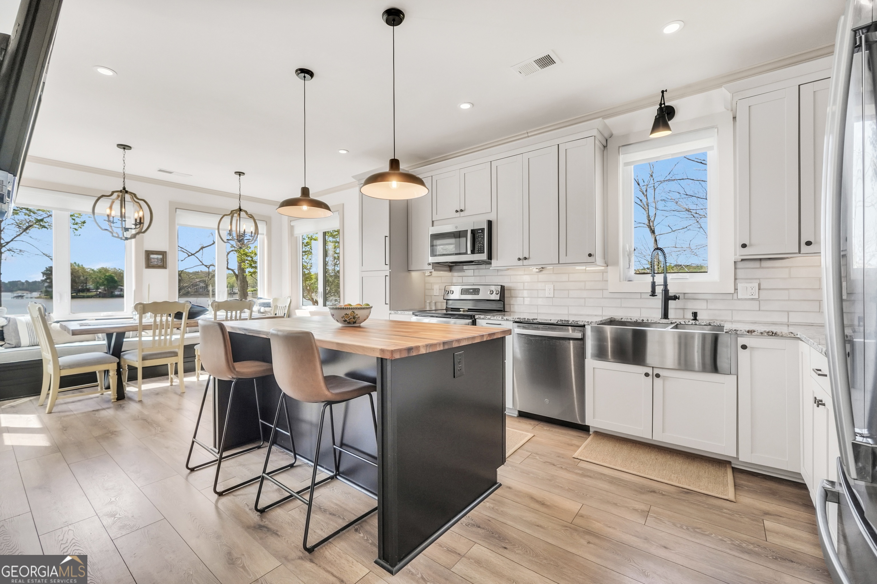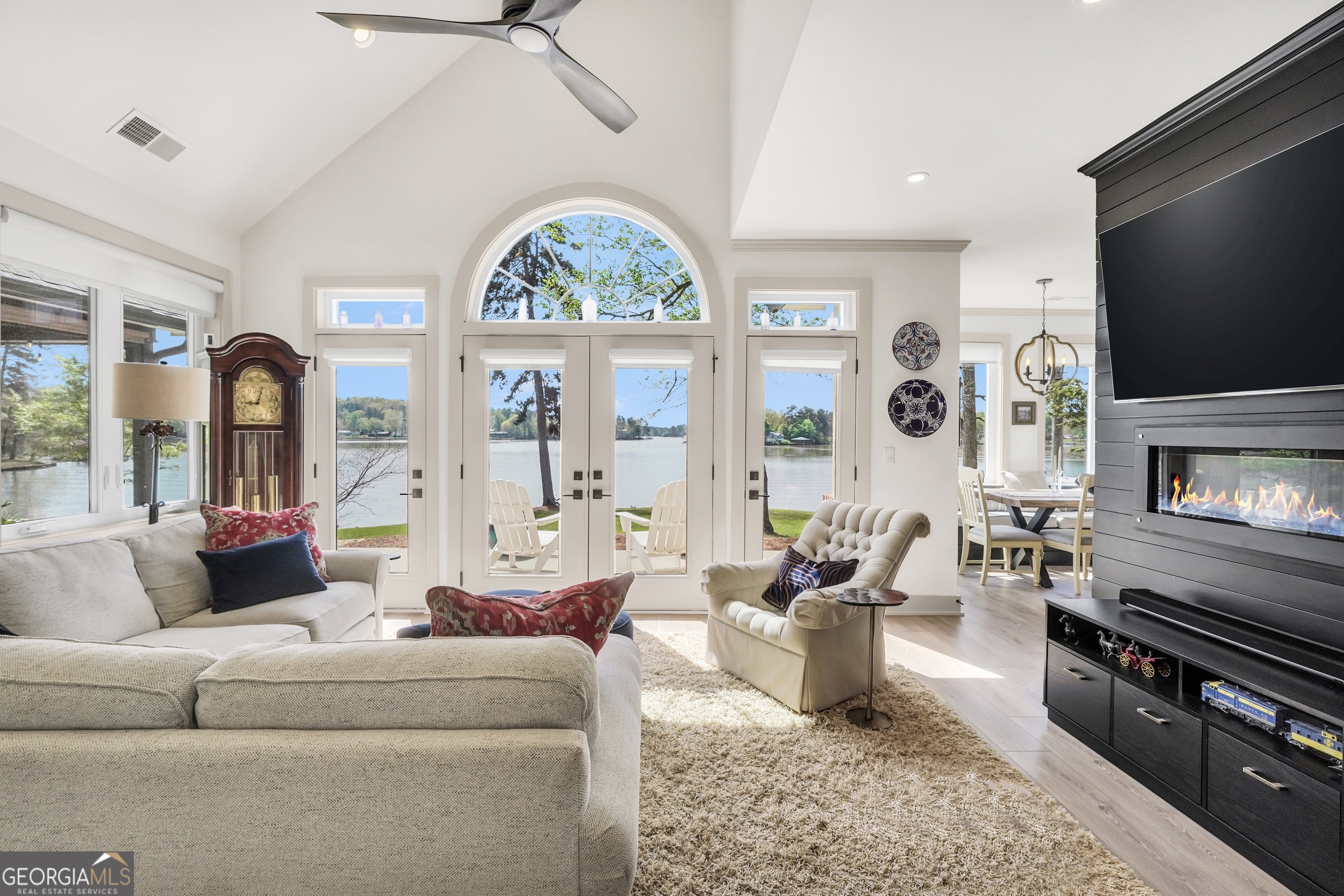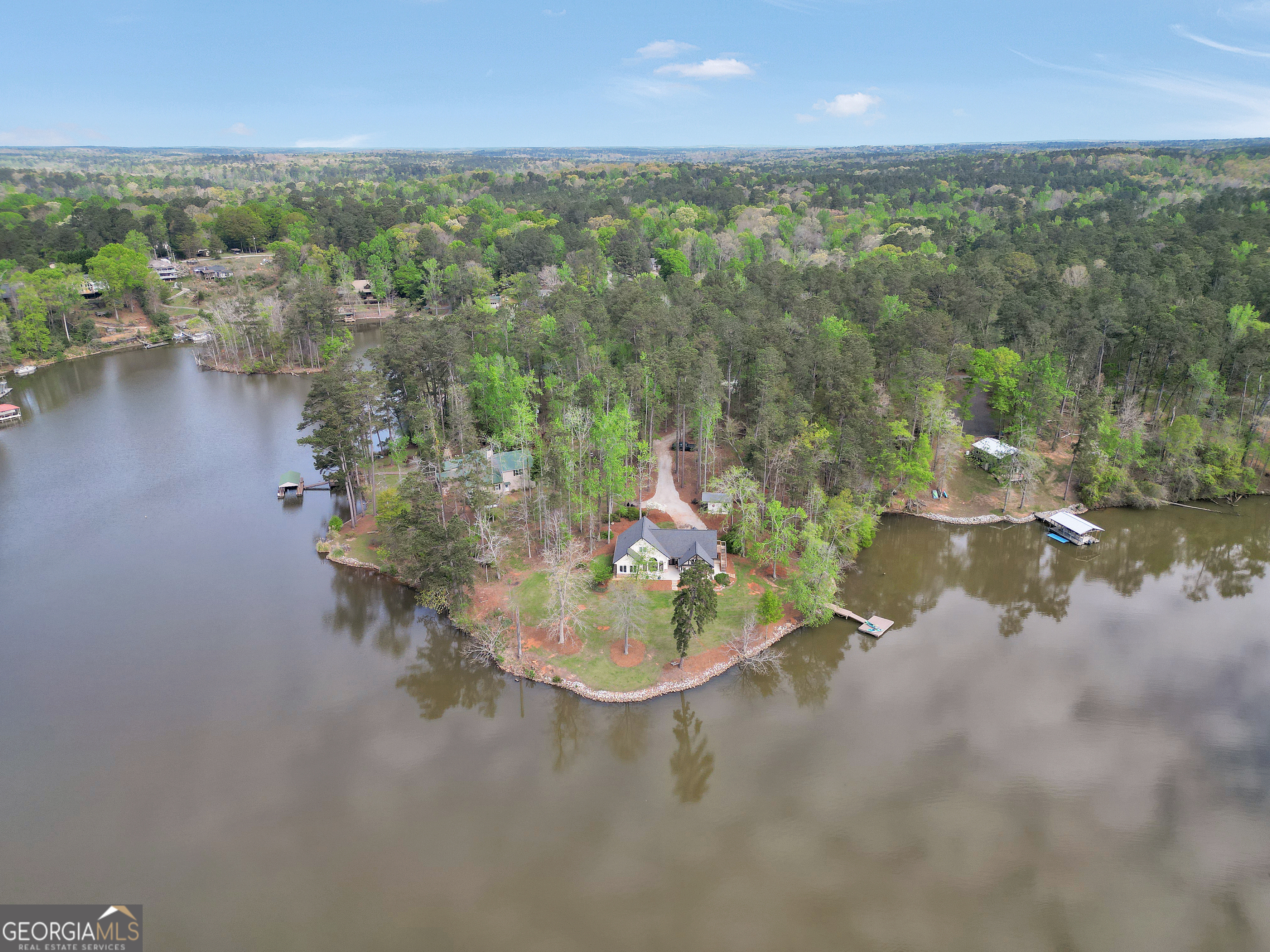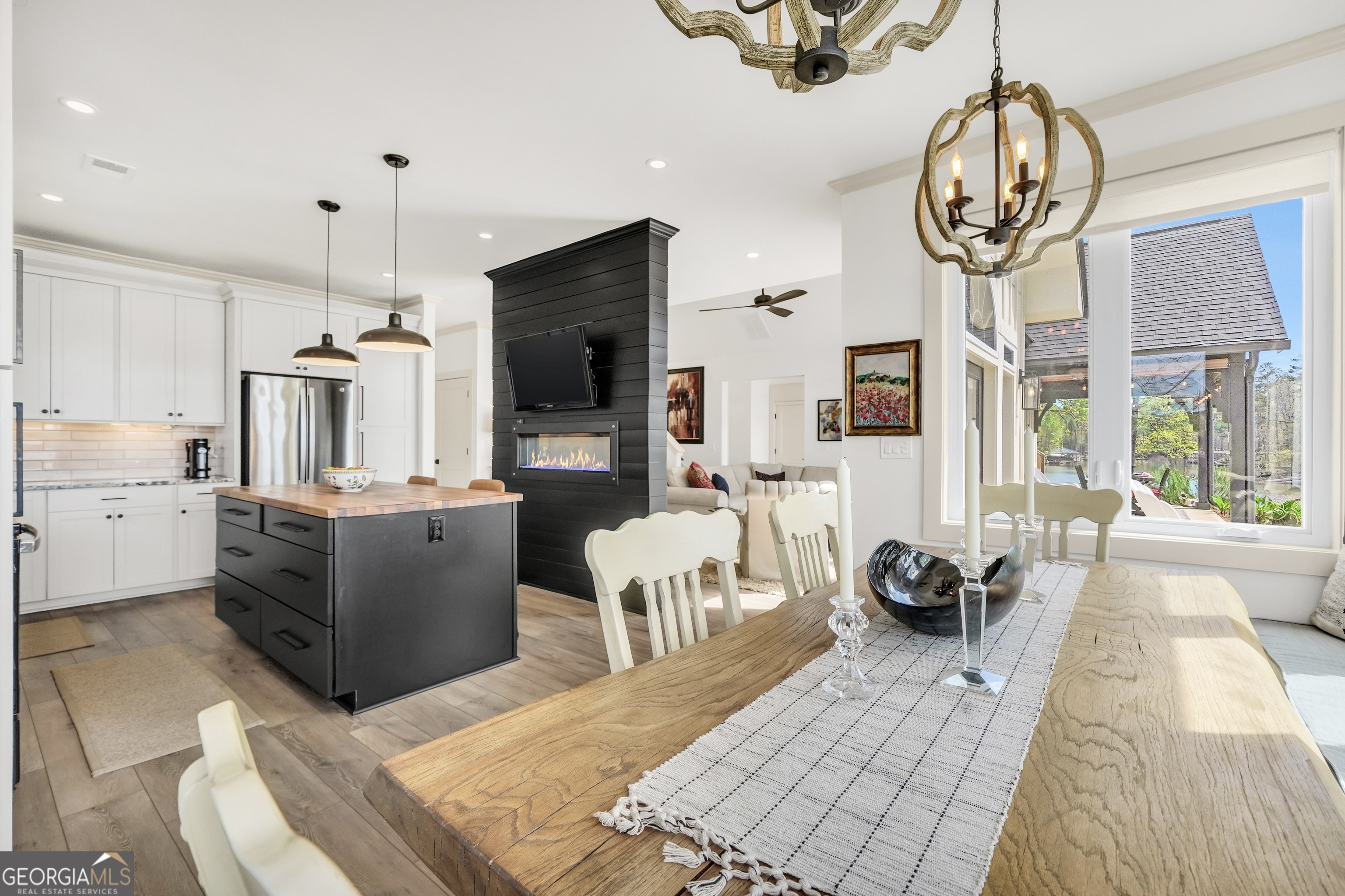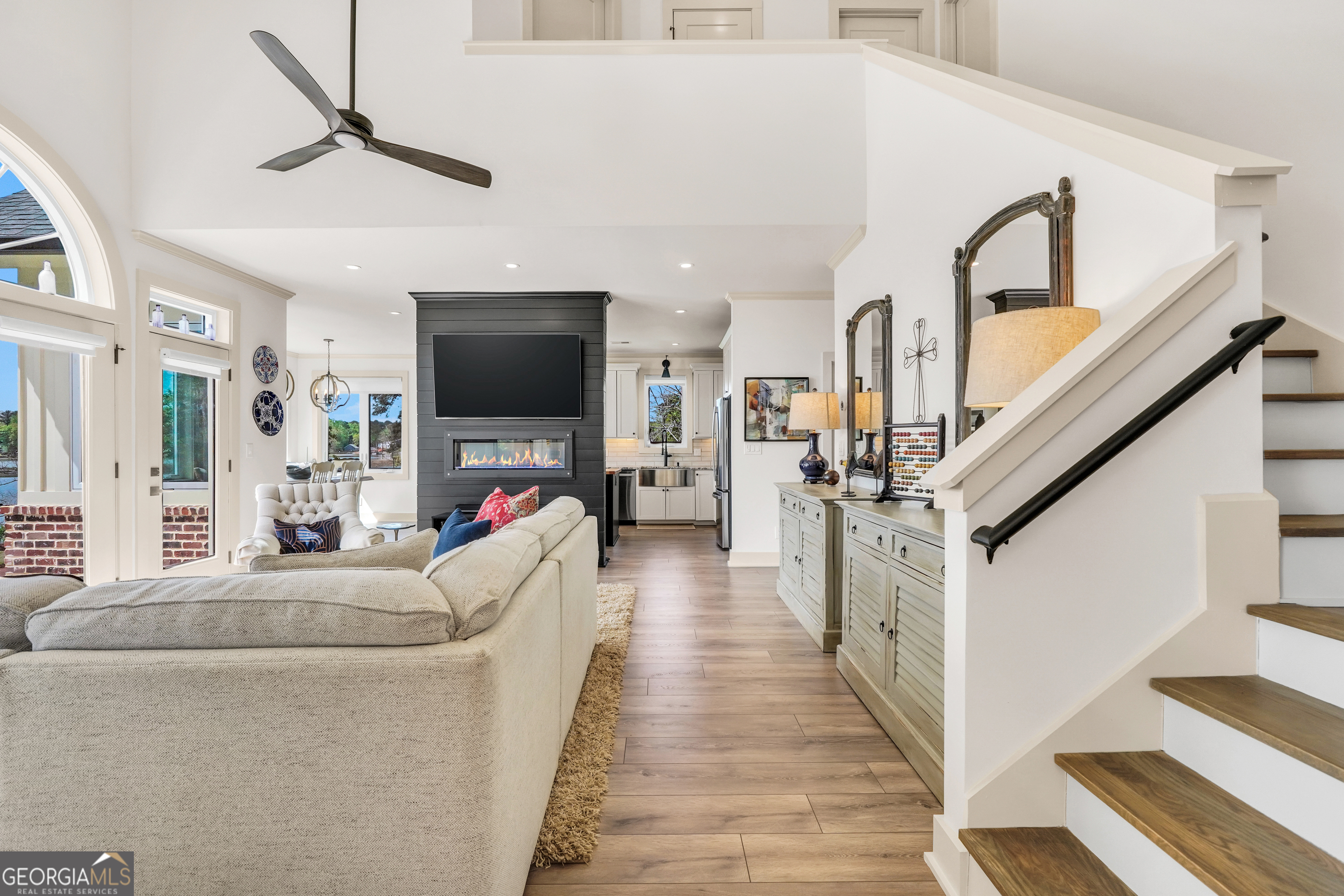 Jackson Lake Dream Home! With over 500 feet of Jackson Lake shoreline, a kayakers playground, a bird watchers paradise, and a front-row seat to one of the most breathtaking views on the water - 451 Mayo Road is the one youve been waiting for! Built in 2023 and meticulously maintained, this stunning lakefront retreat offers the rare combination of modern finishes and true waterfront living in the heart of Newton County. With a southern exposure, nearly every room in the house captures gorgeous natural light throughout the day - and those late afternoon rays hitting the water? Absolutely breathtaking. The thoughtfully designed interior features floor-to-ceiling doors and windows along the back of the home, flooding the living spaces with natural light and framing the lake like a living work of art. A showstopping double-sided fireplace anchors both the living room and kitchen, creating a warm and inviting flow ideal for entertaining. The open dining area is surrounded by windows, and the upgraded kitchen features a butcher block island - functional, beautiful, and built to last. A convenient half bath rounds out the main level. The primary suite is located on the main floor and features a well-appointed en suite with a stunning stone shower. Upstairs youll find two additional bedrooms and a full bath - plenty of room for family or guests. The oversized garage easily accommodates two full-size vehicles with room to spare for storage. Above the garage, a private studio apartment with kitchenette offers the perfect setup for in-laws, older teens, or guests who want their own space. Outside is where this property truly shines. Sitting on just under two acres at the end of a quiet cul-de-sac, youll have plenty of room to breathe, play, and spread out - all anchored by a nearly new floating dock and established riprap seawall. The covered patio is the perfect spot for dinners overlooking the lake, and stepping out through the French doors into that southern light never gets old. Over 500 feet of shoreline. All-day natural light. Incredible bird watching. Private guest suite. This one has it all - dont let it get away!