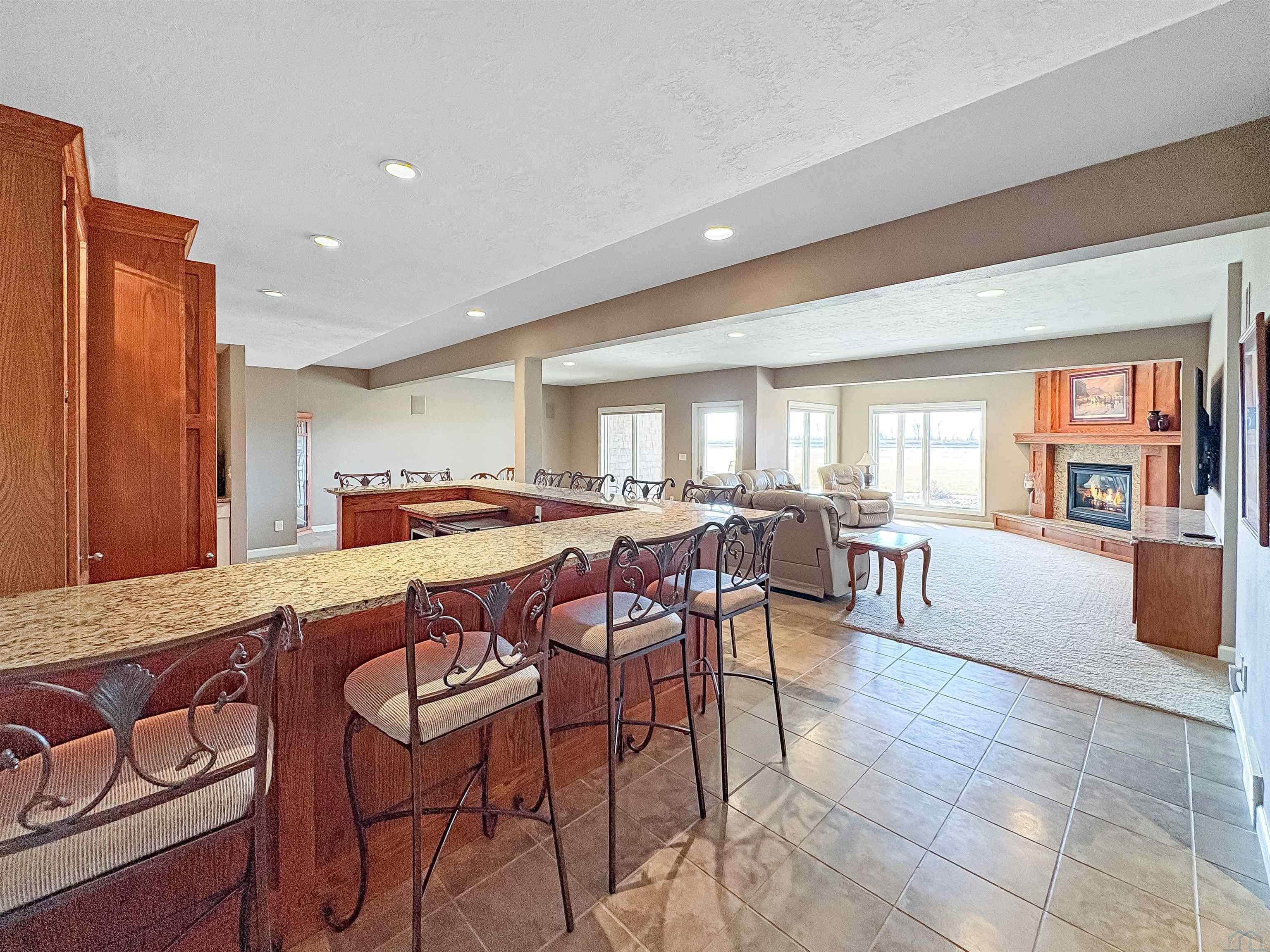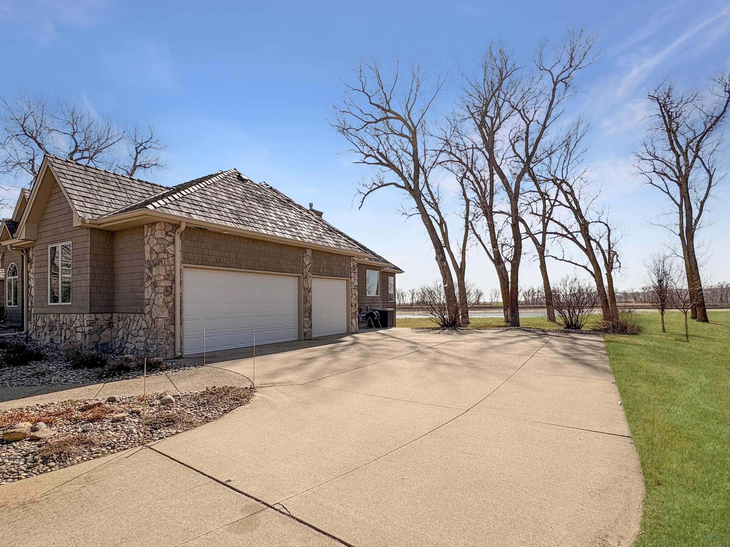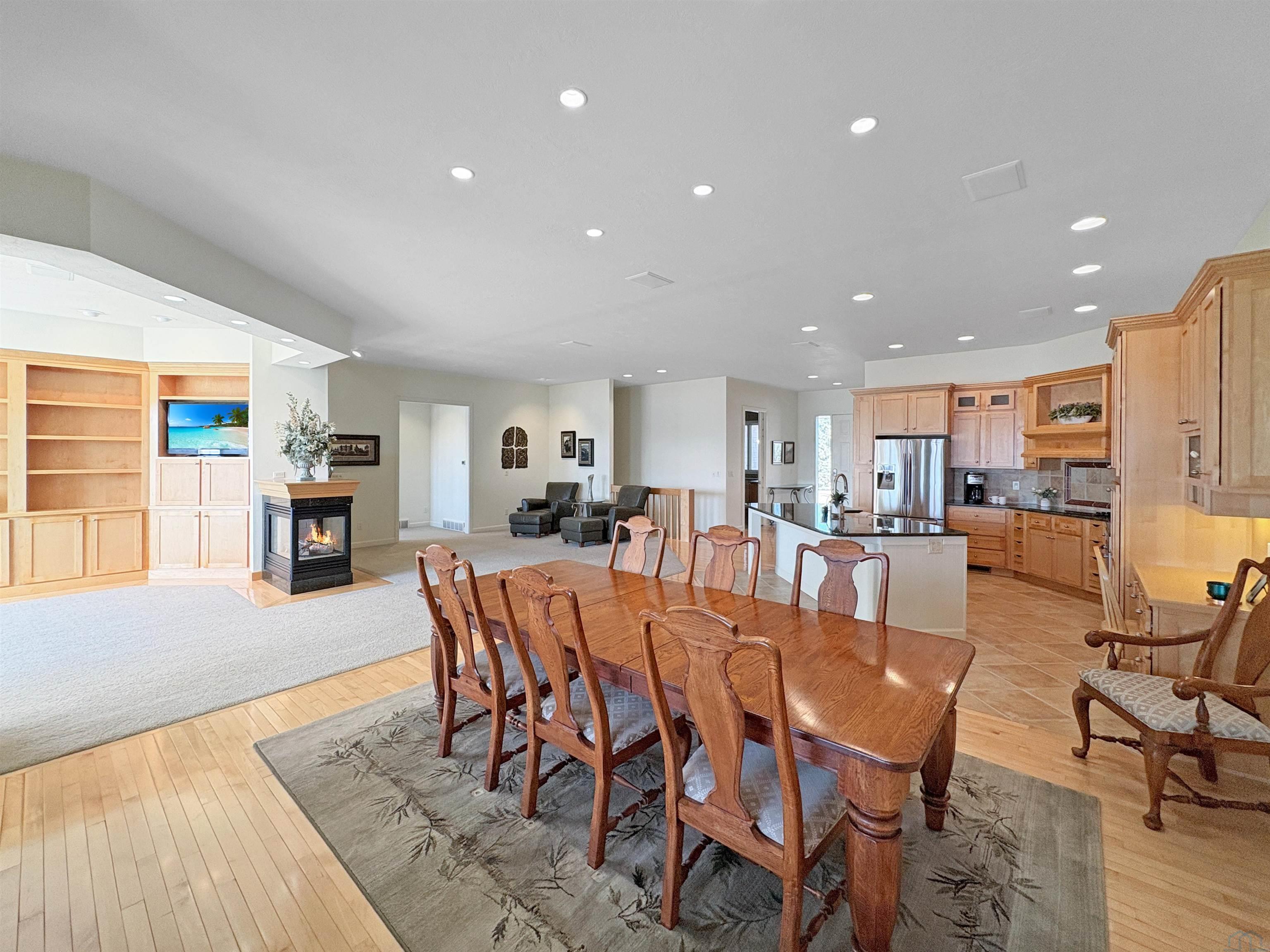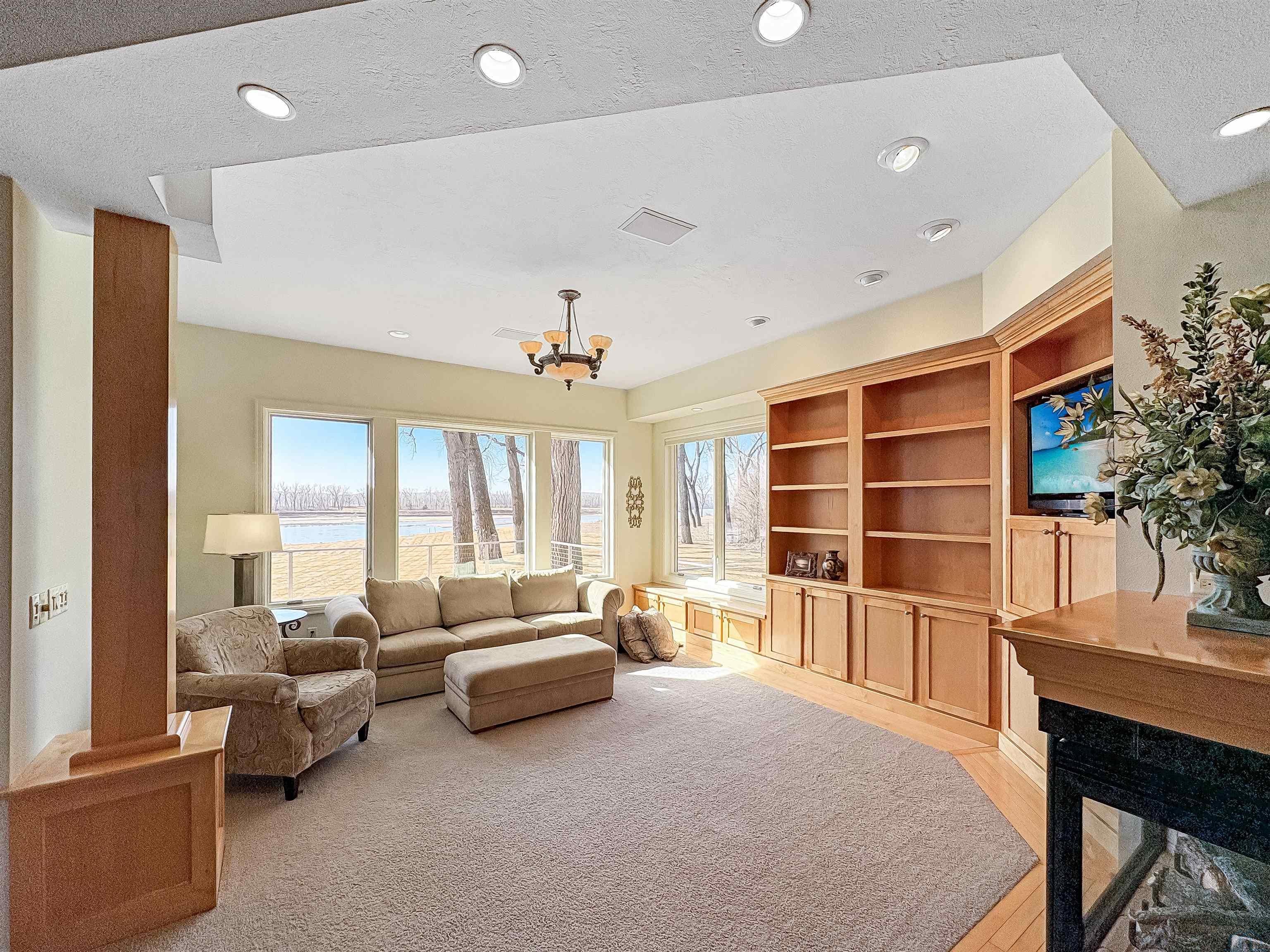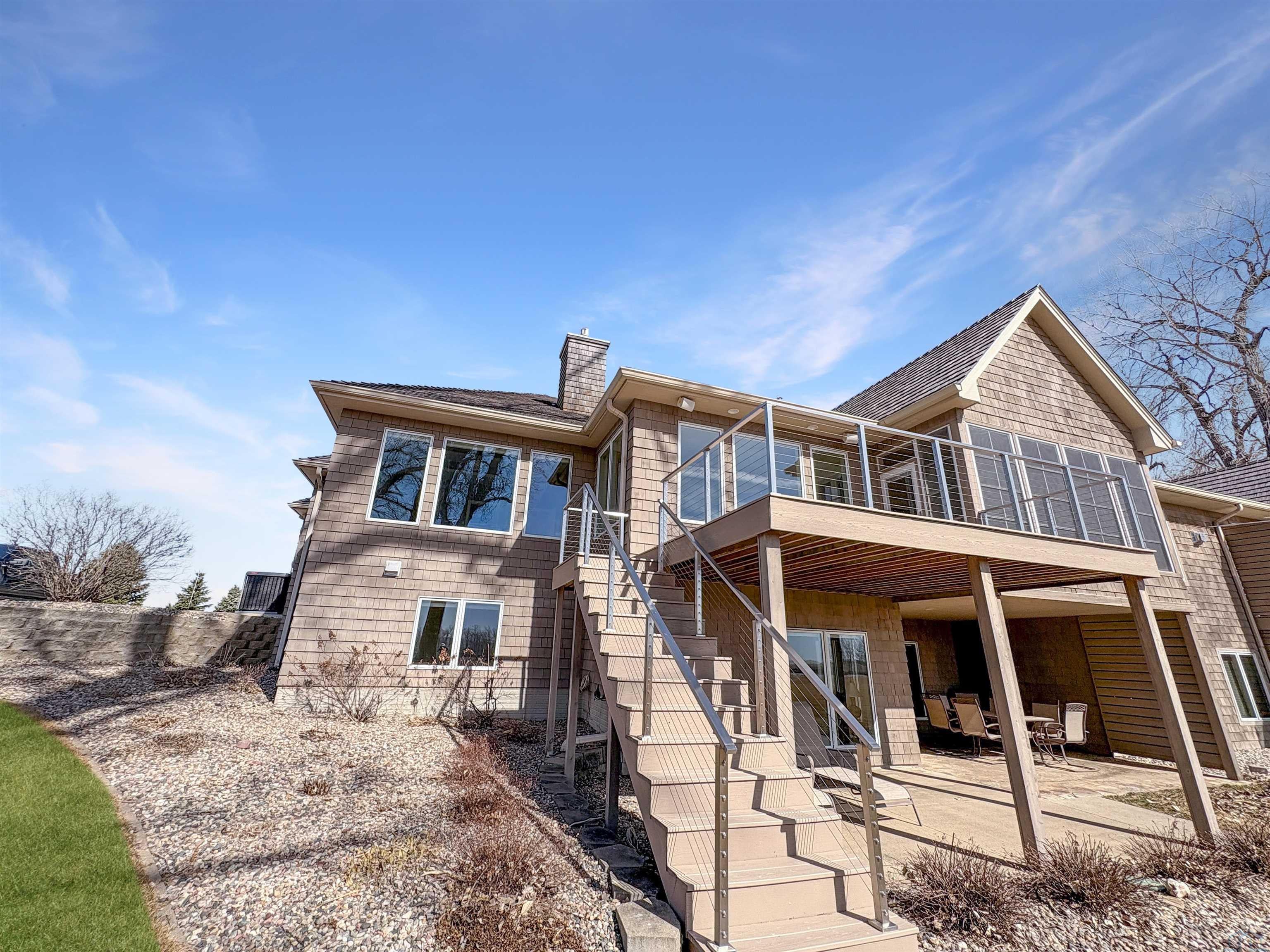 Fantastic opportunity to own a riverfront property in Wynstone! This townhome design is impressive throughout. It is a rare private setting on 1.35 acres, over 2500 Sq Ft on the main floor plus a fully finished basement. A large foyer with hardwoods introduces you to the home. Beautiful open concept space with 10ft ceilings and 8ft doors. Large kitchen with generous maple cabinetry, double ovens, granite tops, tile floor and an island with barstool space. The dining room has hardwood floors continued from the foyer and access to the Screenbuilders 4 season porch. The living room has a 3 sided gas fireplace, built-ins, art niches, and large windows to enjoy the view. The spacious primary suite is situated in the back corner of the property. Large windows allowing natural light and a great view. The full master bath has a jet tub, shower, 2 sinks, an additional vanity plus a large walk in closet. Bedroom 2, currently used as an office, is at the front of the home. The hallway bath with a shower is near the bedroom and off the entryway. A tiled mud room off the garage is set up for main floor laundry with laundry chute, many cabinets and a large pantry. The fully finished basement has a wide open family room with the 2nd gas fireplace in the TV area, additional room for a game table and more. Amazing wet bar to accommodate 10-12 barstools has beverage fridges, dishwasher, sink and a full fridge. Display your liquor and wine beautifully; additional wine display room too! Bedrooms 3 and 4, with egress, plus a full bath on one side of the lower level. Convenient laundry room and powder room near the entertaining space. An additional 10x15 den space and storage room with utilities. Bluetooth speakers zoned throughout. The exterior is meticulously landscaped and fully sprinklered. Shake siding, composite deck with cable railing, flagstone patio at the basement walkout and a 50yr BRAVA roof was installed 2025! An amazing mix of purposeful design and privacy.