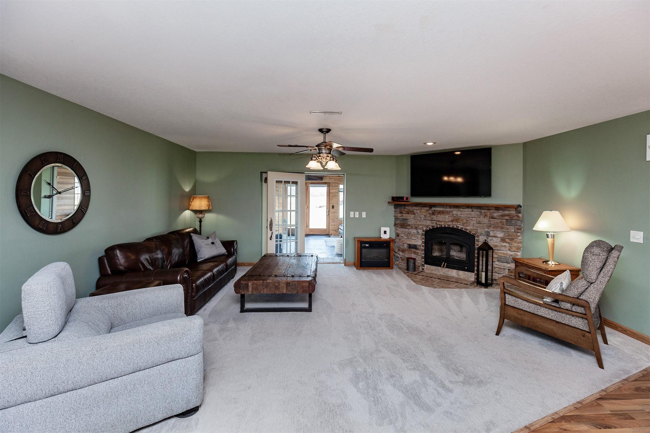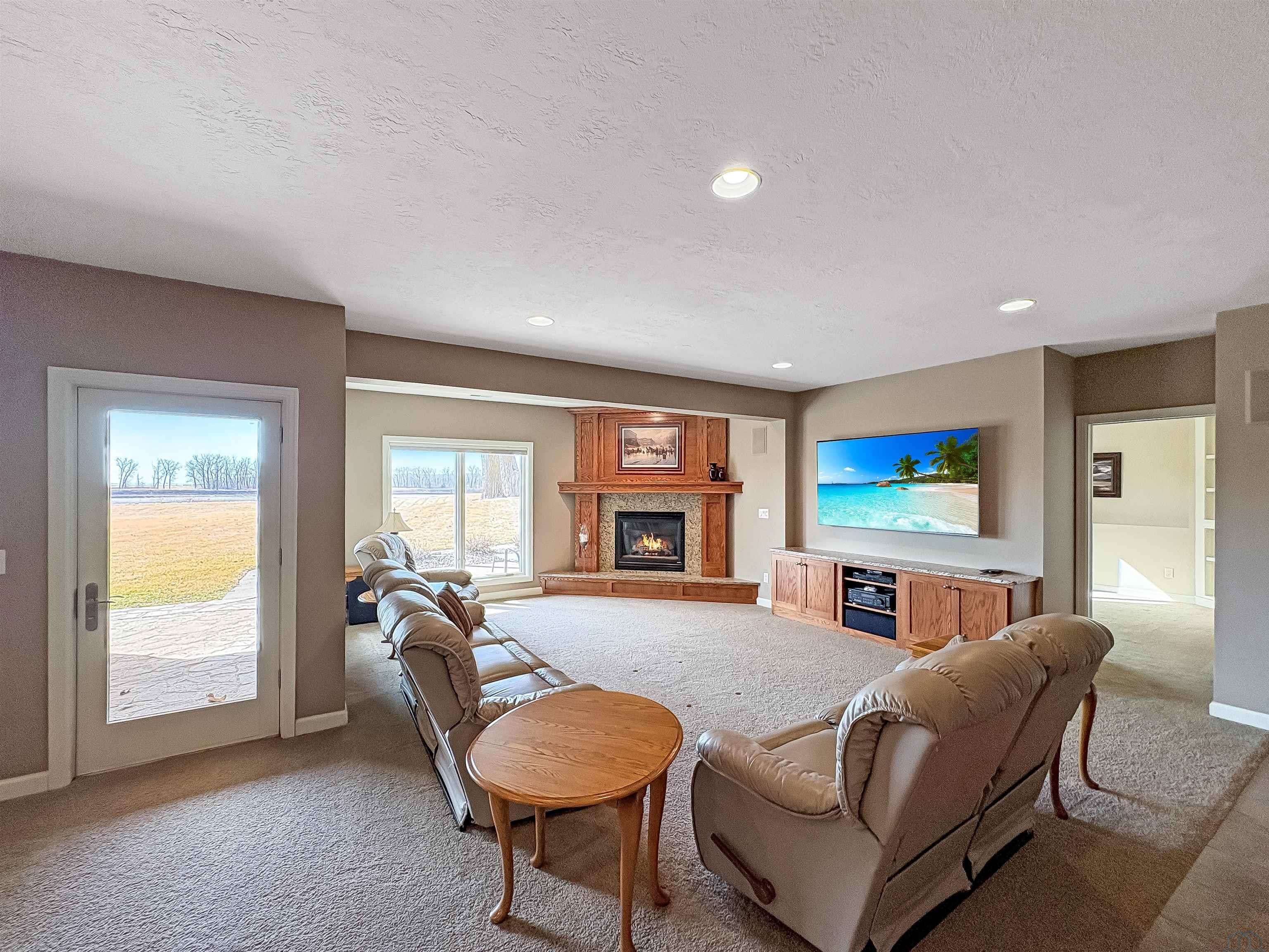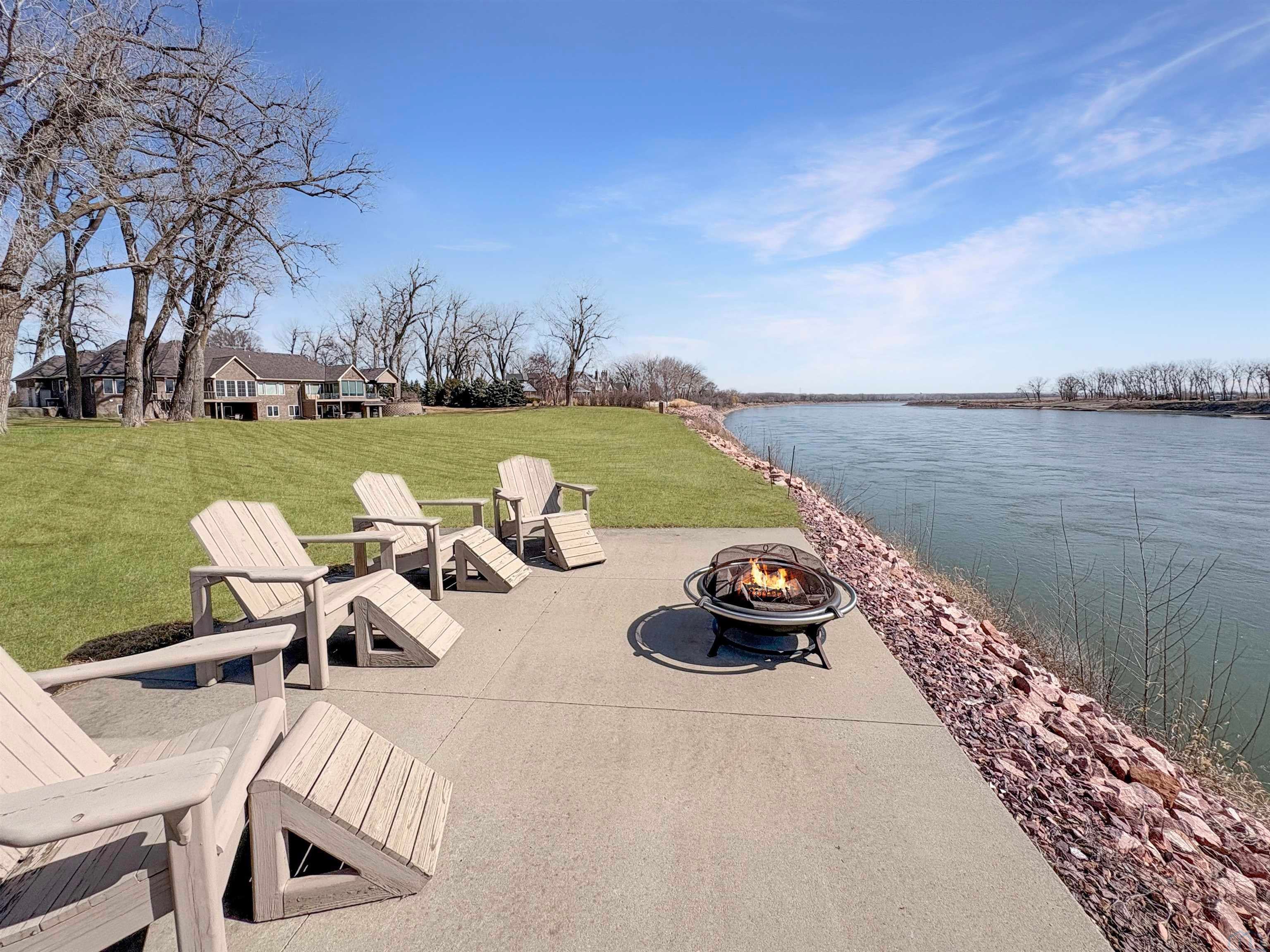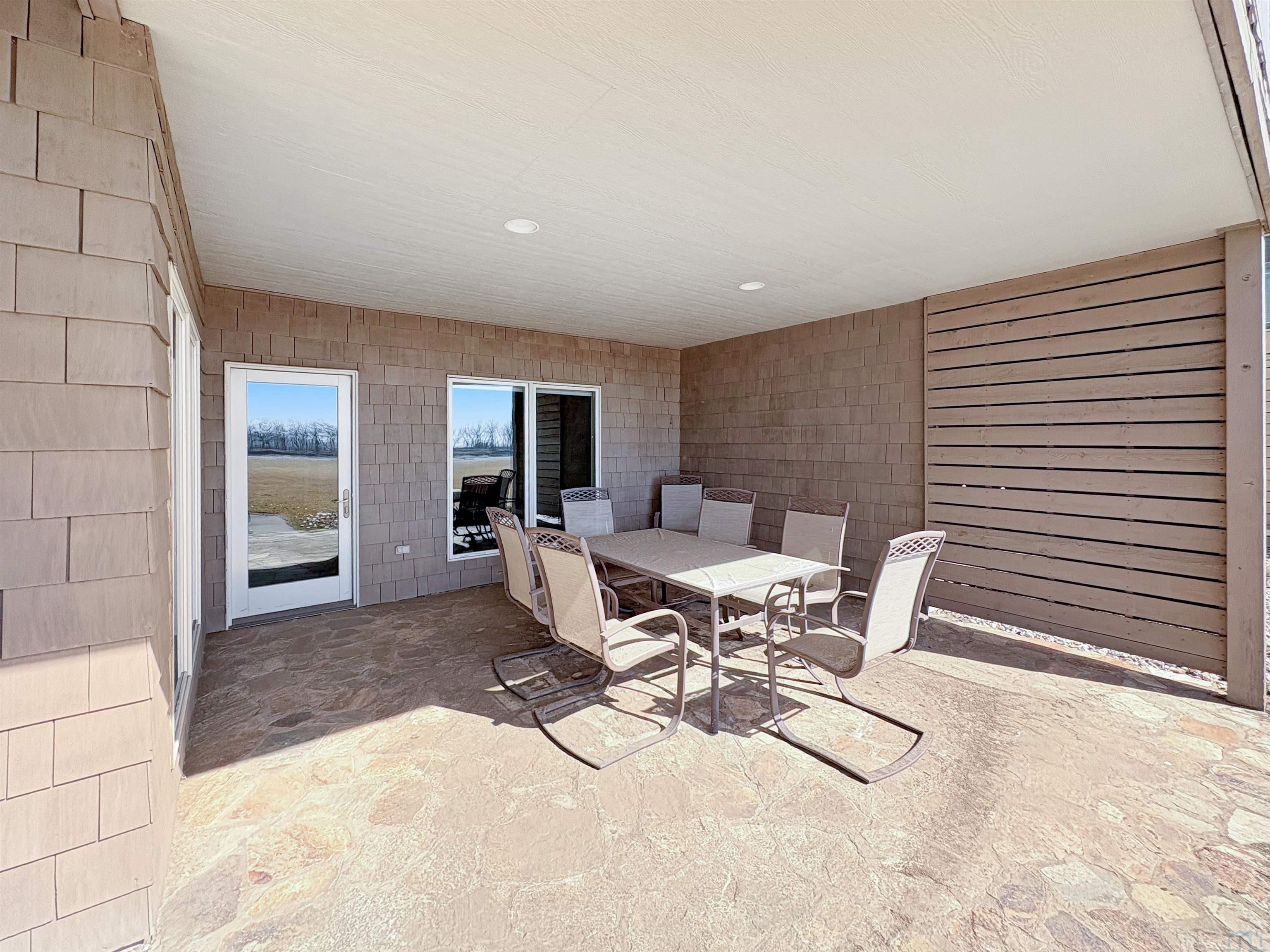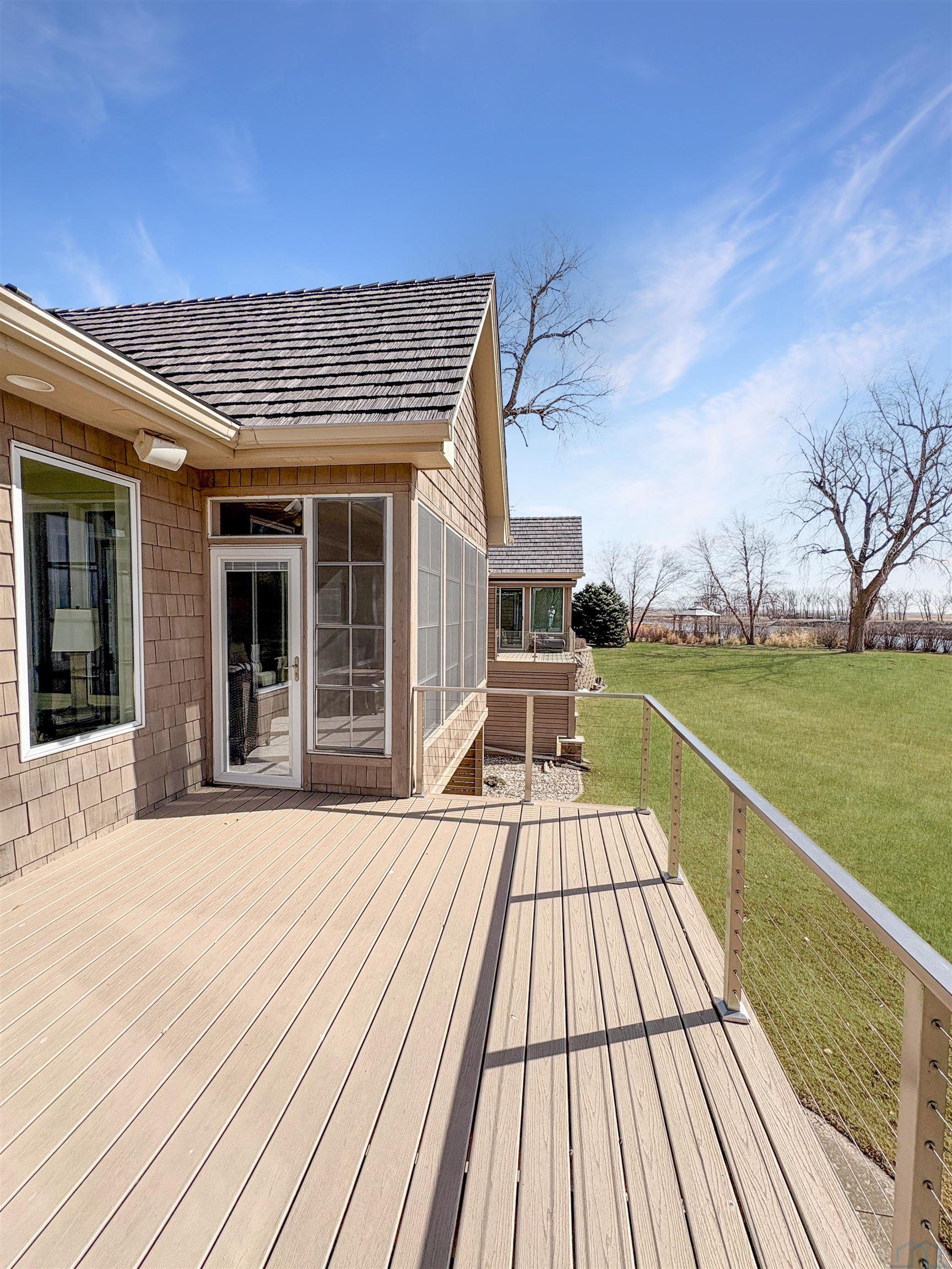 Fantastic opportunity to own a riverfront property in Wynstone! This townhome design is impressive throughout. It is a rare private setting on 1.35 acres, over 2500 Sq Ft on the main floor plus a fully finished basement. A large foyer with hardwoods introduces you to the home. Beautiful open concept space with 10ft ceilings and 8ft doors. Large kitchen with generous maple cabinetry, double ovens, granite tops, tile floor and an island with barstool space. The dining room has hardwood floors continued from the foyer and access to the Screenbuilders 4 season porch. The living room has a 3 sided gas fireplace, built-ins, art niches, and large windows to enjoy the view. The spacious primary suite is situated in the back corner of the property. Large windows allowing natural light and a great view. The full master bath has a jet tub, shower, 2 sinks, an additional vanity plus a large walk in closet. Bedroom 2, currently used as an office, is at the front of the home. The hallway bath with a shower is near the bedroom and off the entryway. A tiled mud room off the garage is set up for main floor laundry with laundry chute, many cabinets and a large pantry. The fully finished basement has a wide open family room with the 2nd gas fireplace in the TV area, additional room for a game table and more. Amazing wet bar to accommodate 10-12 barstools has beverage fridges, dishwasher, sink and a full fridge. Display your liquor and wine beautifully; additional wine display room too! Bedrooms 3 and 4, with egress, plus a full bath on one side of the lower level. Convenient laundry room and powder room near the entertaining space. An additional 10x15 den space and storage room with utilities. Bluetooth speakers zoned throughout. The exterior is meticulously landscaped and fully sprinklered. Shake siding, composite deck with cable railing, flagstone patio at the basement walkout and a 50yr BRAVA roof was installed 2025! An amazing mix of purposeful design and privacy.