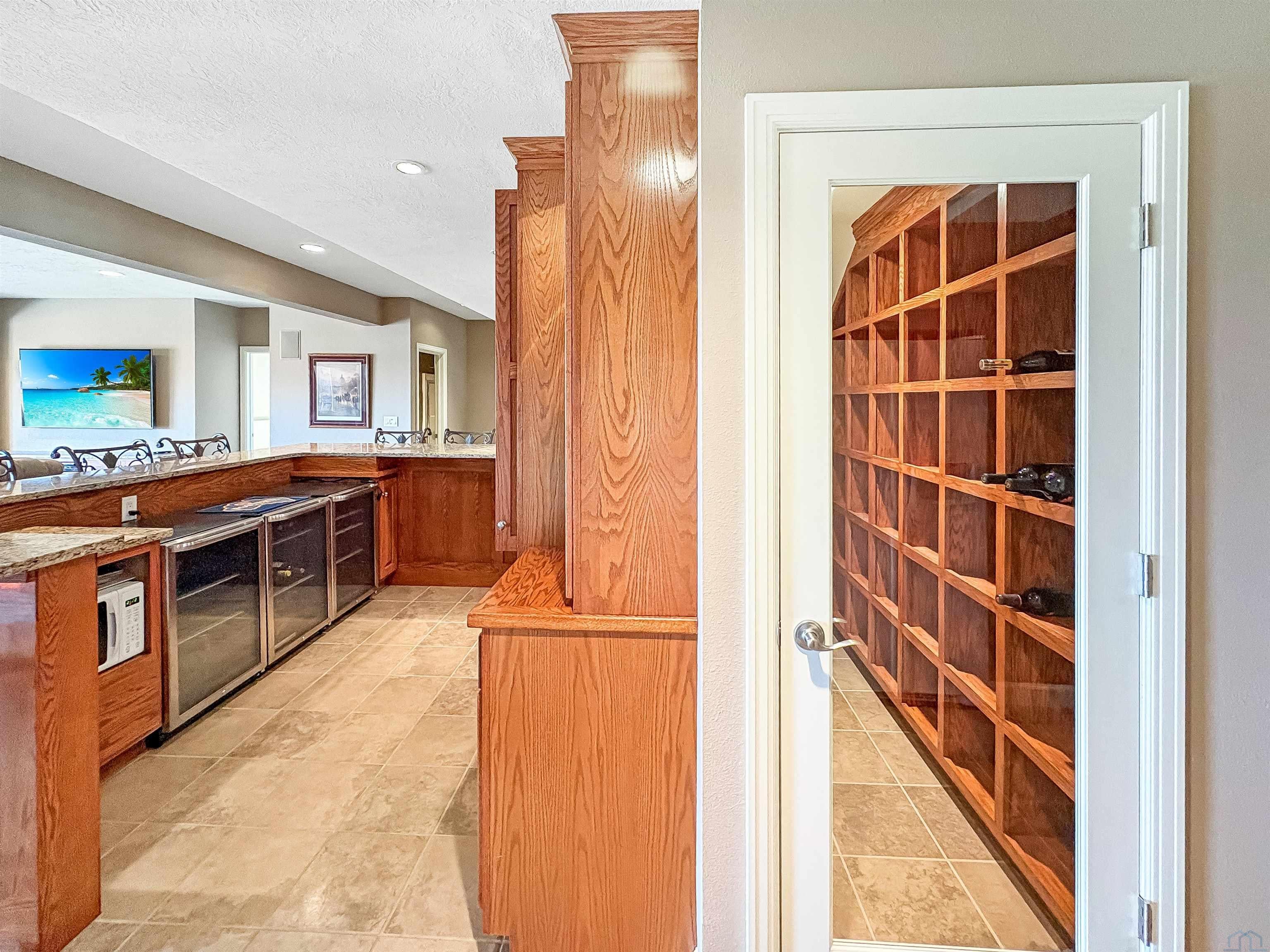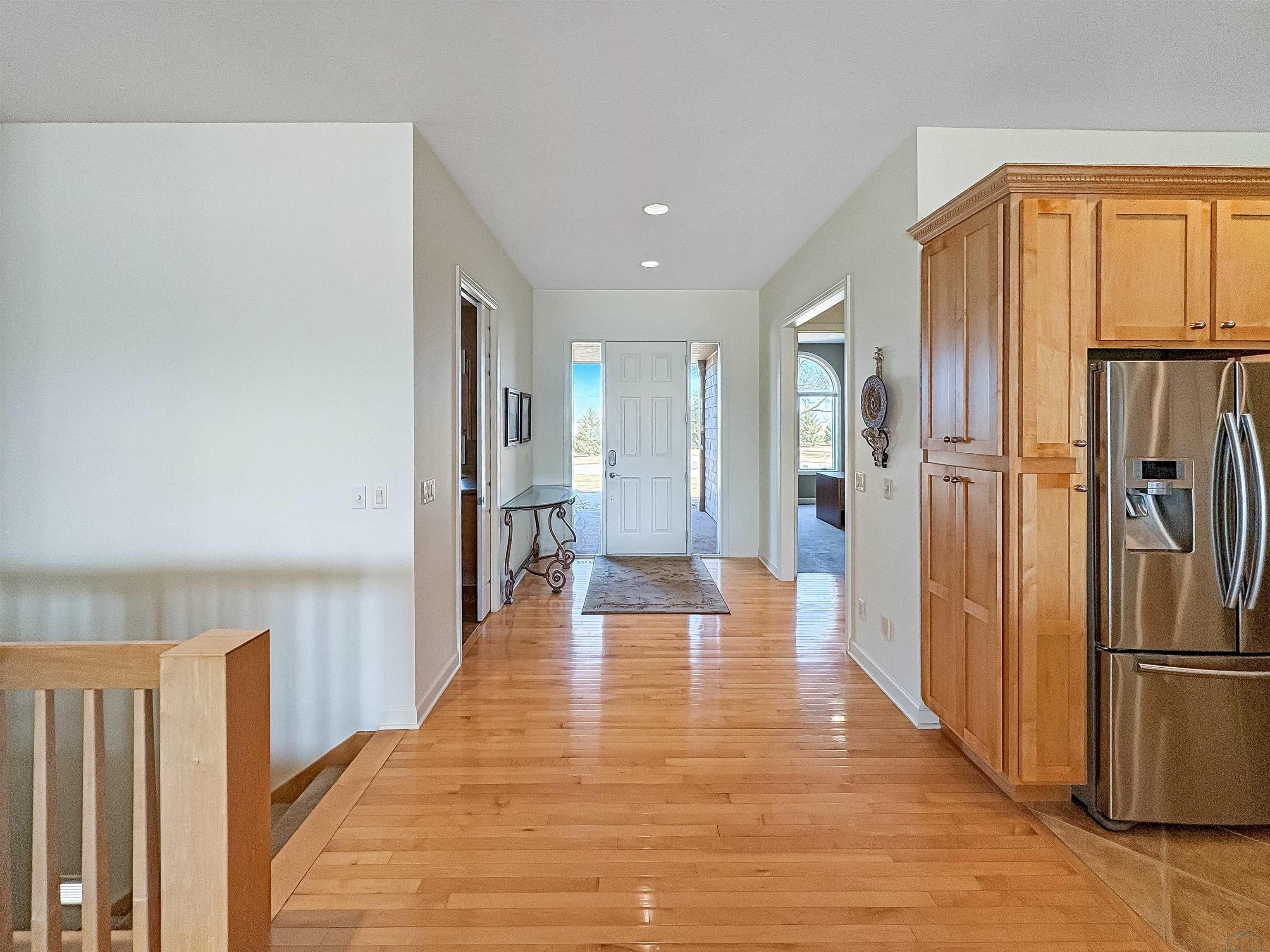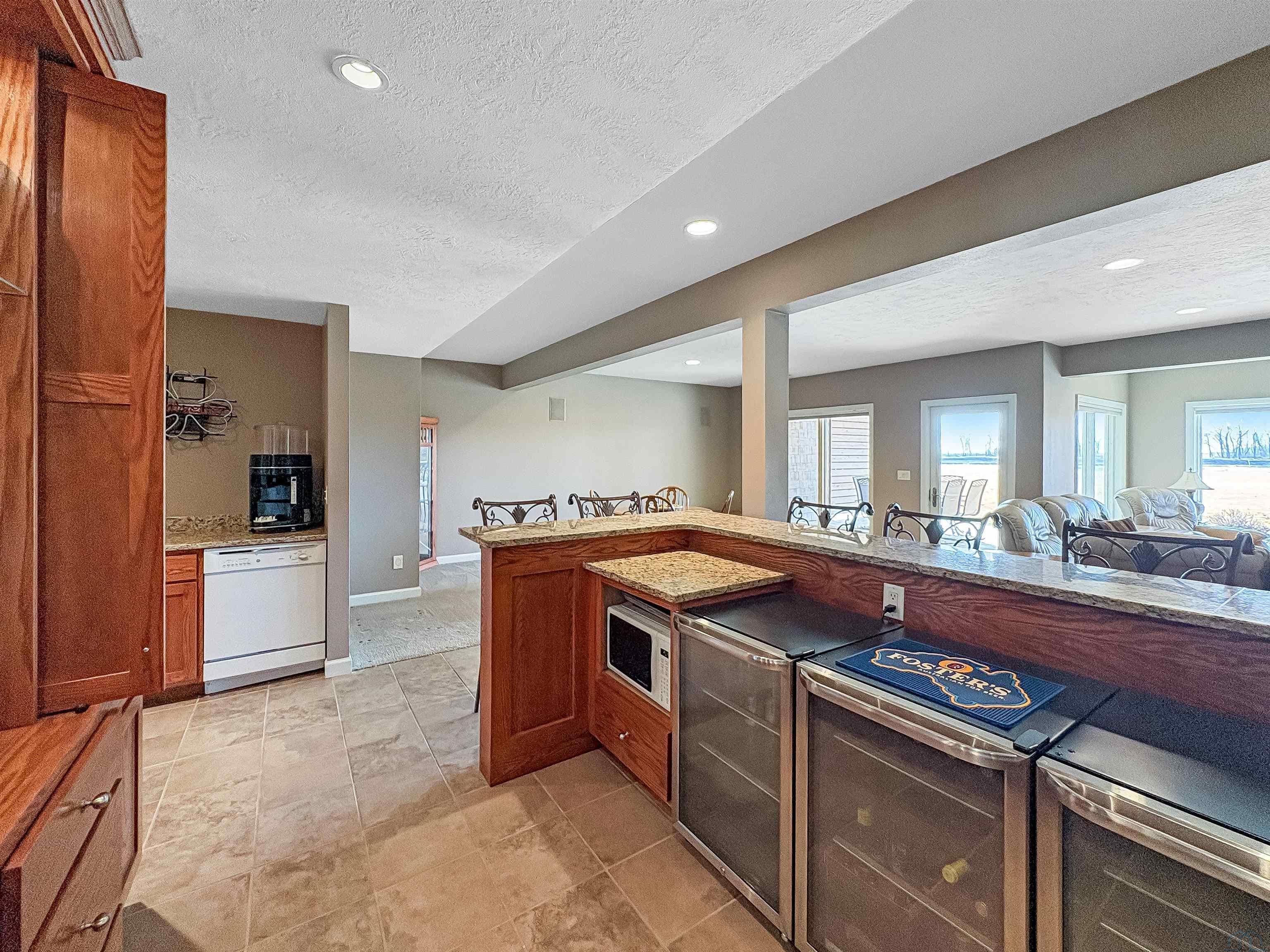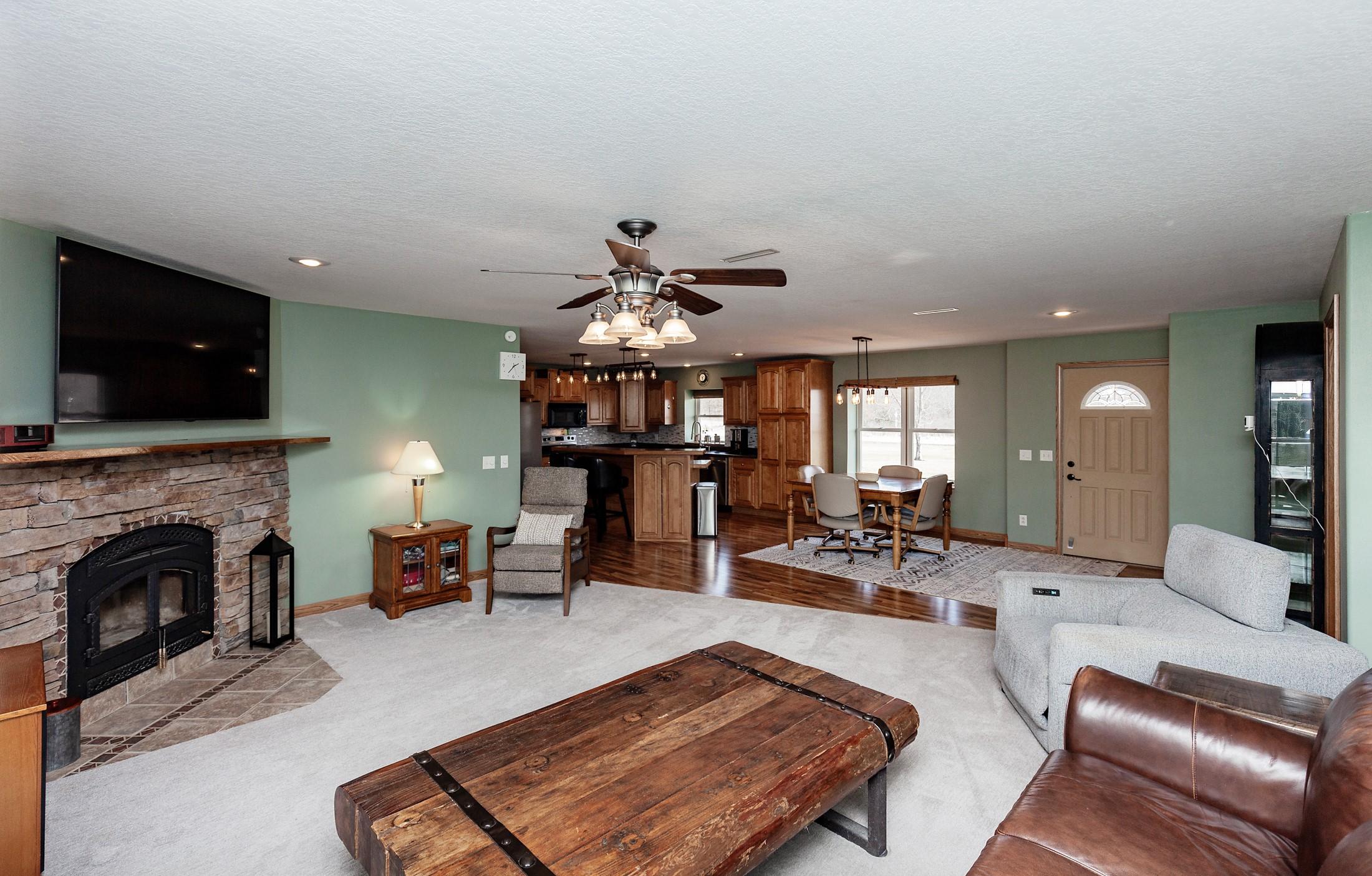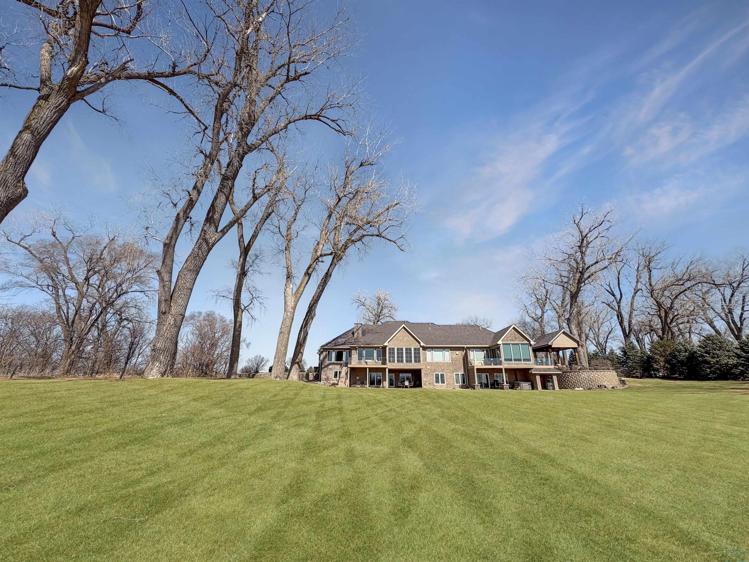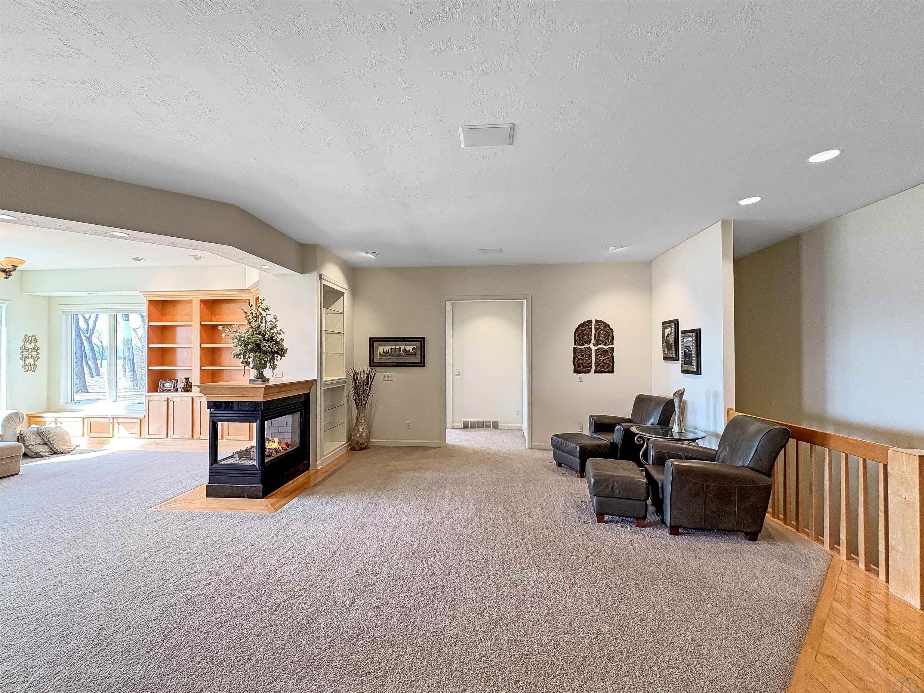 Fantastic opportunity to own a riverfront property in Wynstone! This townhome design is impressive throughout. It is a rare private setting on 1.35 acres, over 2500 Sq Ft on the main floor plus a fully finished basement. A large foyer with hardwoods introduces you to the home. Beautiful open concept space with 10ft ceilings and 8ft doors. Large kitchen with generous maple cabinetry, double ovens, granite tops, tile floor and an island with barstool space. The dining room has hardwood floors continued from the foyer and access to the Screenbuilders 4 season porch. The living room has a 3 sided gas fireplace, built-ins, art niches, and large windows to enjoy the view. The spacious primary suite is situated in the back corner of the property. Large windows allowing natural light and a great view. The full master bath has a jet tub, shower, 2 sinks, an additional vanity plus a large walk in closet. Bedroom 2, currently used as an office, is at the front of the home. The hallway bath with a shower is near the bedroom and off the entryway. A tiled mud room off the garage is set up for main floor laundry with laundry chute, many cabinets and a large pantry. The fully finished basement has a wide open family room with the 2nd gas fireplace in the TV area, additional room for a game table and more. Amazing wet bar to accommodate 10-12 barstools has beverage fridges, dishwasher, sink and a full fridge. Display your liquor and wine beautifully; additional wine display room too! Bedrooms 3 and 4, with egress, plus a full bath on one side of the lower level. Convenient laundry room and powder room near the entertaining space. An additional 10x15 den space and storage room with utilities. Bluetooth speakers zoned throughout. The exterior is meticulously landscaped and fully sprinklered. Shake siding, composite deck with cable railing, flagstone patio at the basement walkout and a 50yr BRAVA roof was installed 2025! An amazing mix of purposeful design and privacy.