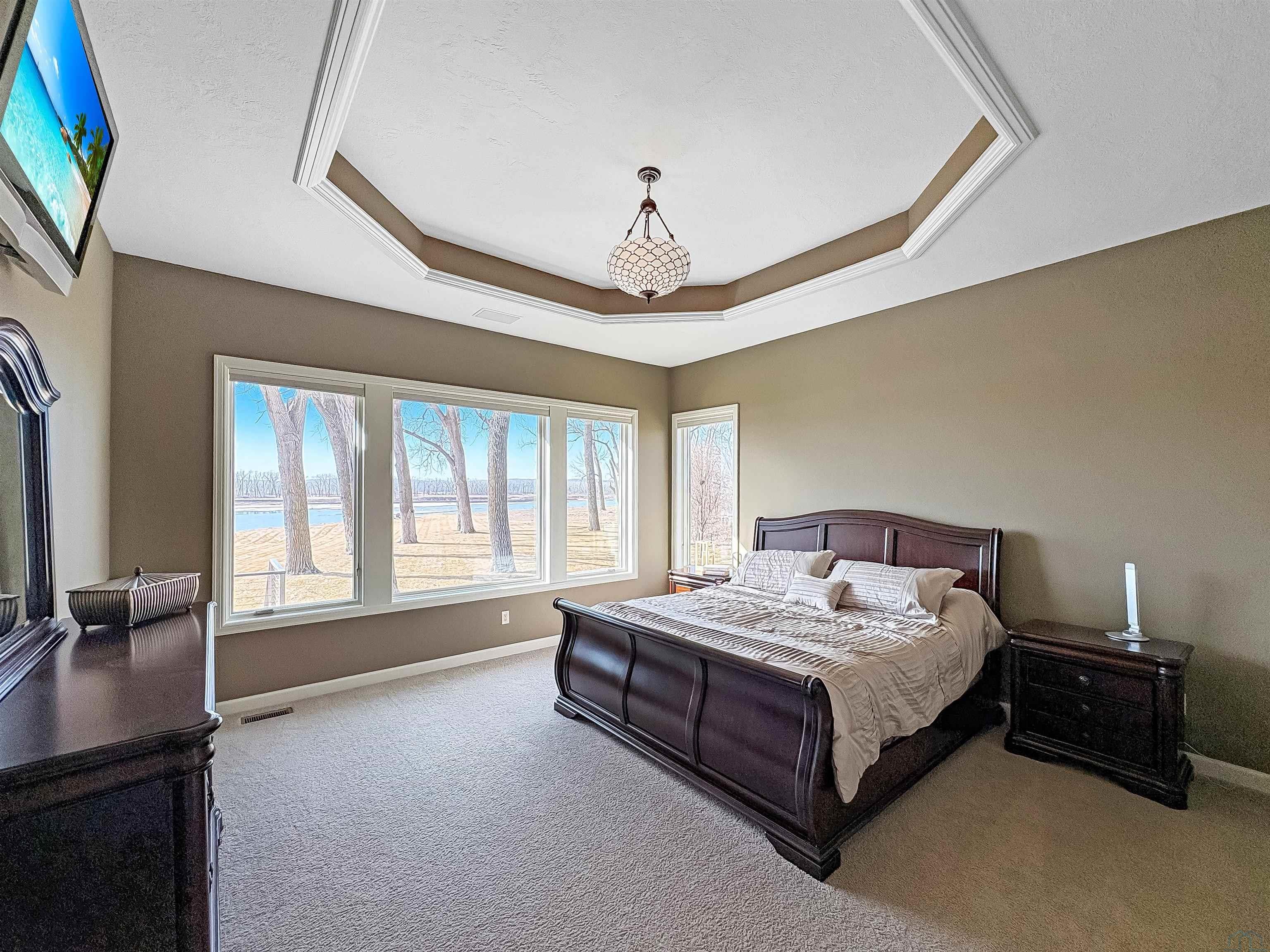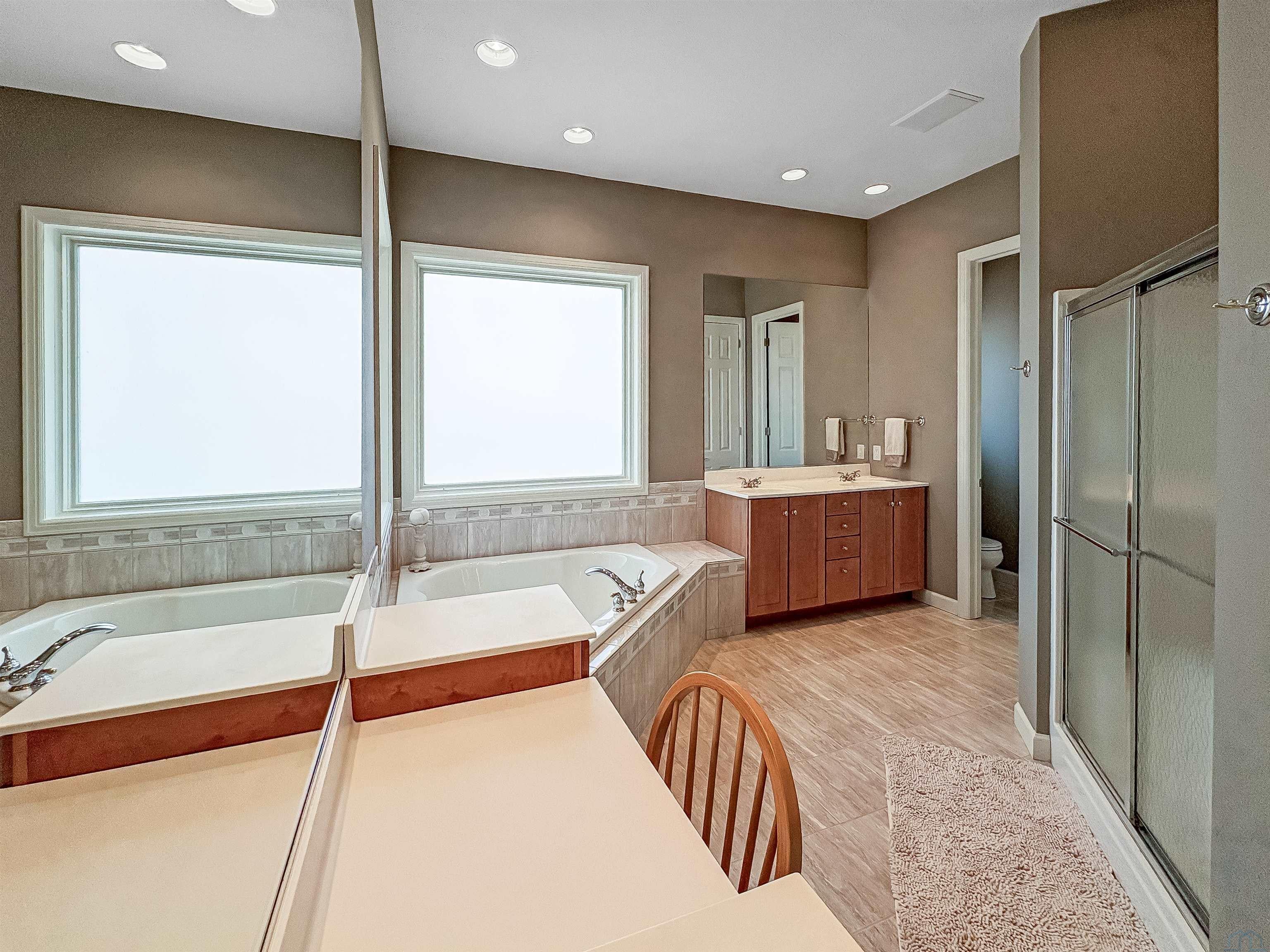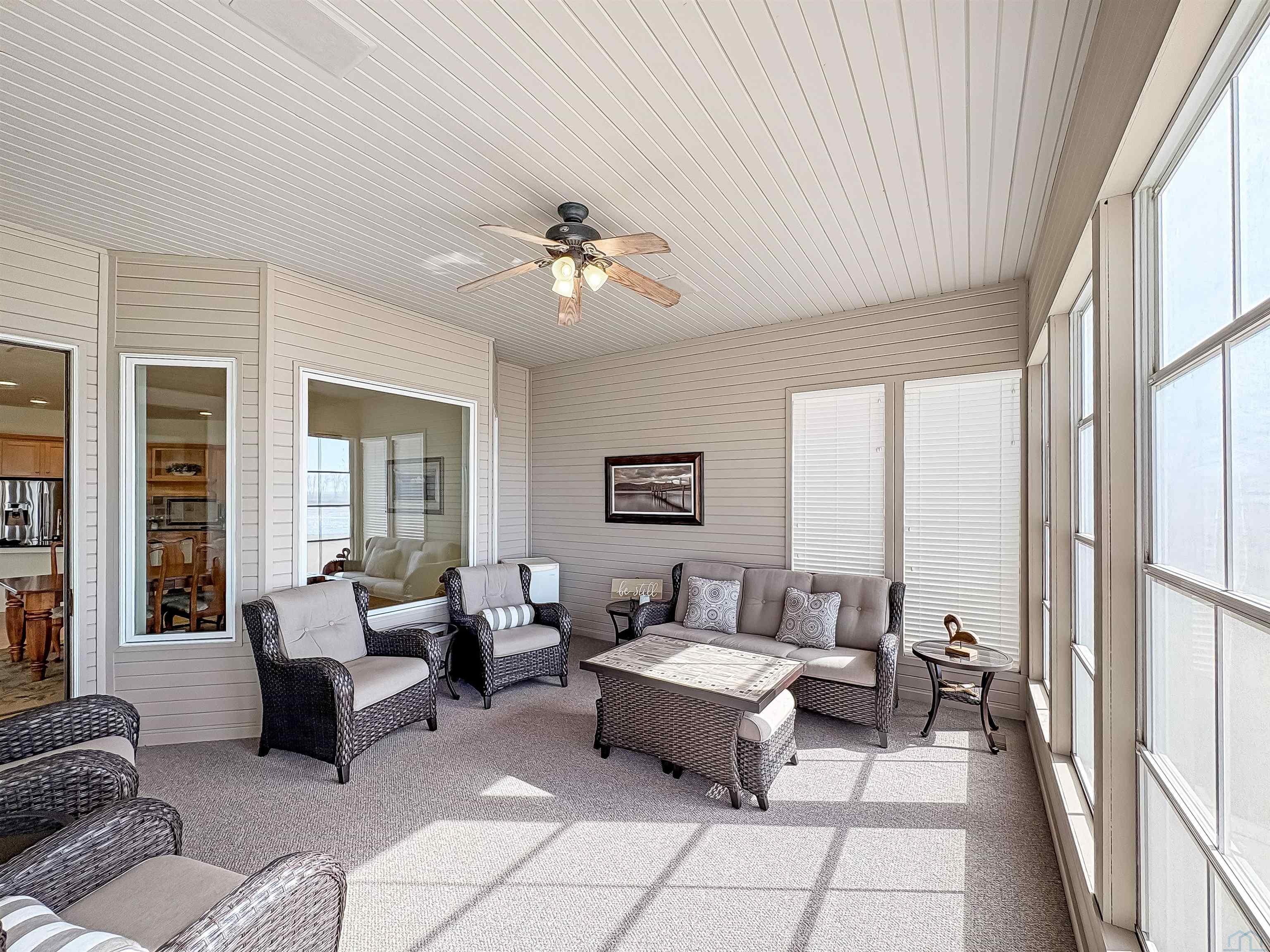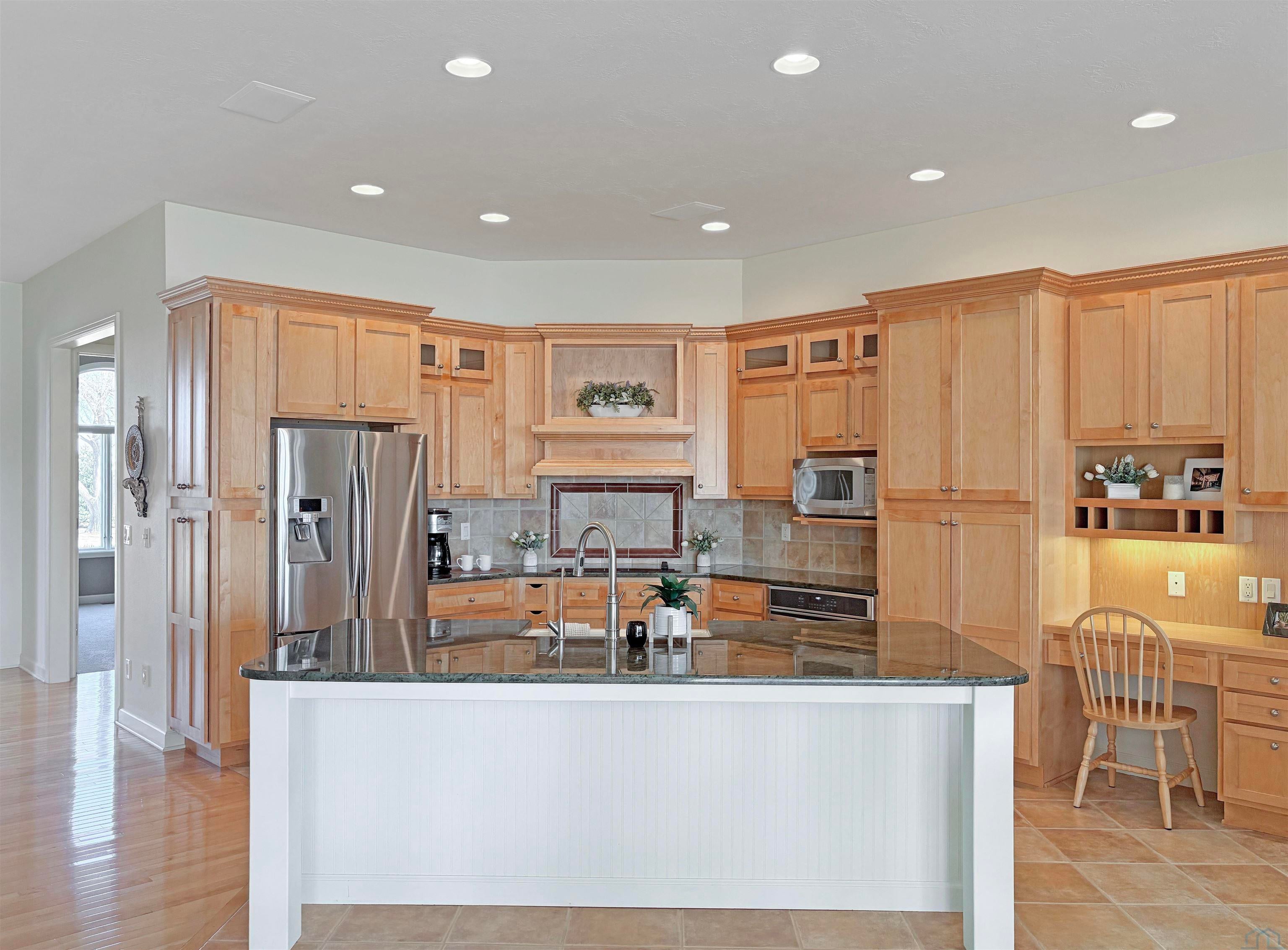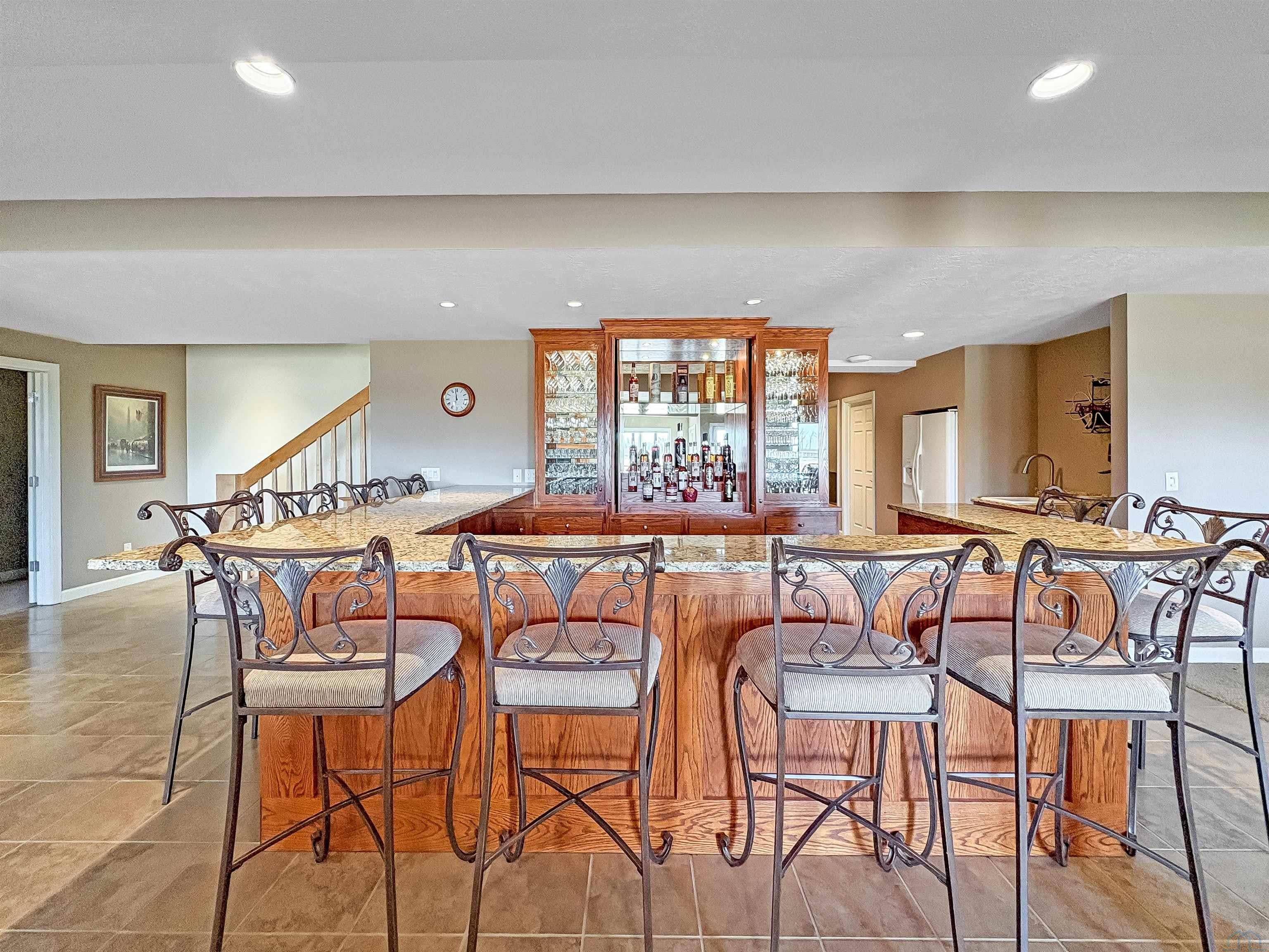 Fantastic opportunity to own a riverfront property in Wynstone! This townhome design is impressive throughout. It is a rare private setting on 1.35 acres, over 2500 Sq Ft on the main floor plus a fully finished basement. A large foyer with hardwoods introduces you to the home. Beautiful open concept space with 10ft ceilings and 8ft doors. Large kitchen with generous maple cabinetry, double ovens, granite tops, tile floor and an island with barstool space. The dining room has hardwood floors continued from the foyer and access to the Screenbuilders 4 season porch. The living room has a 3 sided gas fireplace, built-ins, art niches, and large windows to enjoy the view. The spacious primary suite is situated in the back corner of the property. Large windows allowing natural light and a great view. The full master bath has a jet tub, shower, 2 sinks, an additional vanity plus a large walk in closet. Bedroom 2, currently used as an office, is at the front of the home. The hallway bath with a shower is near the bedroom and off the entryway. A tiled mud room off the garage is set up for main floor laundry with laundry chute, many cabinets and a large pantry. The fully finished basement has a wide open family room with the 2nd gas fireplace in the TV area, additional room for a game table and more. Amazing wet bar to accommodate 10-12 barstools has beverage fridges, dishwasher, sink and a full fridge. Display your liquor and wine beautifully; additional wine display room too! Bedrooms 3 and 4, with egress, plus a full bath on one side of the lower level. Convenient laundry room and powder room near the entertaining space. An additional 10x15 den space and storage room with utilities. Bluetooth speakers zoned throughout. The exterior is meticulously landscaped and fully sprinklered. Shake siding, composite deck with cable railing, flagstone patio at the basement walkout and a 50yr BRAVA roof was installed 2025! An amazing mix of purposeful design and privacy.