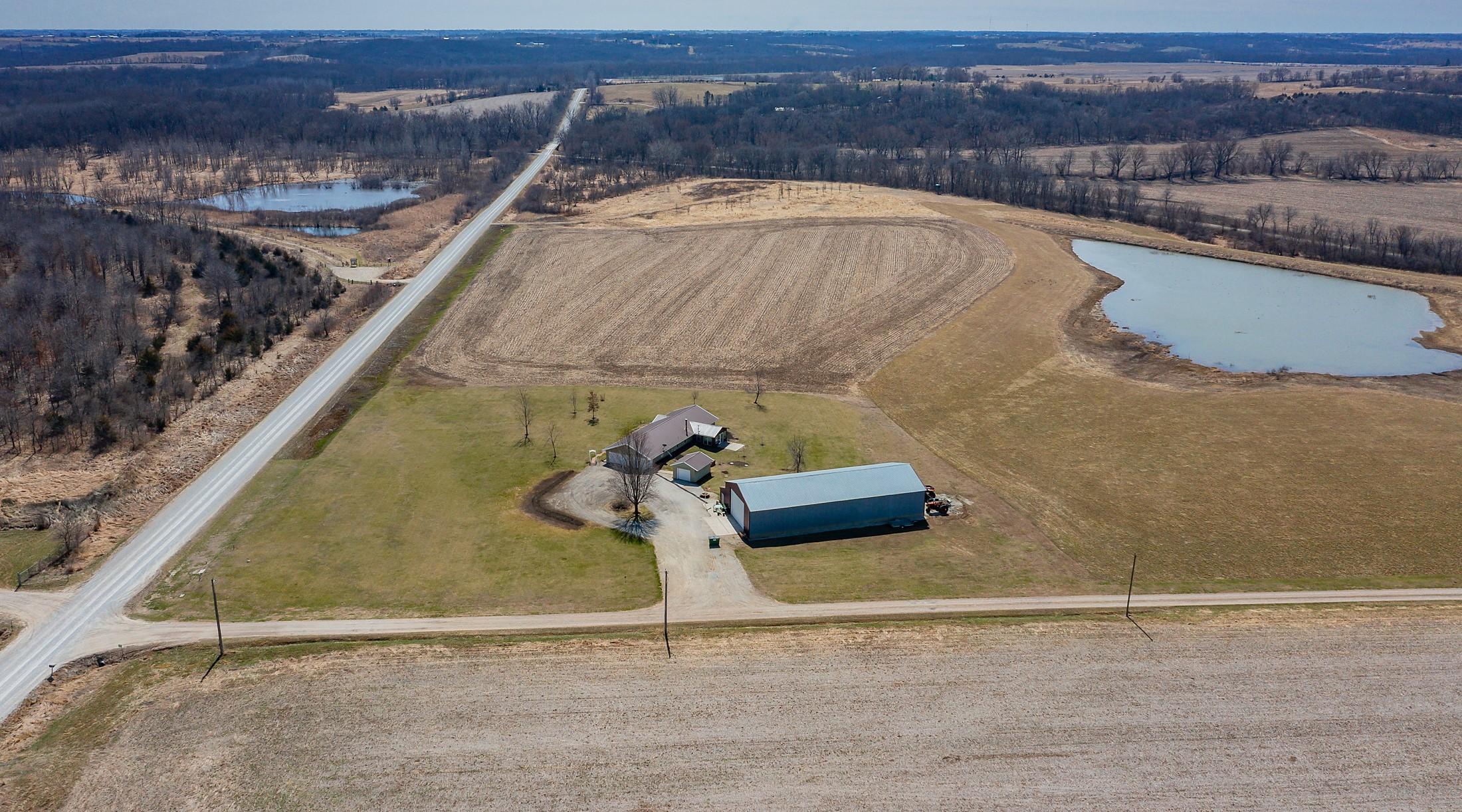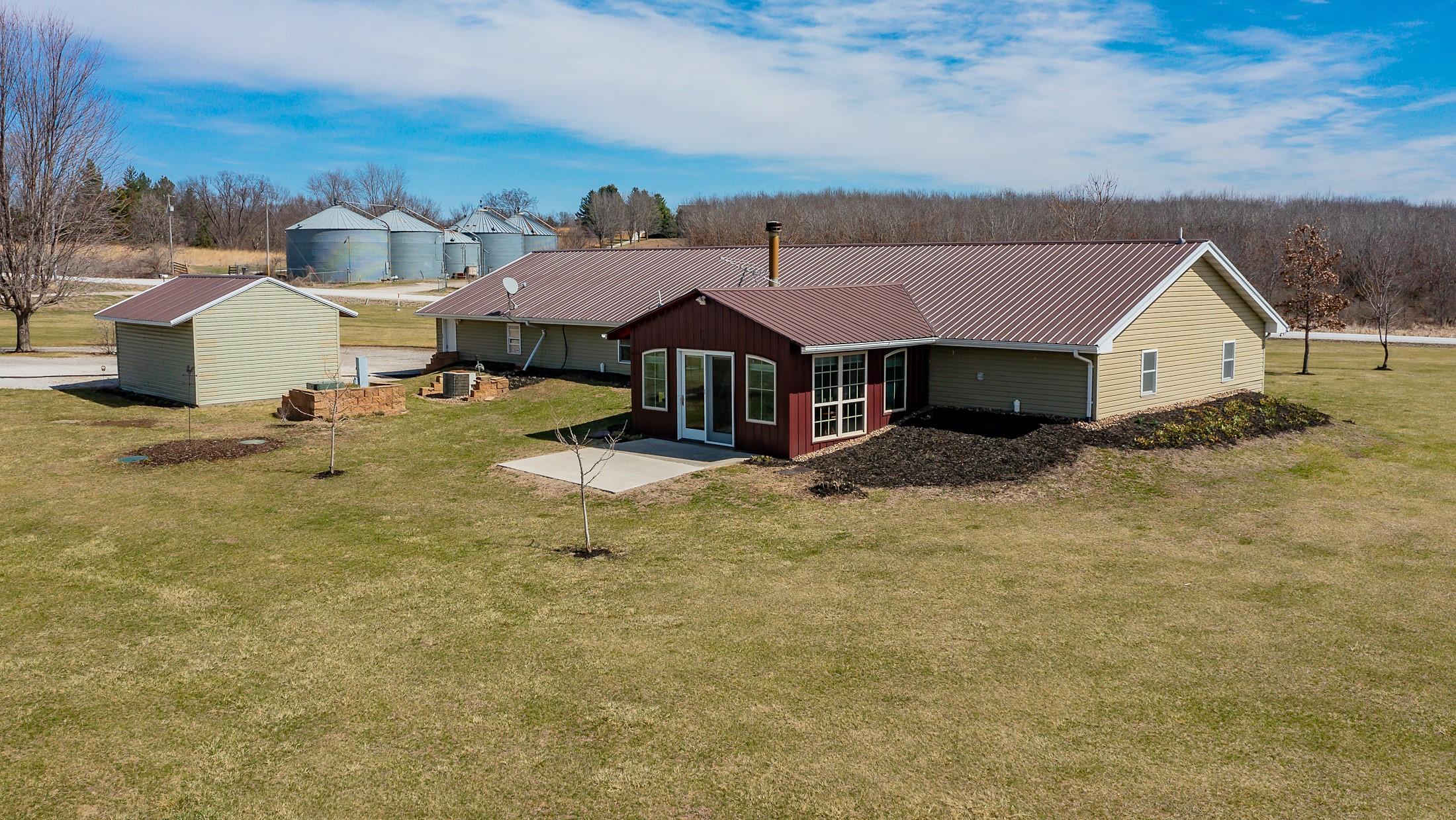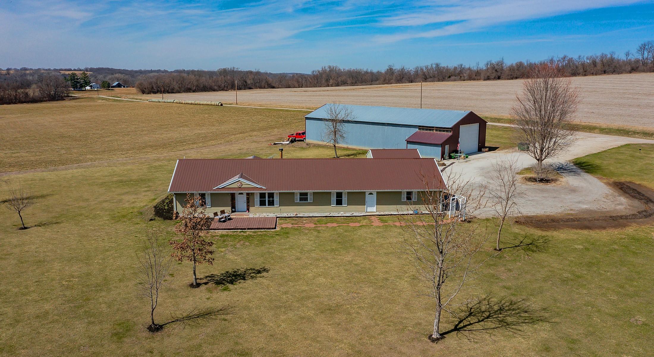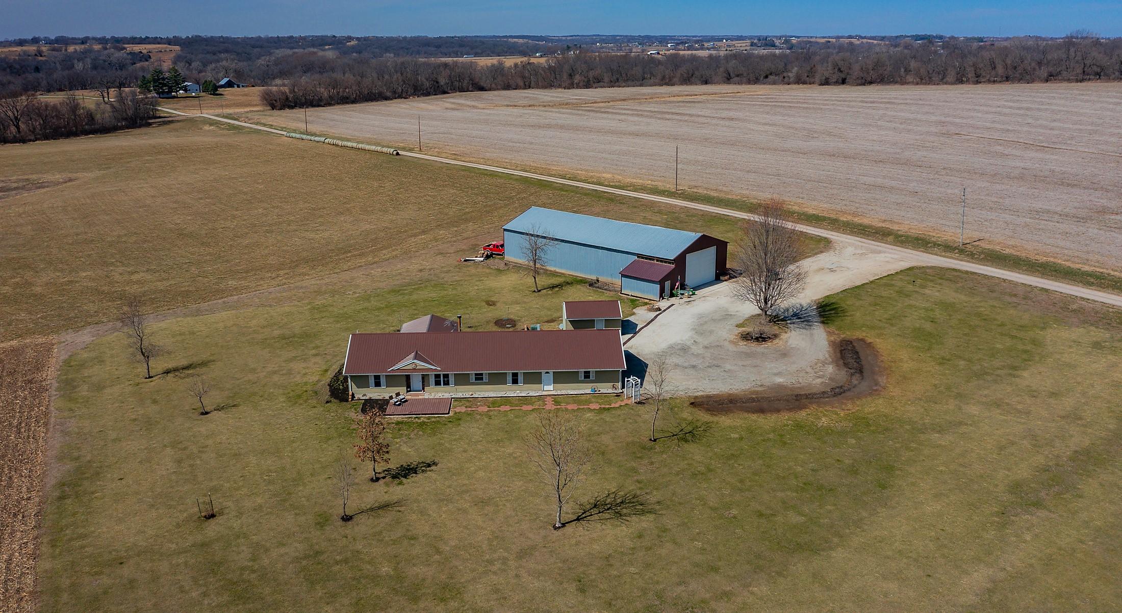 Acreage with approx 7 acres of land backing to the Great Western Bike Trail just south of Cumming (with approx 4 acres tillable if desired). Built in 2007, this thoughtfully constructed 3-bedroom, 2-bath ranch offers true easy living with exceptional durability and efficiency. Featuring 12-inch concrete walls with foam insulation, the home was designed for strength and long-term performance. Radiant in-floor heat runs throughout, providing consistent comfort, complemented by a high-efficiency wood-burning fireplace for added warmth and ambiance. Bonus 2 season sunroom facing west with a pond view. The open floor plan includes alderwood soft-close cabinetry, updated slate appliances, breakfast bar seating, dedicated dining space, and a primary suite with walk-in closet and laundry access. What youll also love? A 40x100 out-building includes an office and bathroom, with radiant floor heat in half the building. This amazing out-building can accommodate a business, motorhomes, tractors, full gym, landscaping vehicles/equipment or endless possibilities! The homes attached 3-car garage plus an insulated 1-car detached garage complete this exceptional acreage! Only a 15 min drive to Mills Civic Pkwy, come work, live and play (bike!) just beyond the Cumming exit on I35 - but with the privacy and space of an acreage!