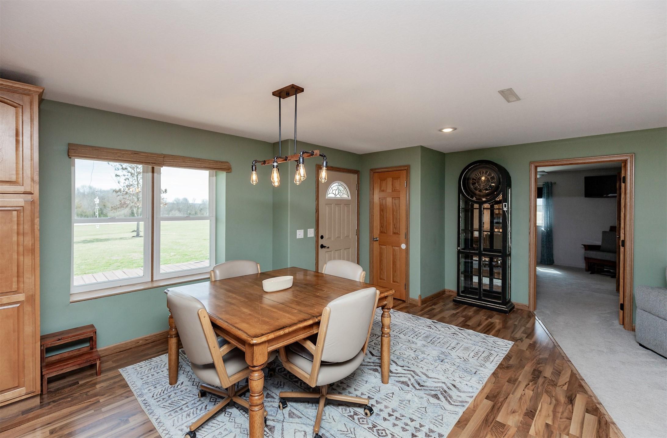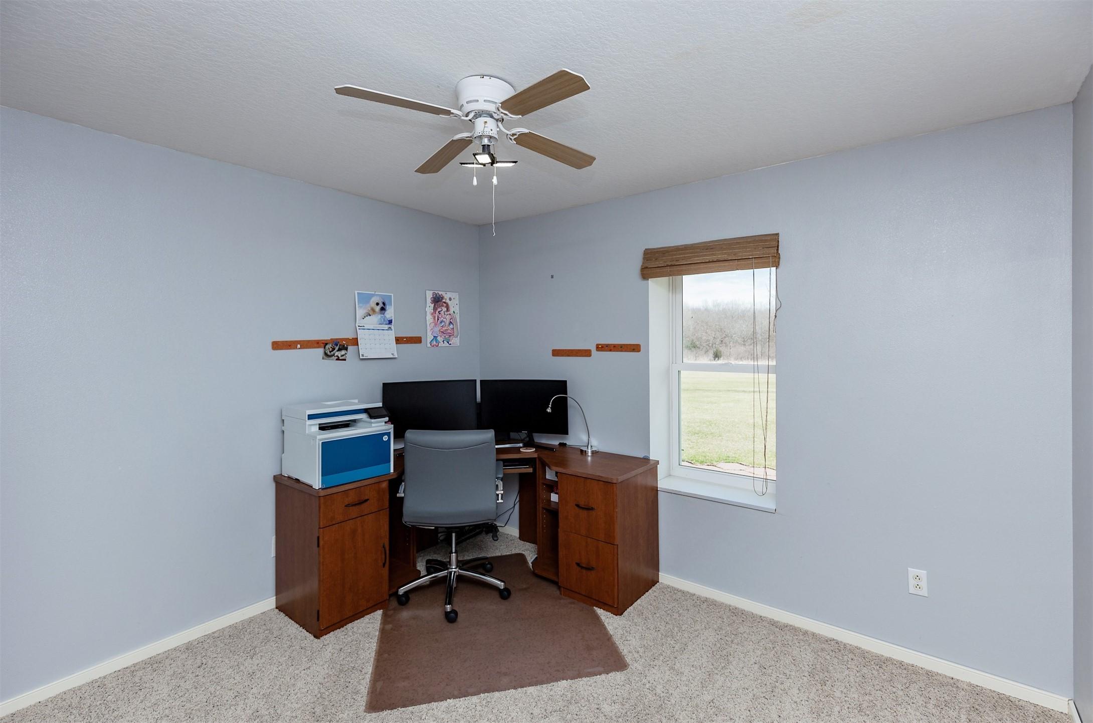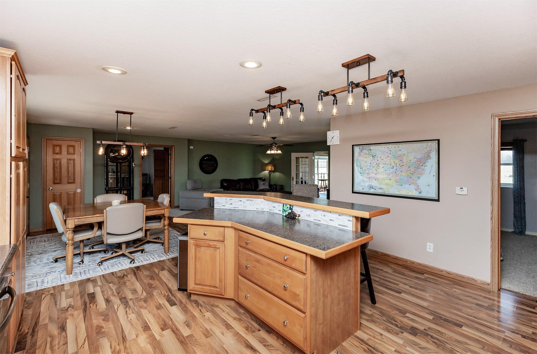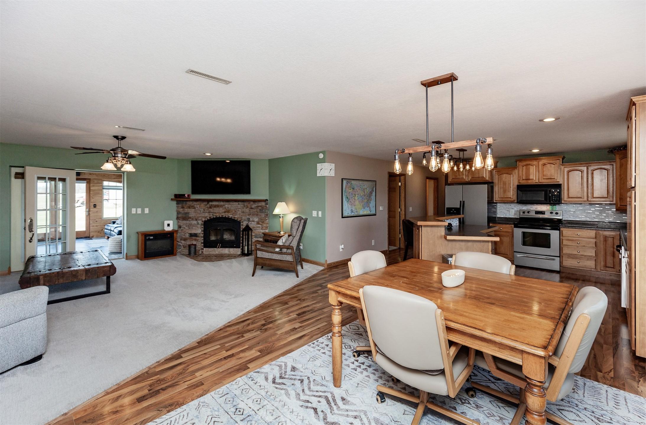 Acreage with approx 7 acres of land backing to the Great Western Bike Trail just south of Cumming (with approx 4 acres tillable if desired). Built in 2007, this thoughtfully constructed 3-bedroom, 2-bath ranch offers true easy living with exceptional durability and efficiency. Featuring 12-inch concrete walls with foam insulation, the home was designed for strength and long-term performance. Radiant in-floor heat runs throughout, providing consistent comfort, complemented by a high-efficiency wood-burning fireplace for added warmth and ambiance. Bonus 2 season sunroom facing west with a pond view. The open floor plan includes alderwood soft-close cabinetry, updated slate appliances, breakfast bar seating, dedicated dining space, and a primary suite with walk-in closet and laundry access. What youll also love? A 40x100 out-building includes an office and bathroom, with radiant floor heat in half the building. This amazing out-building can accommodate a business, motorhomes, tractors, full gym, landscaping vehicles/equipment or endless possibilities! The homes attached 3-car garage plus an insulated 1-car detached garage complete this exceptional acreage! Only a 15 min drive to Mills Civic Pkwy, come work, live and play (bike!) just beyond the Cumming exit on I35 - but with the privacy and space of an acreage!