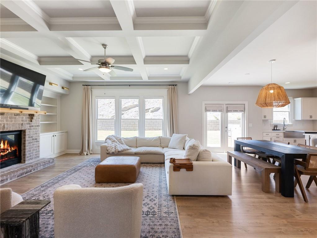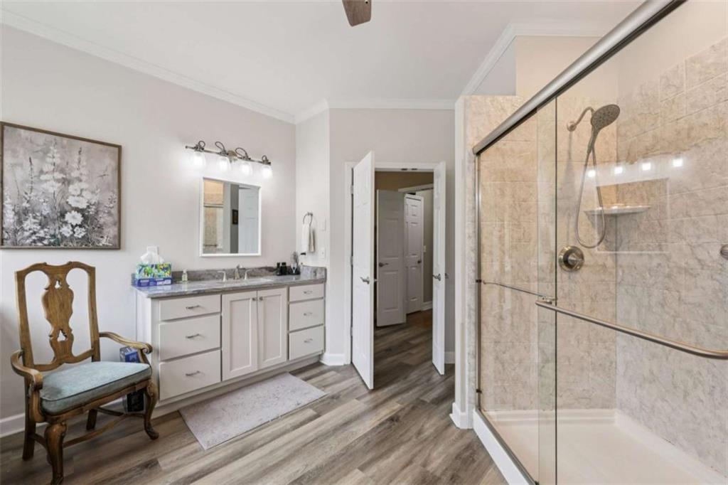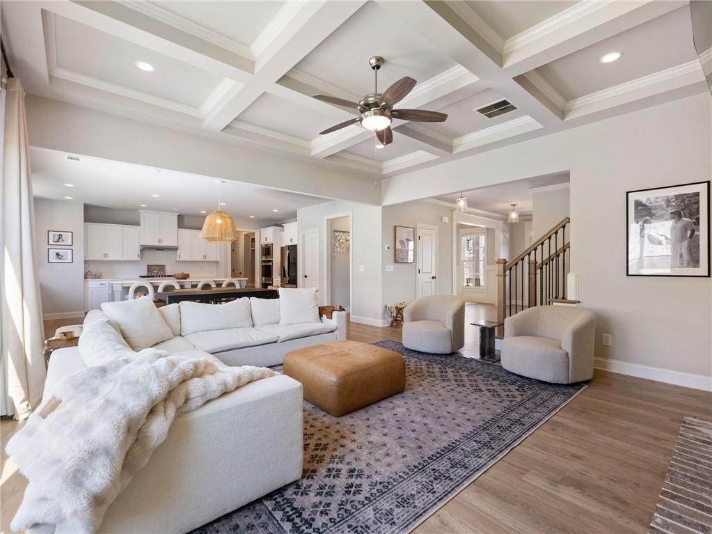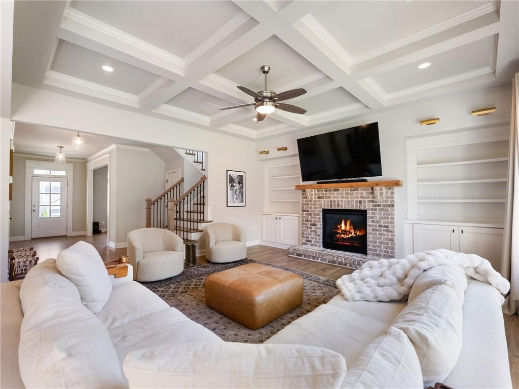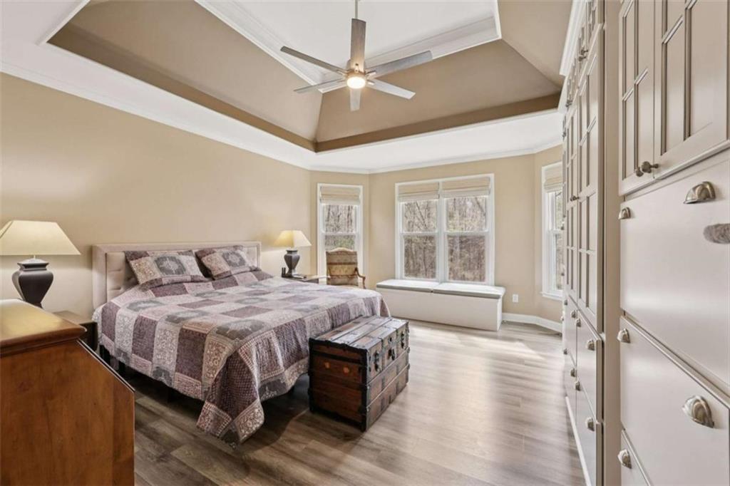 METICULOUSLY MAINTAINED AND DECORATED home in STERLING ON THE LAKE resort-style community! Upon entering this home, you will be flanked by the formal dining and formal living room areas which are currently being re-purposed as a formal living room and office space. This open floorplan welcomes you into the bright great room featuring coffered ceilings and built-in bookcases with views into the breakfast area and luxurious kitchen! Stunning kitchen provides an abundance of cabinets, chef's island that seats 4 comfortably, QUARTZ countertops, tile backsplash, farmhouse sink with window above, double ovens, and gas cooktop! BEDROOM AND BATH ON MAIN. Upgraded lighting and LVP throughout entire home! Upstairs, you will find a bedroom with it's own private en-suite along with two other secondary bedrooms joined by a Jack/Jill bathroom w/ quartz countertops. Natural light fills the spacious primary bedroom and flows into the primary bathroom with gorgeous tile, quartz countertops, frameless shower, soaking tub, dual vanities, and amazing walk-in closet! A LARGE BONUS ROOM is currently being enjoyed as an exercise room but could be a playroom, media room, or hobby room of your choosing! This wonderful home is in a great school district, near Lake Lanier and plenty of shopping. Neighborhood features several pools, playgrounds, tennis courts, pickleball courts, concert area, clubhouse with catering kitchen, zero entry pool with slide, lake with walking trails, outdoor fireplaces, and opportunity to canoe and fish!