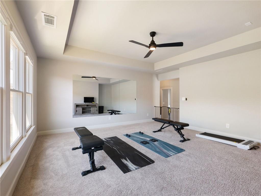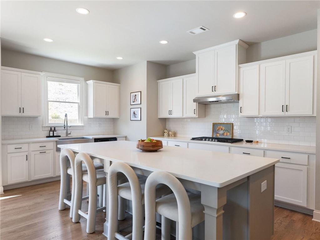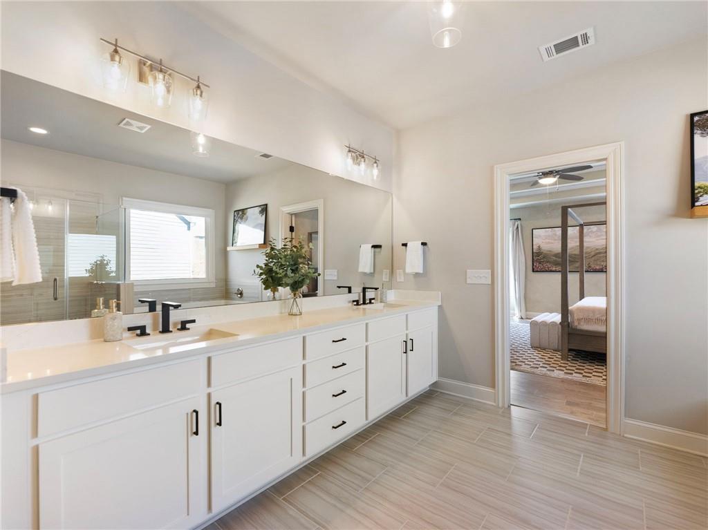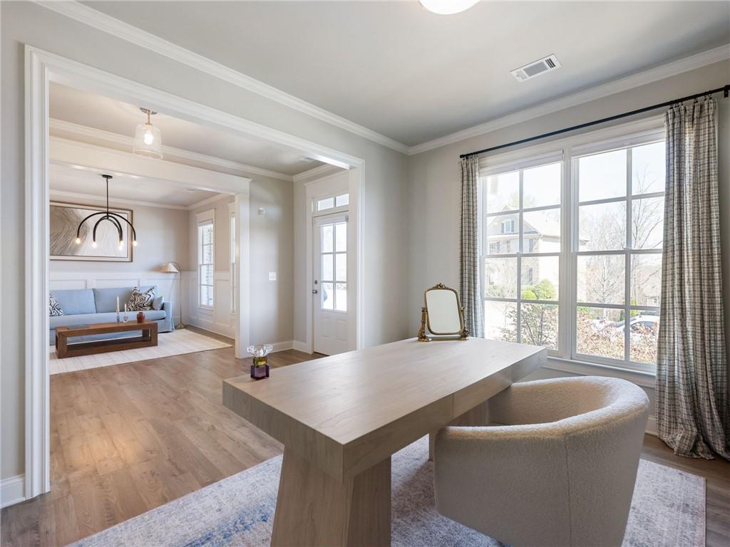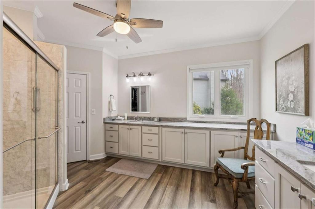 METICULOUSLY MAINTAINED AND DECORATED home in STERLING ON THE LAKE resort-style community! Upon entering this home, you will be flanked by the formal dining and formal living room areas which are currently being re-purposed as a formal living room and office space. This open floorplan welcomes you into the bright great room featuring coffered ceilings and built-in bookcases with views into the breakfast area and luxurious kitchen! Stunning kitchen provides an abundance of cabinets, chef's island that seats 4 comfortably, QUARTZ countertops, tile backsplash, farmhouse sink with window above, double ovens, and gas cooktop! BEDROOM AND BATH ON MAIN. Upgraded lighting and LVP throughout entire home! Upstairs, you will find a bedroom with it's own private en-suite along with two other secondary bedrooms joined by a Jack/Jill bathroom w/ quartz countertops. Natural light fills the spacious primary bedroom and flows into the primary bathroom with gorgeous tile, quartz countertops, frameless shower, soaking tub, dual vanities, and amazing walk-in closet! A LARGE BONUS ROOM is currently being enjoyed as an exercise room but could be a playroom, media room, or hobby room of your choosing! This wonderful home is in a great school district, near Lake Lanier and plenty of shopping. Neighborhood features several pools, playgrounds, tennis courts, pickleball courts, concert area, clubhouse with catering kitchen, zero entry pool with slide, lake with walking trails, outdoor fireplaces, and opportunity to canoe and fish!