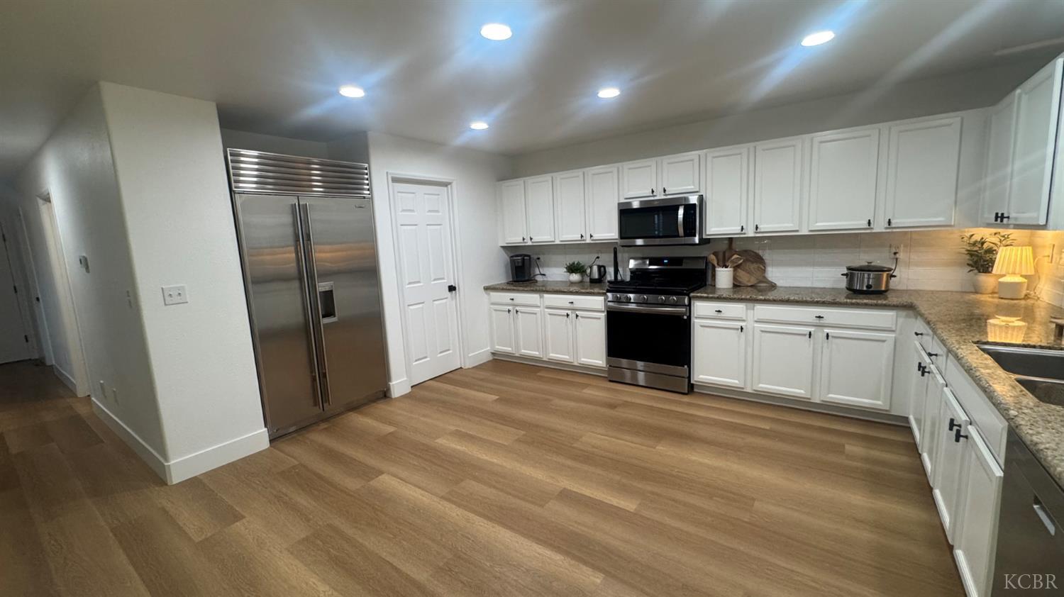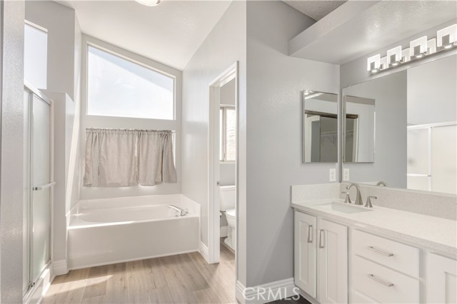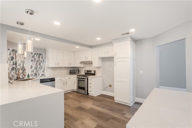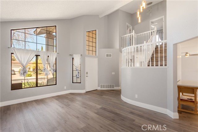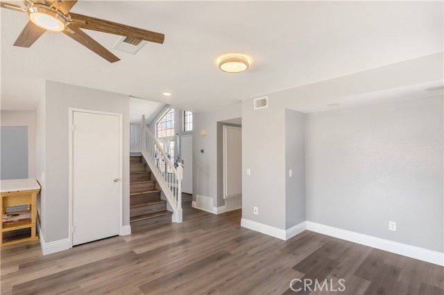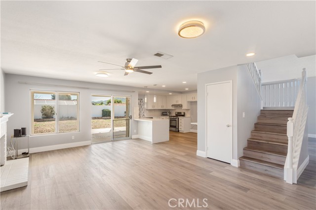 Welcome to this freeway close, beautifully remodeled cul-de-sac home. This home features PAID OFF SOLAR, NO HOA AND LOW PROPERTY TAXES. The bright and open floor plan features NEW luxury vinyl plank flooring throughout the home, NO CARPET, high base boards and freshly painted interior. Enter the home and notice the vaulted ceilings in the spacious formal living and dining. The kitchen features stainless appliances, quartz counters, ample storage, recessed lights and tear drop lights over the counter bar. Kitchen opens to family area with a wonderful fireplace to warm you on those cool evenings. Family area is extra-large with room for a potential pool table or many other uses. A convenient and large downstairs bedroom offers flexible use for guests, multigenerational living, or a home office. Head upstairs where you will find nicely appointed bedrooms, joined with a jack and jill bathroom. The pleasantly appointed prime bedroom boasts of a large walk-in closet with the primary ensuite having a separate tub and shower. This home also boasts of lots of storage and an inside laundry area. Head outside to enjoy a spacious backyard featuring a covered patio and citrus tree. Located within walking distance to Windsong Park, less than one mile from 15 freeway access. Don't miss your chance to own this turnkey home in one of Wildomar's most convenient neighborhoods!