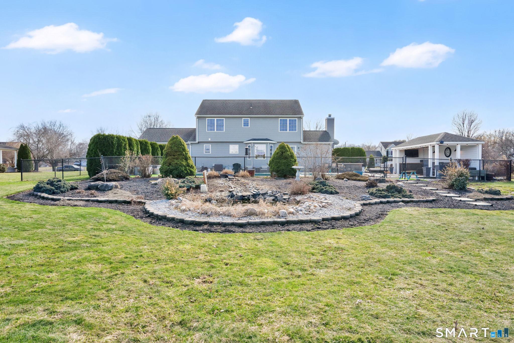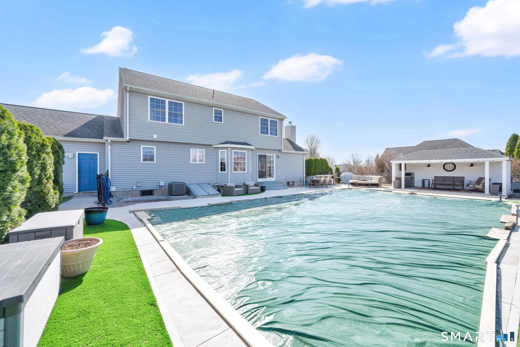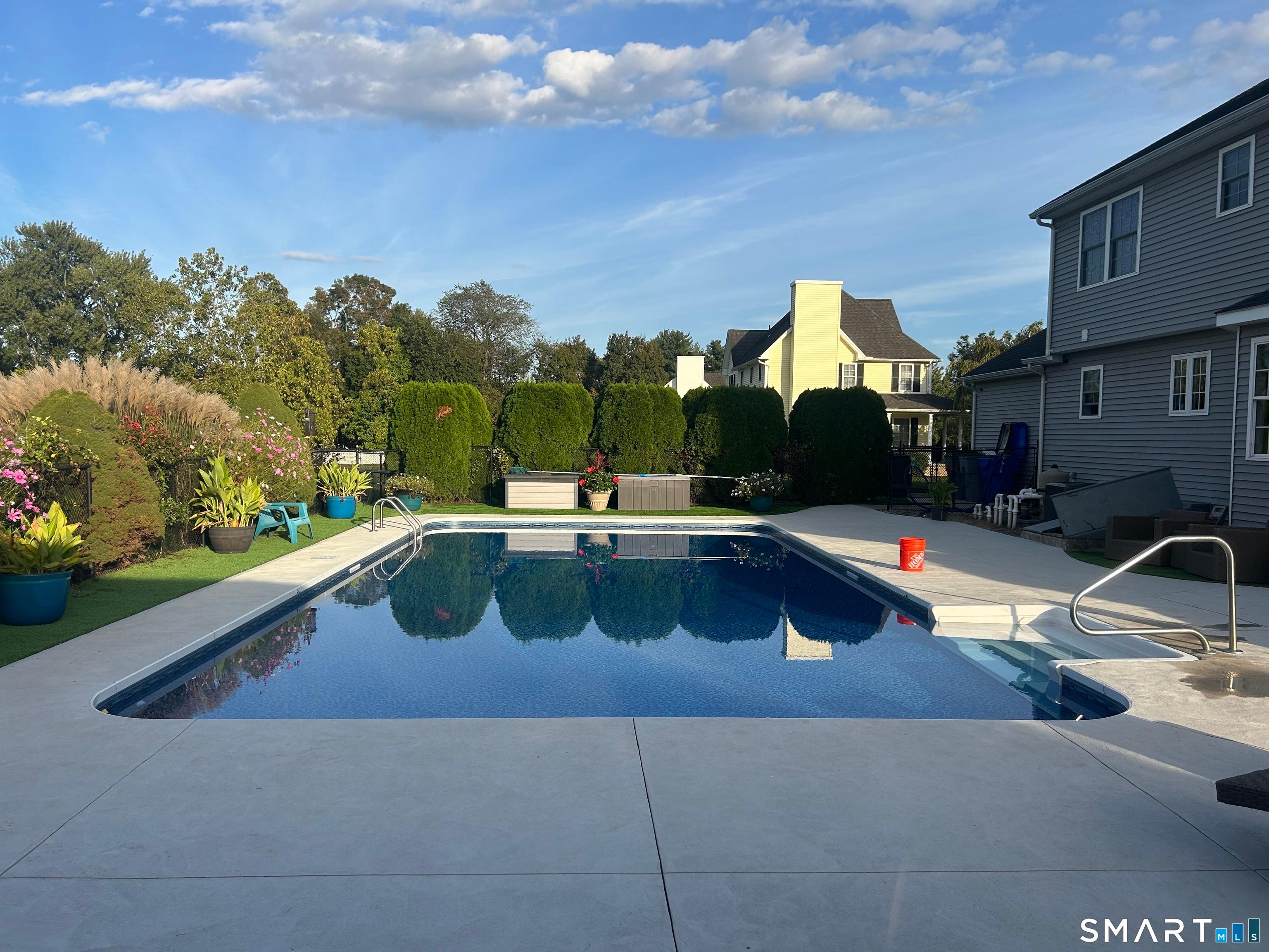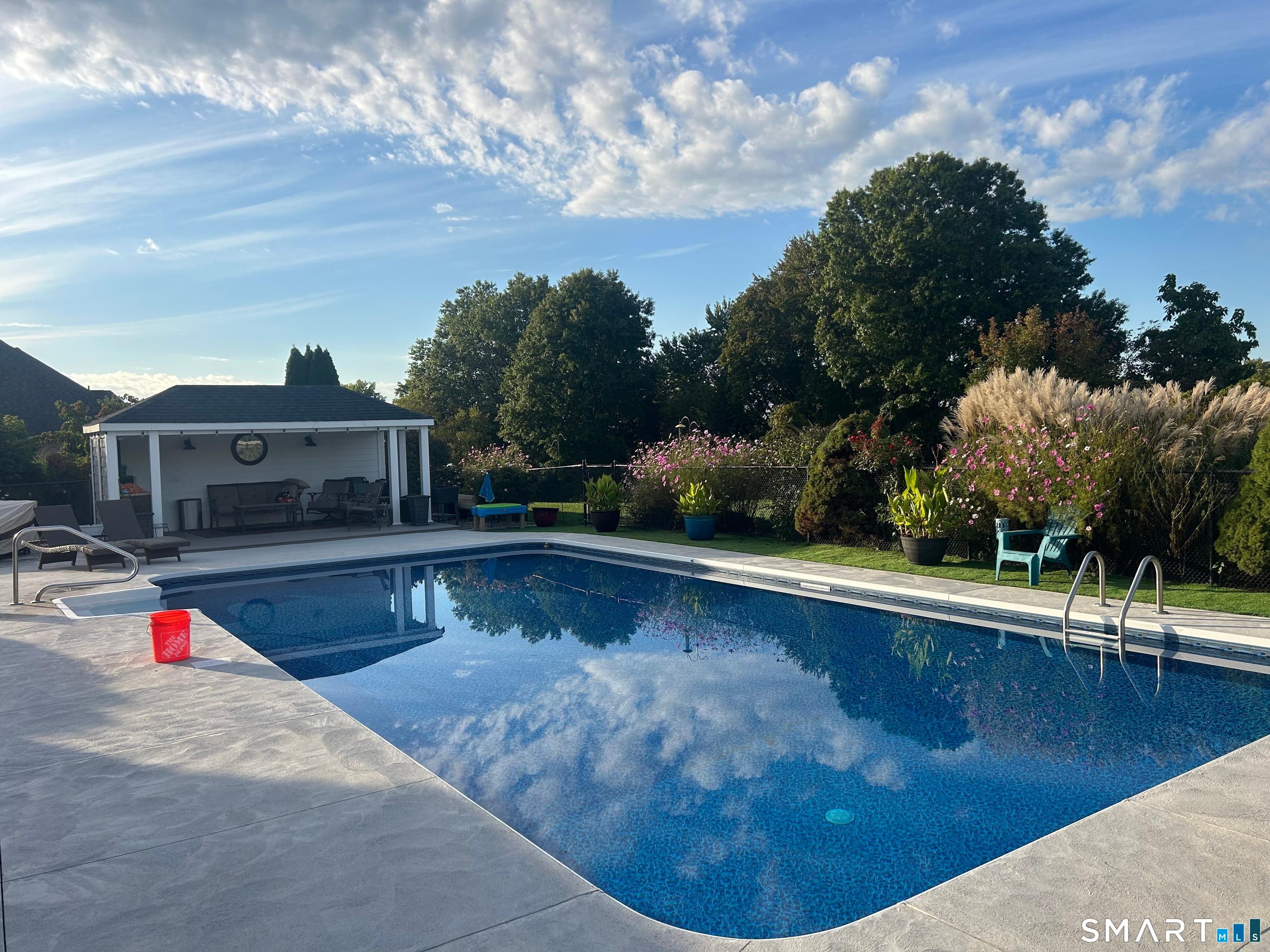 This stunning four-bedroom Colonial perfectly blends classic architectural charm with the modern, open-concept lifestyle youve been dreaming of. Situated on nearly an acre of private, level land, this home is an entertainers paradise designed for both grand gatherings and quiet relaxation. The heart of the home is the spectacular, completely remodeled chefs kitchen, featuring sleek quartz countertops, premium finishes, and a seamless flow into the sun-drenched family room. Anchored by a cozy fireplace, the family room serves as the ultimate hub for daily living. For more traditional occasions, the main floor also boasts a formal living room and an elegant formal dining room, offering versatile spaces for every milestone. Practicality meets luxury in the beautifully remodeled first-floor laundry room, while the completely finished lower level provides endless possibilities for a home theater, gym, or playroom. Youll also have peace of mind with major mechanical upgrades, including a newer furnace, central air conditioning, and a newer gas hot water heater. Step outside to your own private resort. The completely fenced-in backyard features a shimmering in-ground pool surrounded by expansive lounging areas-perfect for summer sunbathing. The pool house adds a layer of convenience and style, while the nearby koi fish pond creates a tranquil atmosphere. As the day ends, retreat to the patio to take in gorgeous sunset views that paint the sky over your expansive estate.