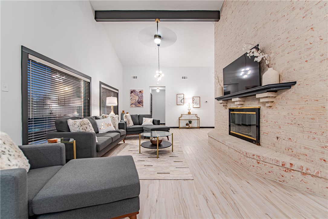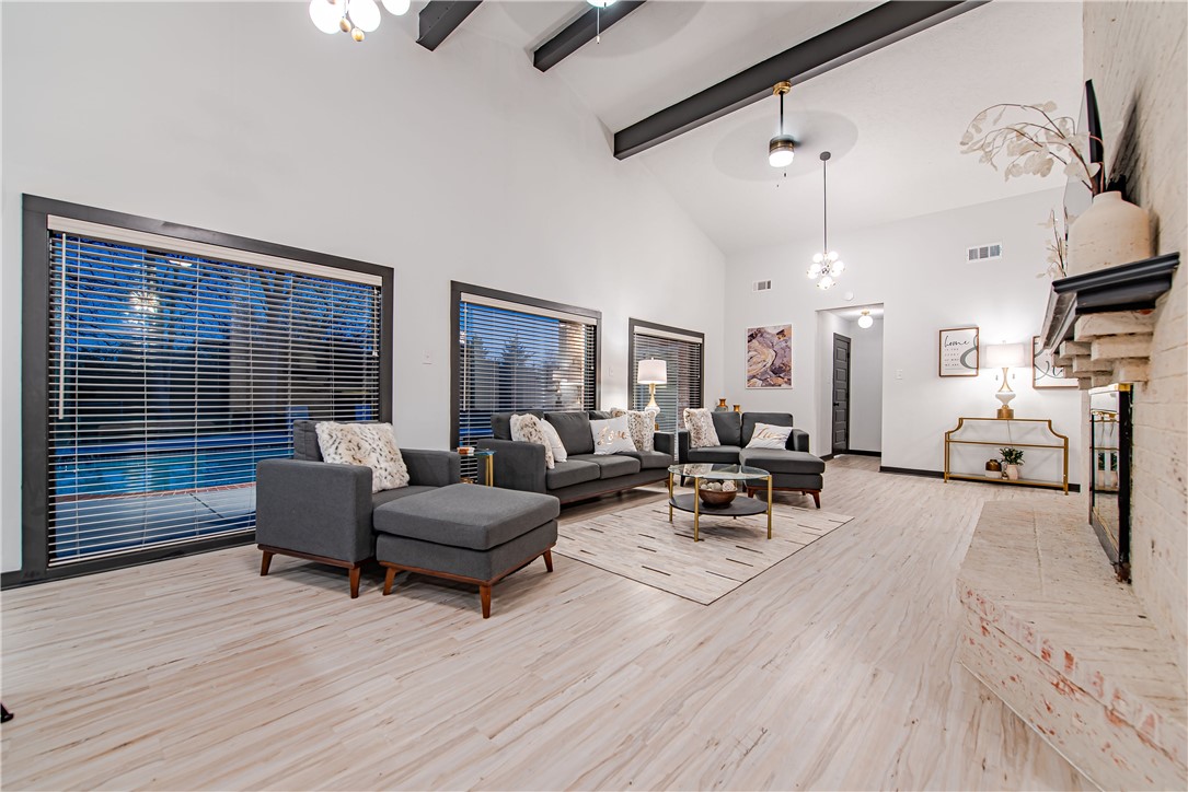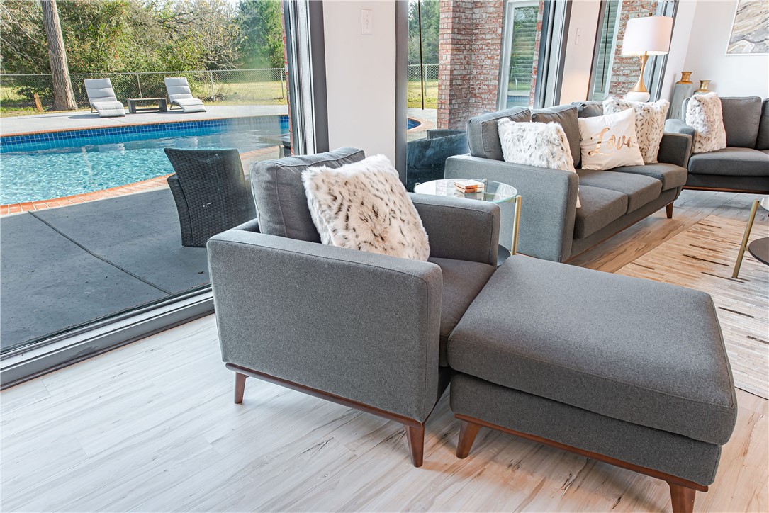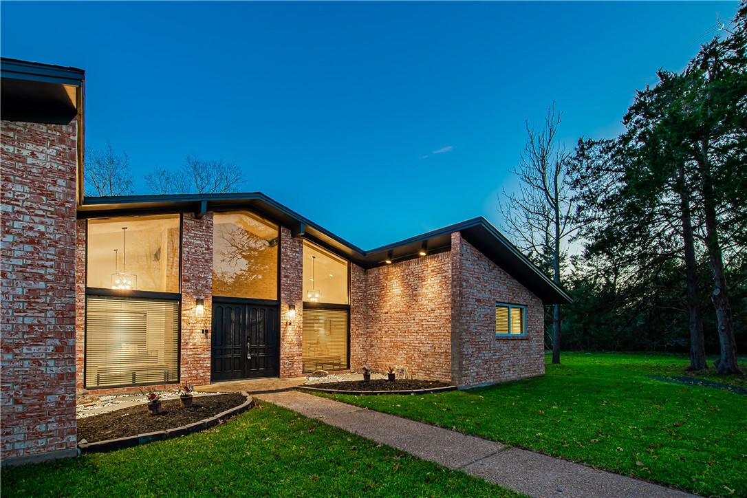 Charming 4.86-acre retreat just minutes from University Drive and Texas A&M University in the established Enchanted Oaks neighborhood — pet-friendly. This 2,000 sq ft home features 1970s modern flair on the exterior and an open-concept interior ideal for entertaining: soaring ceilings, a dramatic brick wood-burning fireplace, and a wall of picture windows framing the oversized pool, hot tub, and wooded acreage. Outdoor living excels with a large pool deck for gatherings, dedicated dining and seating areas, a fire pit, and private, partially wooded land. Interior highlights include a spacious master suite, oversized bedrooms, walk-in showers, laundry room, and a detached 2-car garage. Convenient to Bryan/College Station amenities and Texas A&M — a special property with character and potential.