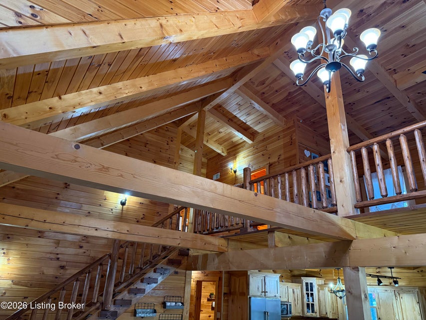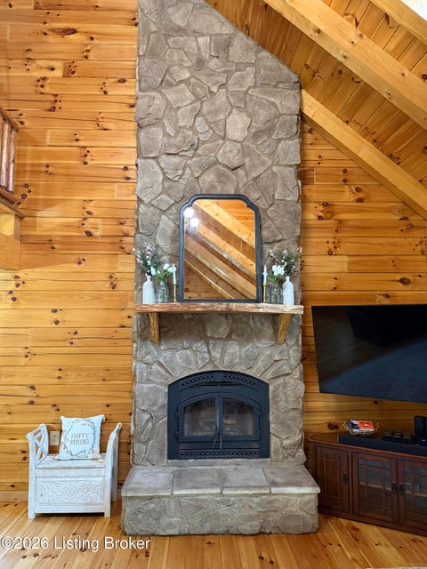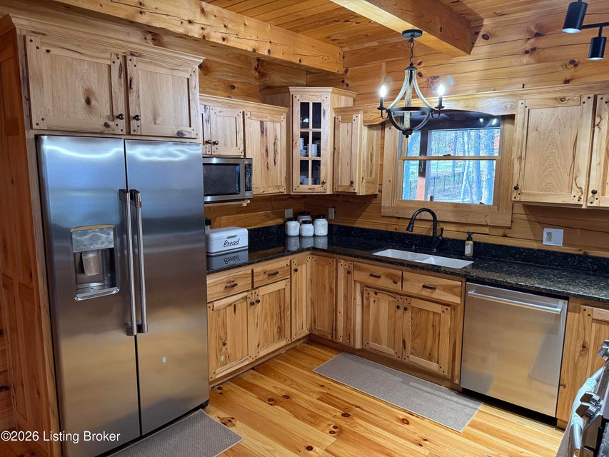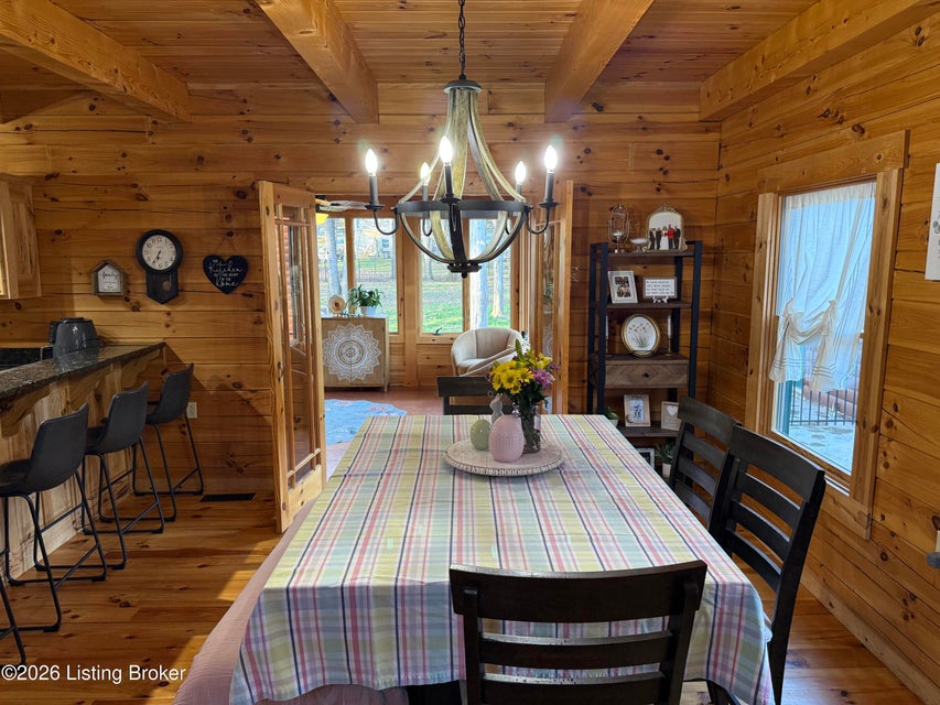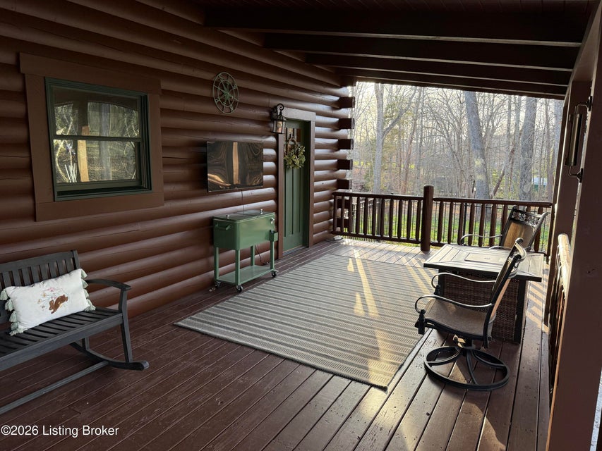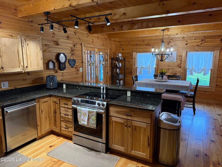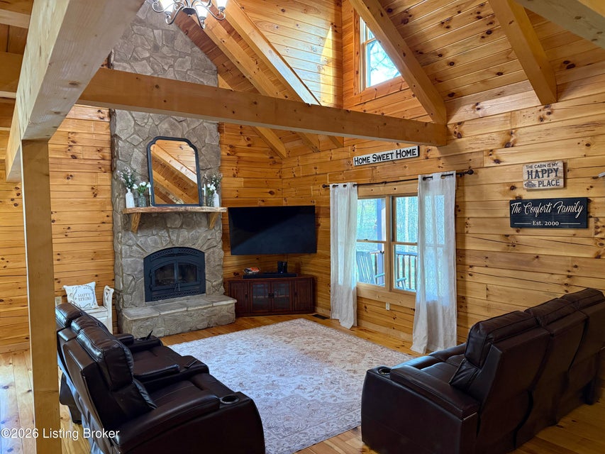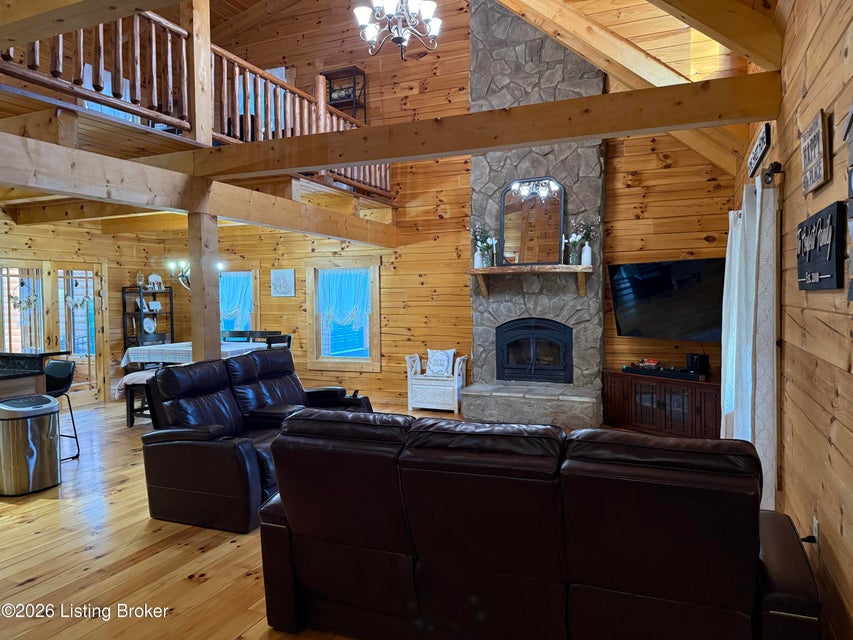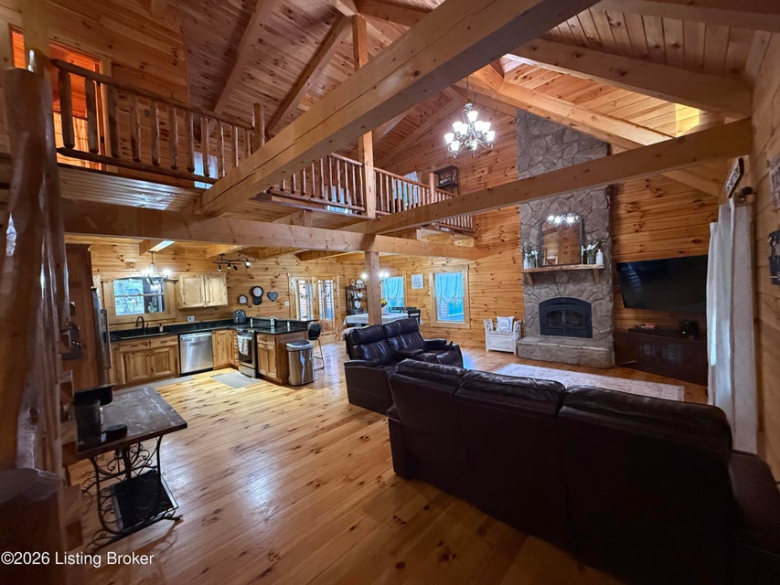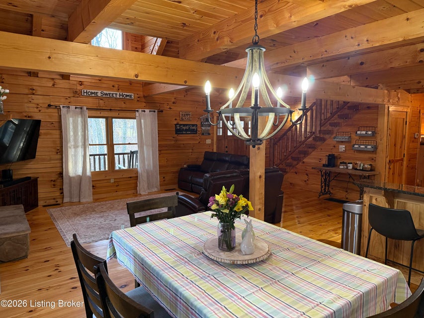 Log Cabin Country living at its finest. Come check out this BEAUTIFUL custom built well maintained log cabin sitting on picturesque 3.5 acres surrounded by trees and also has a small brook that runs down in front of the house. When walking up to the front entry of the house you are greeted by a covered front porch that runs the length of the house, great for sitting out and relaxing and taking in the amazing landscape. As you enter the front door the open living room has large wood beams going across to the open loft above with a beautiful woodburning stone fireplace. The living room opens to the chefs kitchen has hickory cabinets with granite countertops, a raised bar top and stainless steel appliances. The dining area off the open living room and kitchen is great for family gatherings.