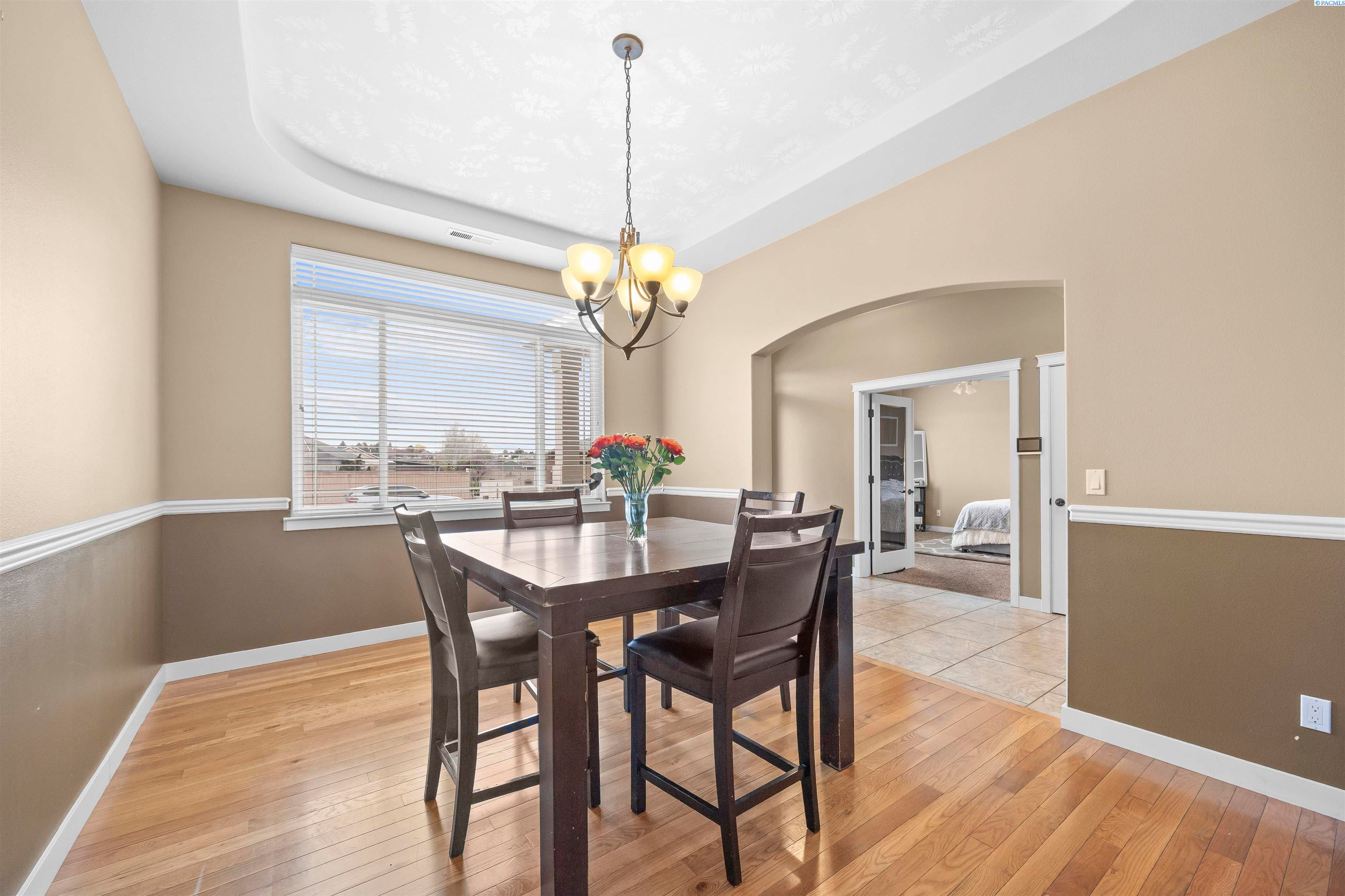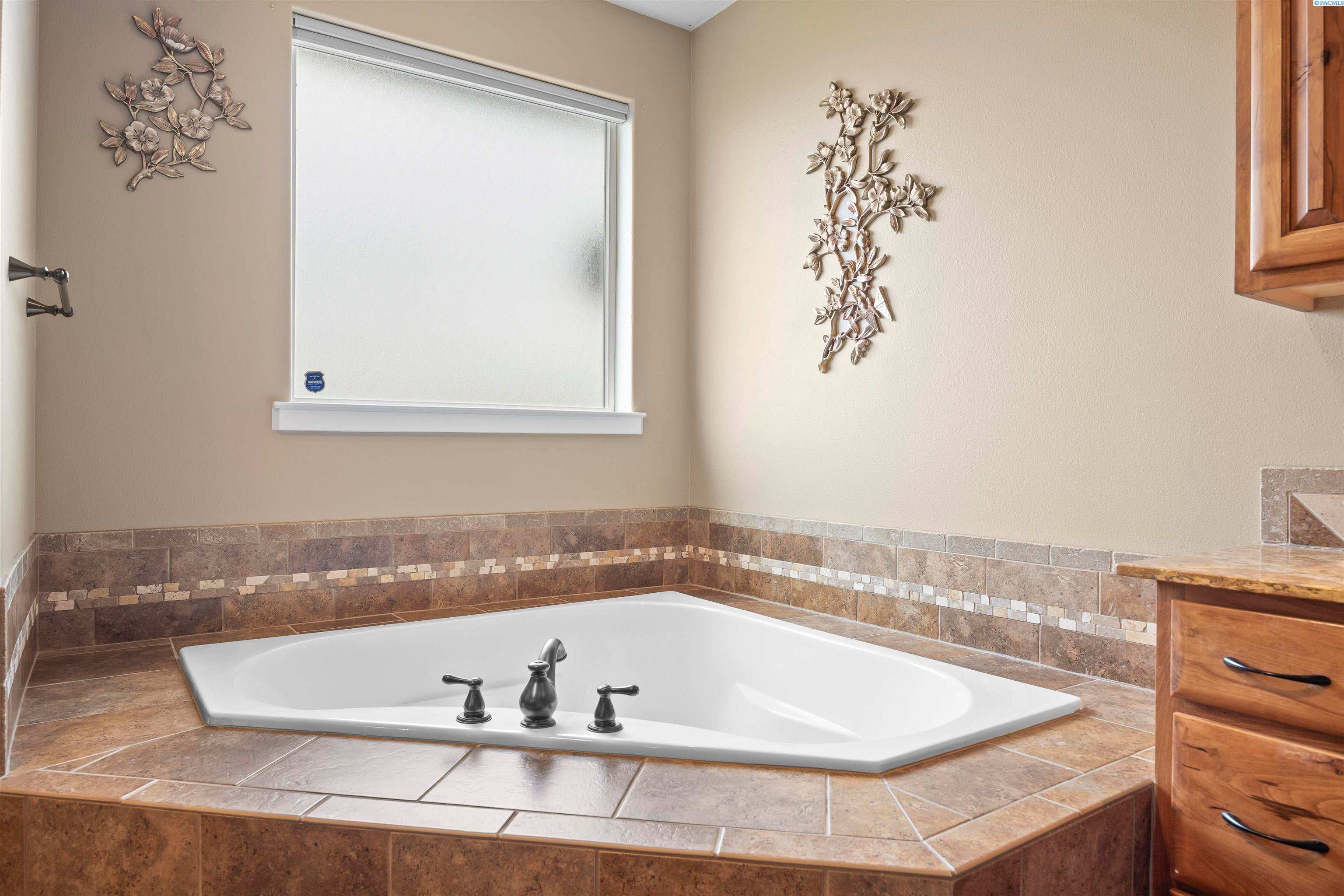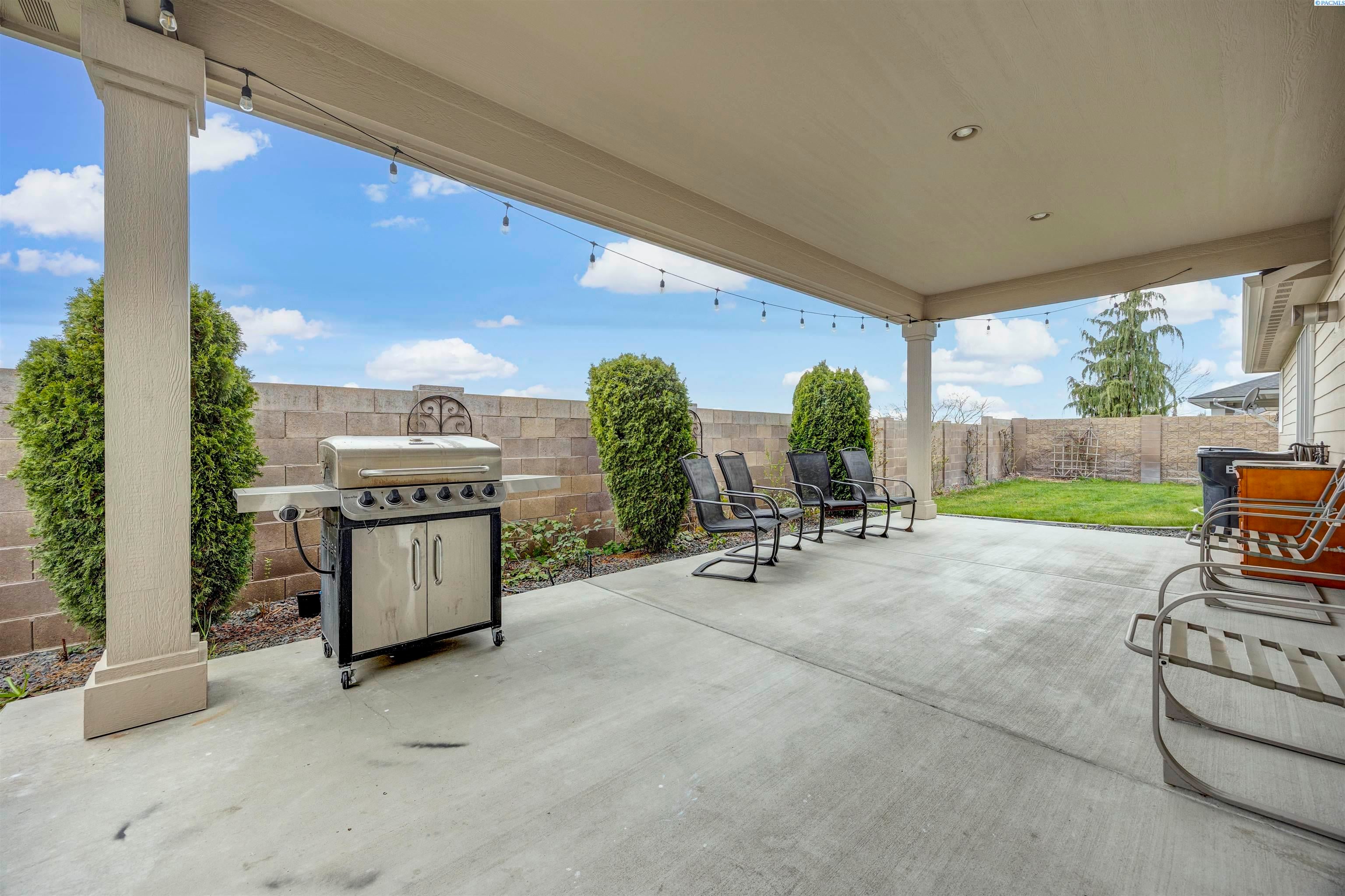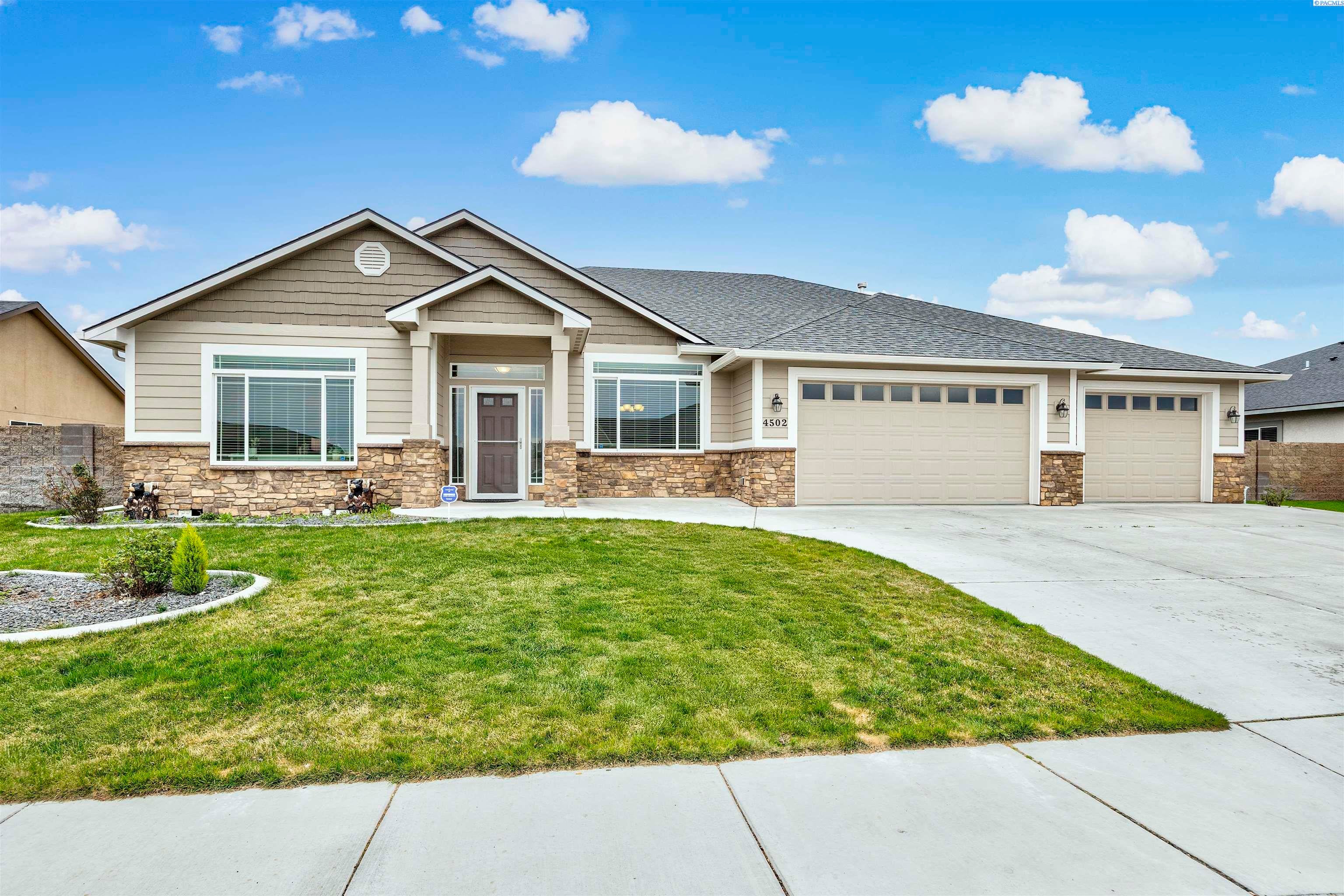 MLS# 291383 Welcome to this beautiful custom-built home in the inviting First Place community of West Pasco. Offering 2,745 sq ft of thoughtfully designed living space, this spacious single-level home features 4 bedrooms and 2.5 bathrooms. Step inside to a stunning tiled entry and elegant coffered ceiling that create an inviting first impression. The formal dining room is perfect for holiday meals and special gatherings, highlighted by gorgeous oak flooring that continues into the spectacular kitchen. Designed with both style and function in mind, the kitchen features custom alder cabinetry, granite countertops, a tiled backsplash, pantry, and stainless steel appliances including a gas range. The oversized island with breakfast bar provides abundant storage and prep space, making this truly an entertainer’s dream kitchen. The family room is warm and welcoming, featuring a beautifully detailed coffered ceiling and a cozy gas fireplace. The spacious primary suite offers an expansive dual closet and a luxurious private ensuite with a large tiled shower with multiple shower heads, a soaking tub, and a granite double-sink vanity. The secondary bedrooms are generously sized, and the full guest bathroom also includes a convenient double-sink vanity. A stylish half bath with granite countertops adds additional convenience for guests. The fourth bedroom, which could also serve as a home office or den, is located near the entry and features elegant French doors. Additional highlights include a well-appointed utility room with sink and cabinetry, and an attached 3-car garage with a large storage room—perfect for vehicles, hobbies, and seasonal projects. Step outside to enjoy the private covered patio with a gas BBQ stub, ideal for outdoor entertaining. The fully fenced backyard with a block wall provides both privacy and security. A neighborhood park is just around the corner, and the home offers easy access to Burden Blvd where you’ll find excellent amenities, schools, a sports complex, shopping, dining, and more.