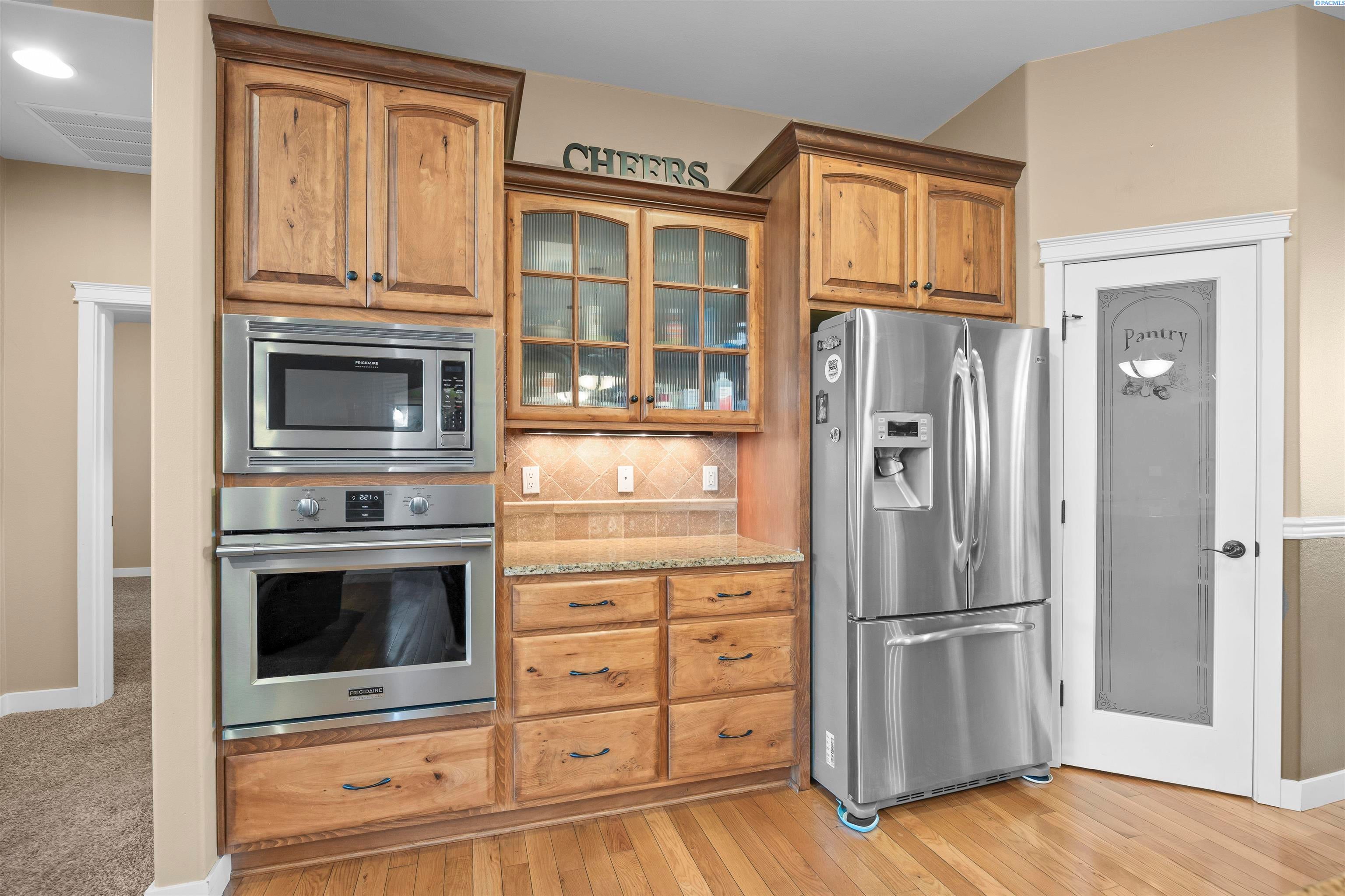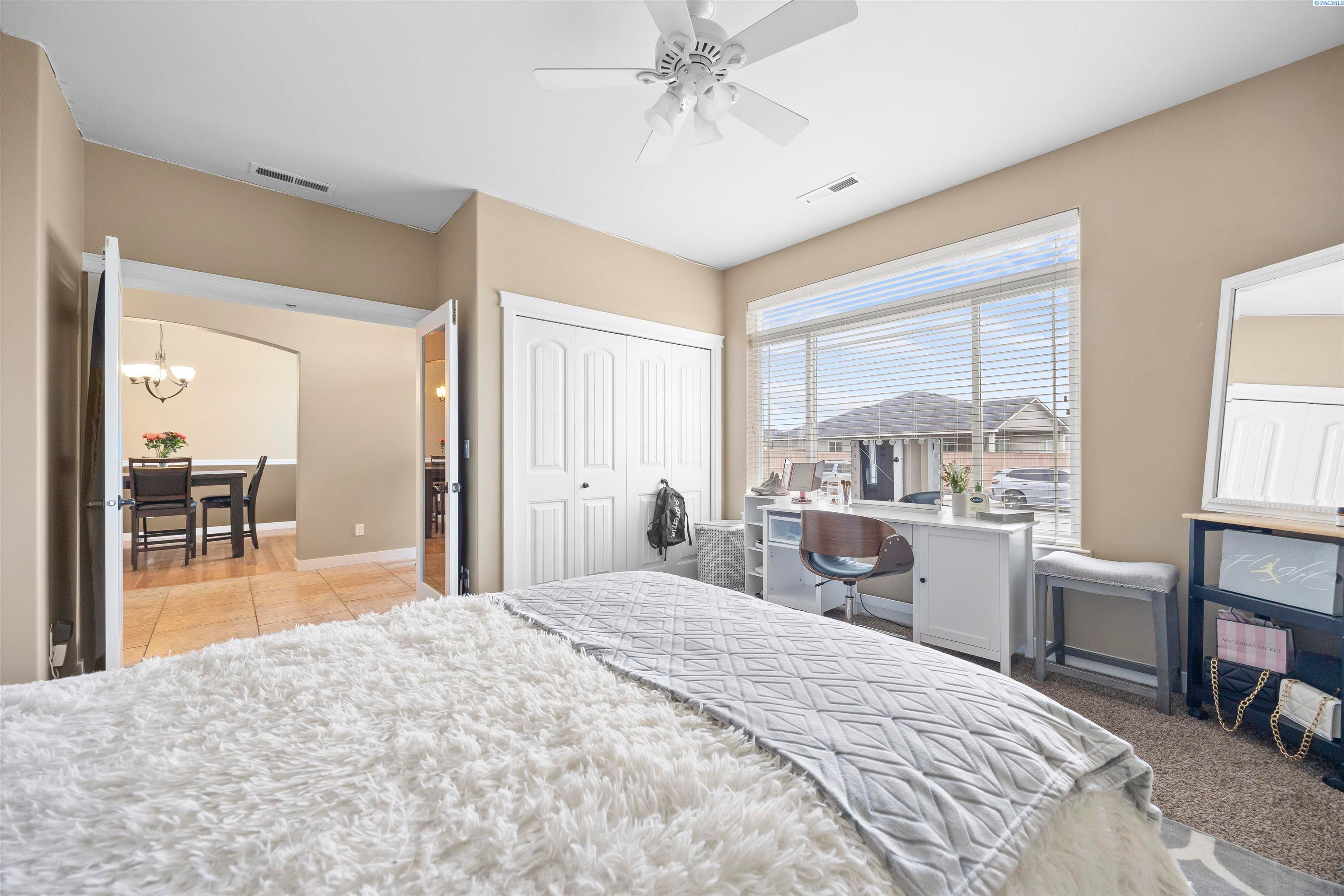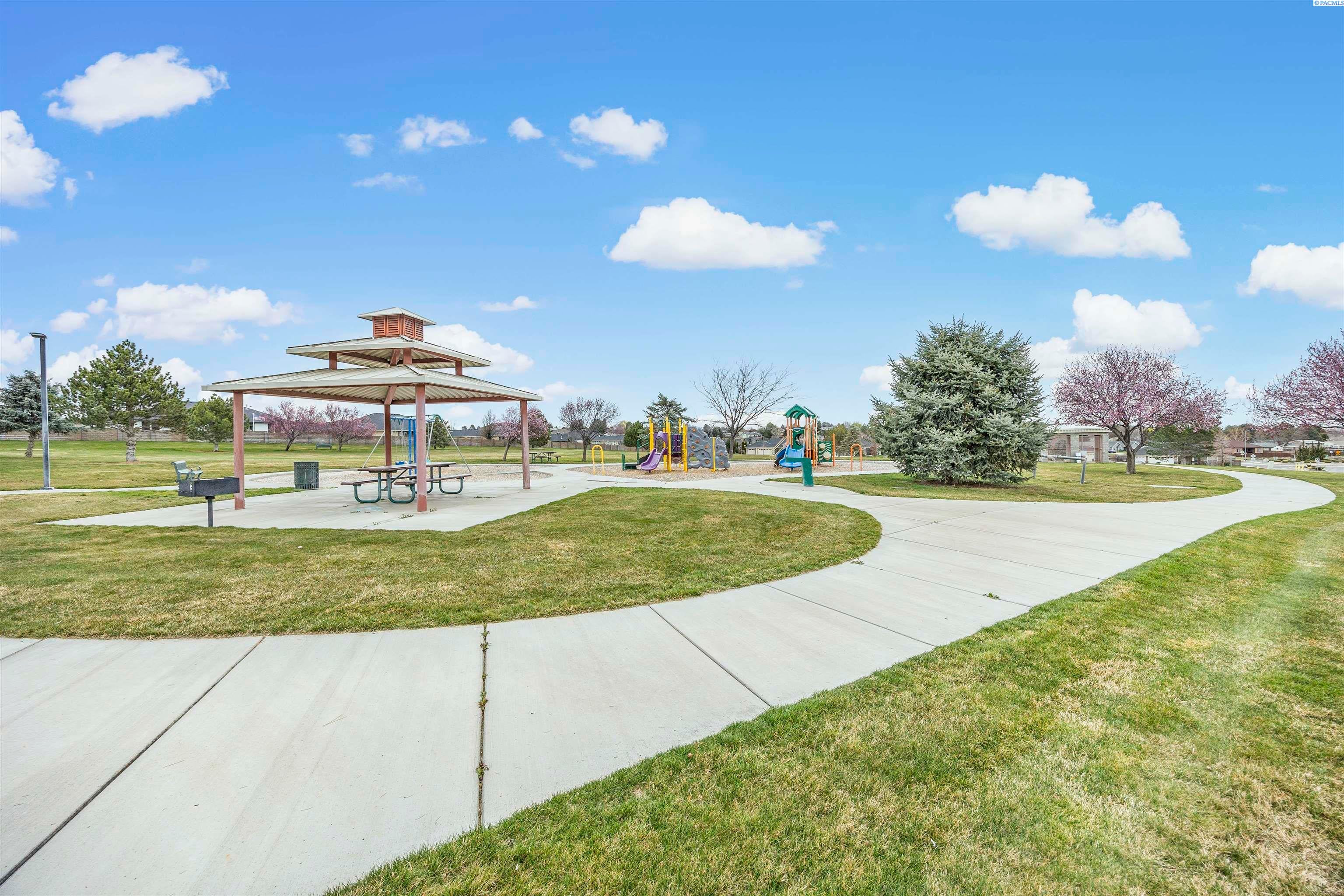 MLS# 291383 Welcome to this beautiful custom-built home in the inviting First Place community of West Pasco. Offering 2,745 sq ft of thoughtfully designed living space, this spacious single-level home features 4 bedrooms and 2.5 bathrooms. Step inside to a stunning tiled entry and elegant coffered ceiling that create an inviting first impression. The formal dining room is perfect for holiday meals and special gatherings, highlighted by gorgeous oak flooring that continues into the spectacular kitchen. Designed with both style and function in mind, the kitchen features custom alder cabinetry, granite countertops, a tiled backsplash, pantry, and stainless steel appliances including a gas range. The oversized island with breakfast bar provides abundant storage and prep space, making this truly an entertainer’s dream kitchen. The family room is warm and welcoming, featuring a beautifully detailed coffered ceiling and a cozy gas fireplace. The spacious primary suite offers an expansive dual closet and a luxurious private ensuite with a large tiled shower with multiple shower heads, a soaking tub, and a granite double-sink vanity. The secondary bedrooms are generously sized, and the full guest bathroom also includes a convenient double-sink vanity. A stylish half bath with granite countertops adds additional convenience for guests. The fourth bedroom, which could also serve as a home office or den, is located near the entry and features elegant French doors. Additional highlights include a well-appointed utility room with sink and cabinetry, and an attached 3-car garage with a large storage room—perfect for vehicles, hobbies, and seasonal projects. Step outside to enjoy the private covered patio with a gas BBQ stub, ideal for outdoor entertaining. The fully fenced backyard with a block wall provides both privacy and security. A neighborhood park is just around the corner, and the home offers easy access to Burden Blvd where you’ll find excellent amenities, schools, a sports complex, shopping, dining, and more.