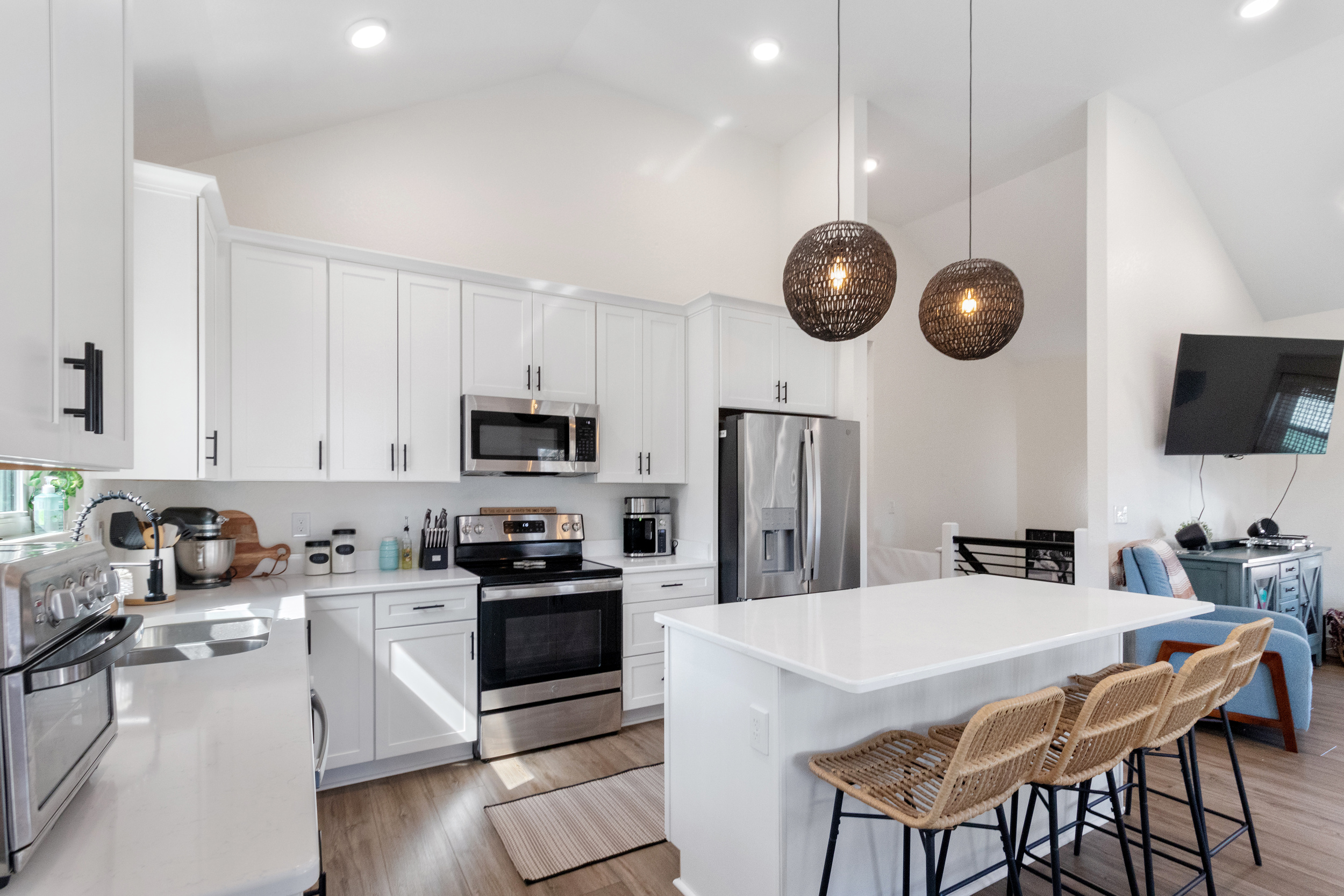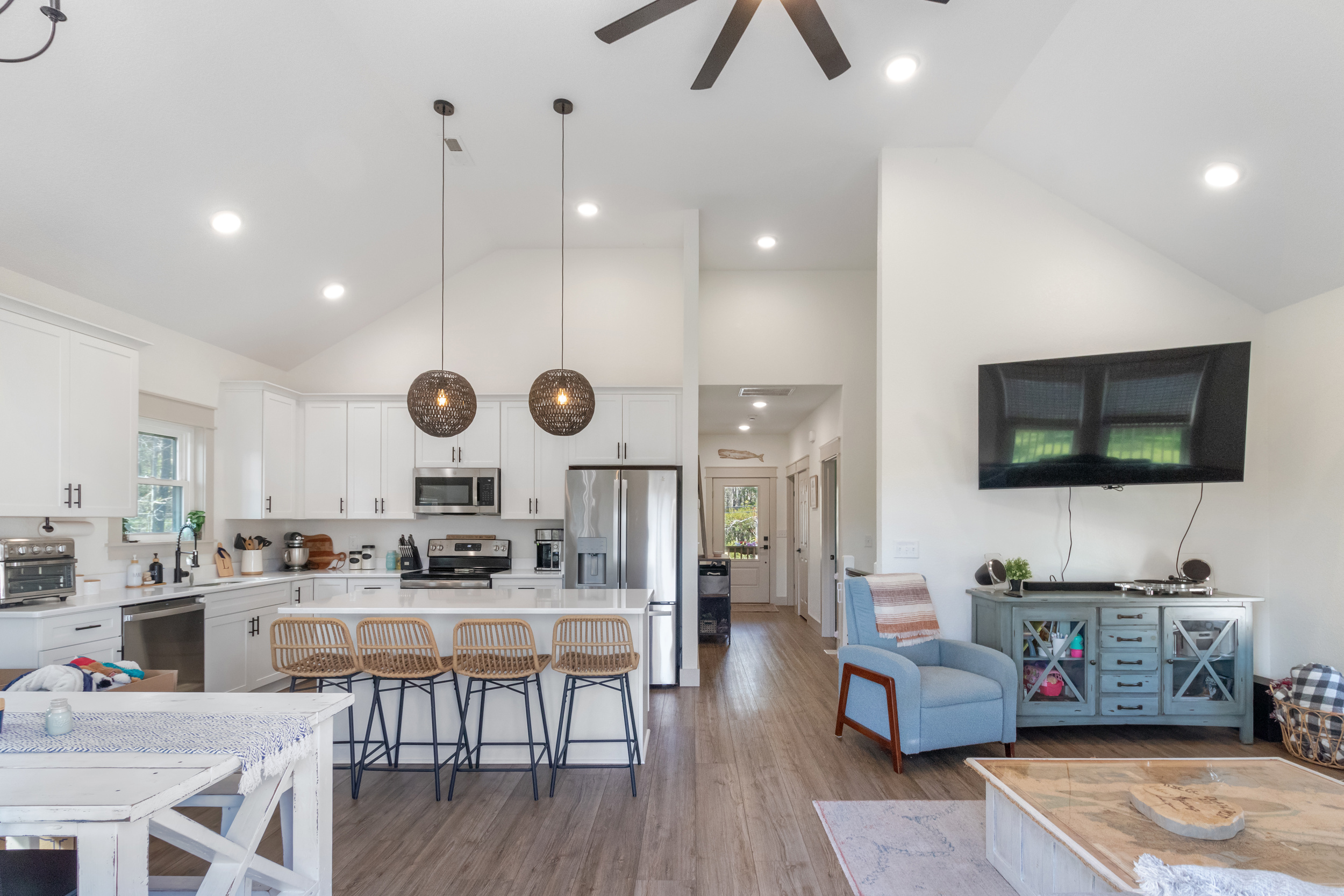 Nicely updated Craftsman home offering 2,398 SF of comfortable living space and move-in ready upgrades throughout. The home features fresh interior and exterior paint, new hard-surface LVP flooring across the main level, and plush new carpet upstairs. The beautifully refreshed kitchen includes light-colored countertops, brand-new stainless steel appliances, and stylish oil-rubbed bronze cabinet hardware. A spacious open living and dining room welcomes you off the entry, filled with large windows that provide abundant natural light and a great space for gatherings and entertaining. Just off the kitchen is a second eating area and cozy family room featuring a warm gas fireplace and views of the good-sized private backyard. Upstairs you'll find four large bedrooms, including an oversized fourth bedroom that can also serve as a bonus room. The primary suite offers vaulted ceilings and a private four-piece bath. The fully fenced yard provides privacy and room to enjoy the outdoors. The home also features all gas appliances for lower heating costs and possible RV parking. Don't miss the opportunity to see this beautifully updated home before it's gone!