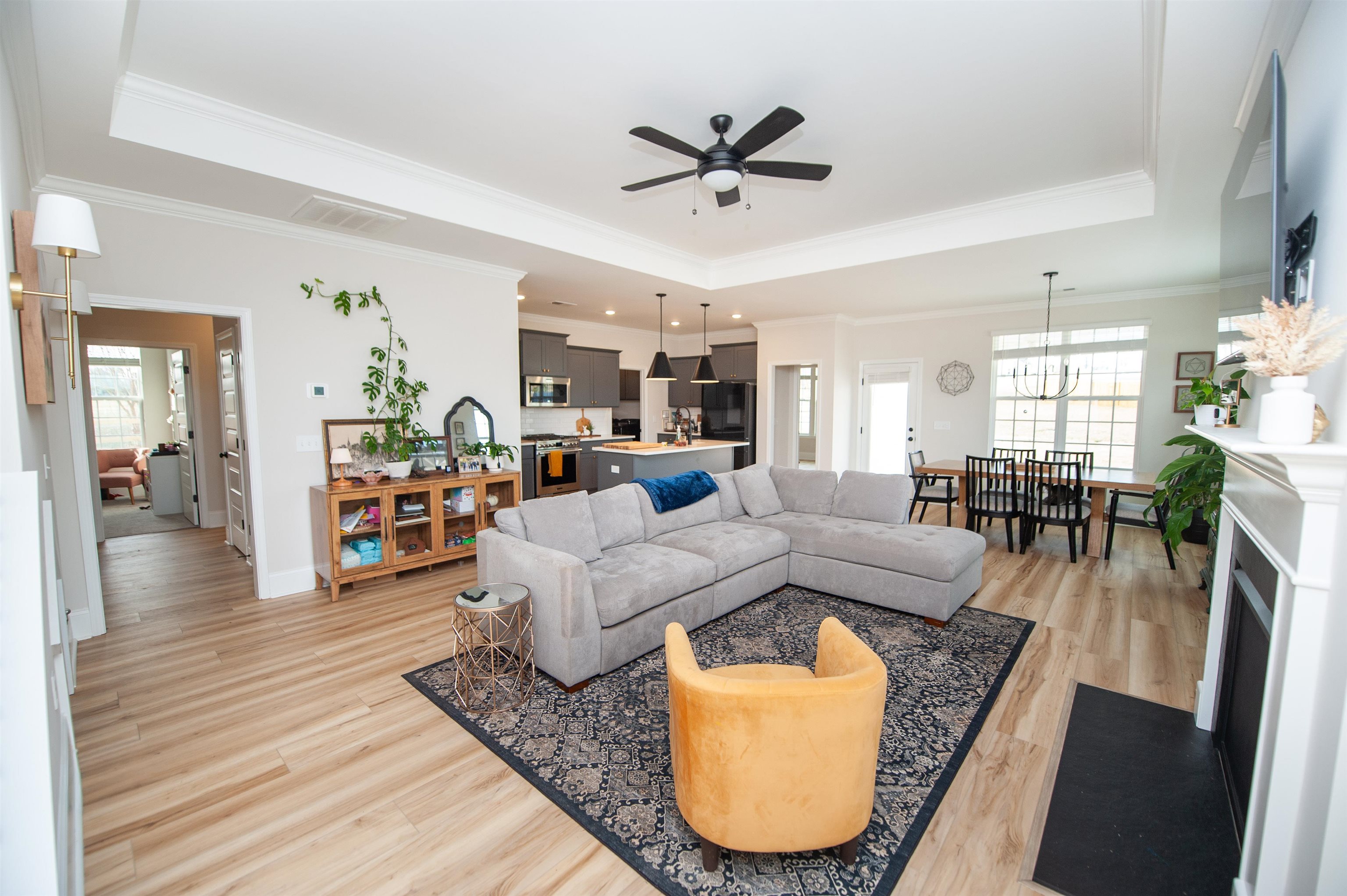 This single-story residence is situated on an approximately 6,970 sq ft lot and offers flexible living space with both interior and outdoor areas. The main home features a living room with fireplace and sliding glass door providing direct access to the backyard. The kitchen includes wood cabinetry and an adjacent dining area with natural light.