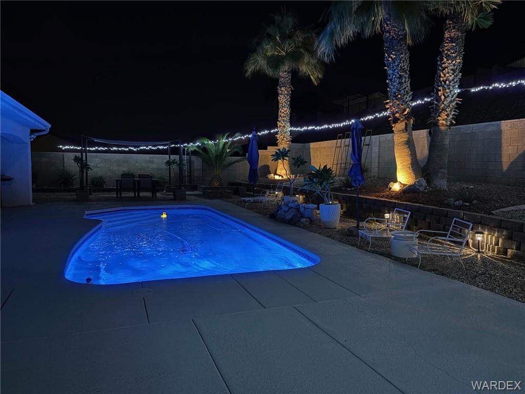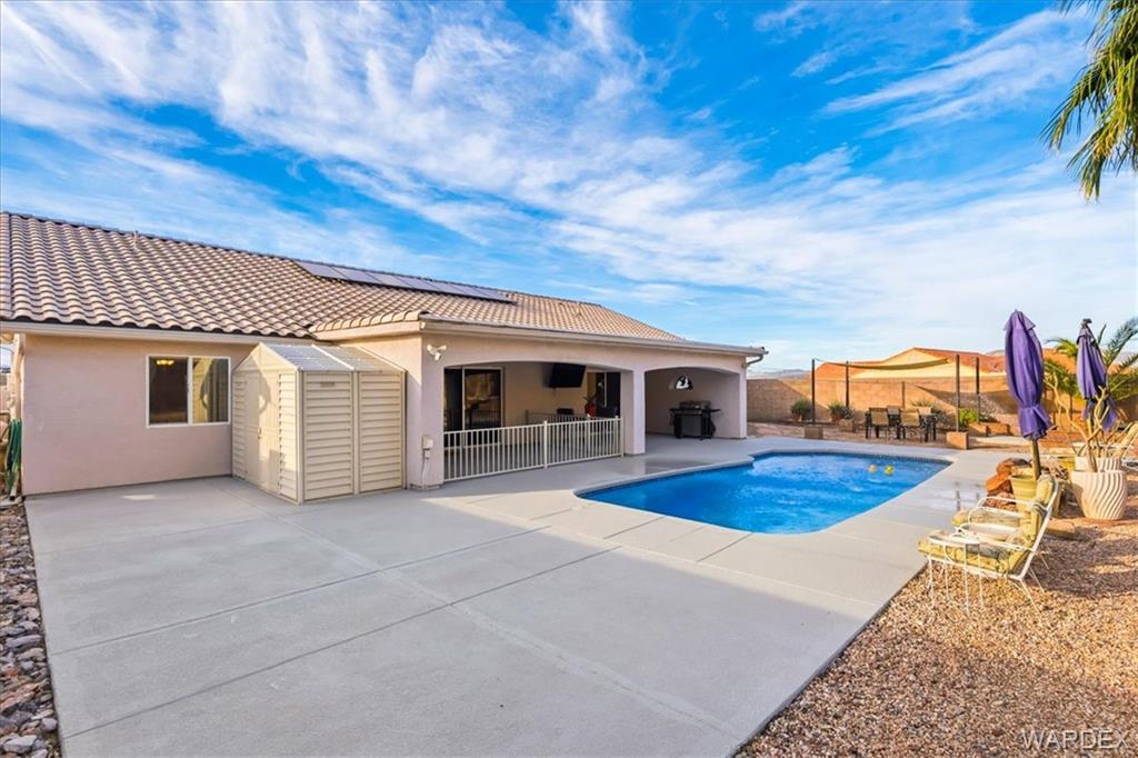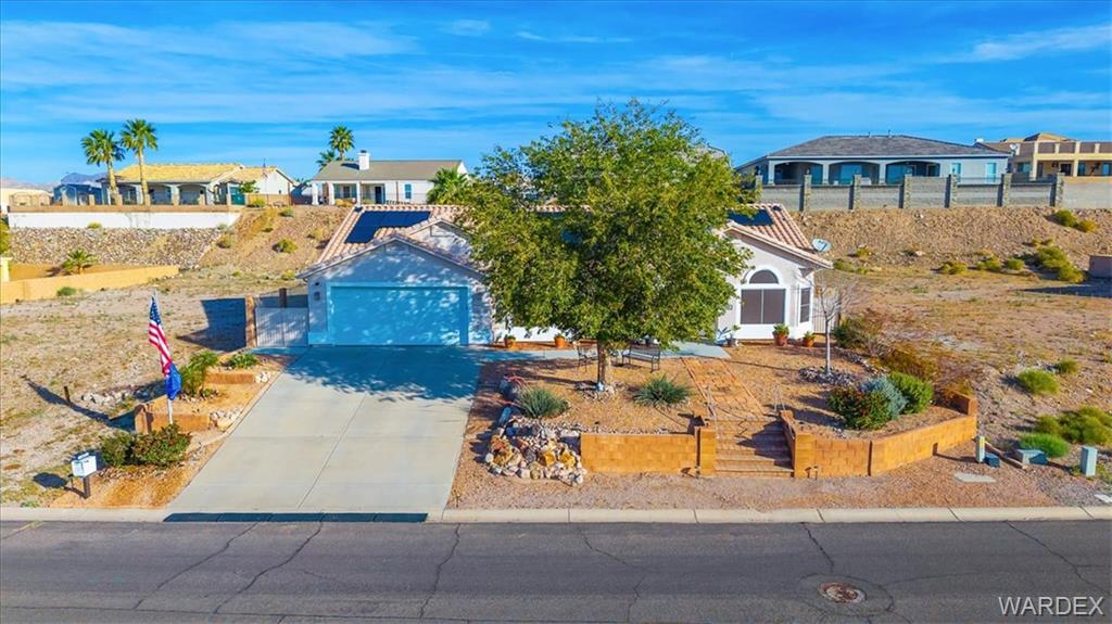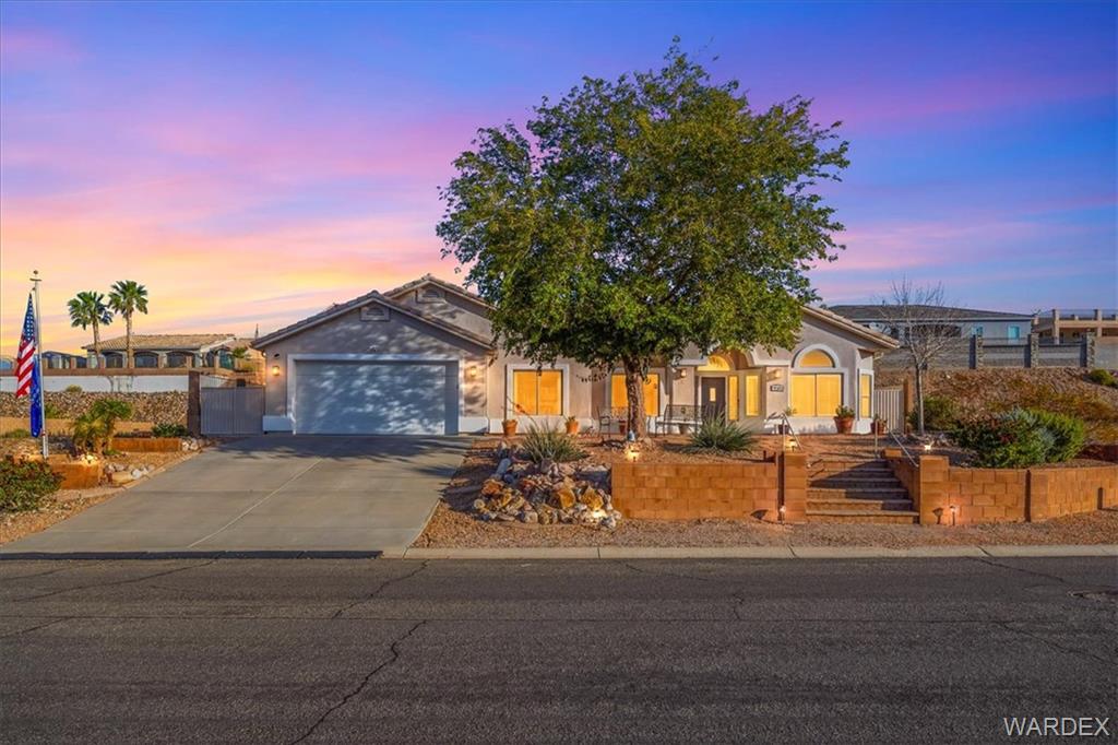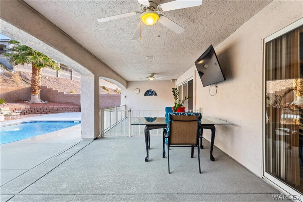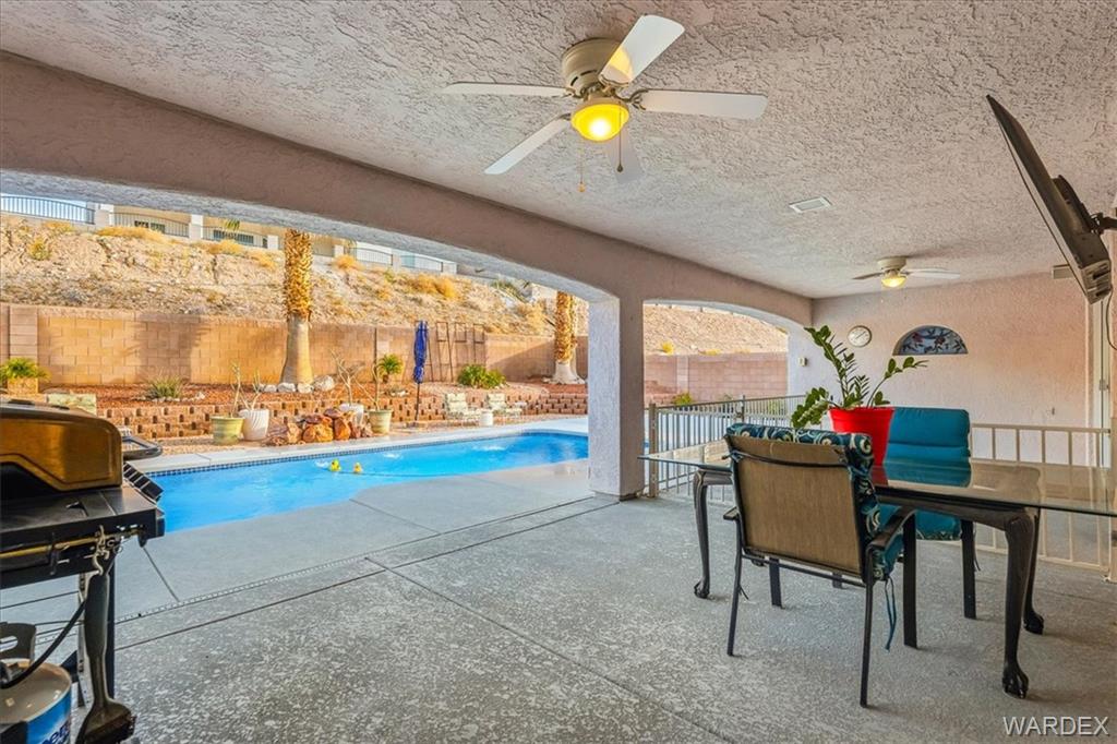 Best location in Bullhead in sought after Sunridge Estates at the edge of the parkway but NO HOA! Avoid the crowds, minutes from Lake Mohaves Kathrine landing, Laughlin Casinos, and River fun. Designed for fun with great room open to the newly remodeled Kitchen. featuring 20 feet of Quartz countertops, new stainless appliances, reverse osmosis water, gas stove, stunning backsplash, pantry, huge dining nook with built in bench and room for a crowd, AND it has counter top seating. The 4 large bedrooms are arranged in a split floor plan plus a 5th room that could be additional guest room, home office or den. 10,000 square foot lot has easy to maintain landscaping with automatic watering. 32 X 22 Boat deep Garage with its own minisplit AC. The large private backyard featuring a sparkling pool with a charming water feature, additional seating areas, large covered patio that faces north for all day shade in summer heat. Keeps cool in the summer with two separate AC units in addition to garage unit and solar to help lower the cost of electric. Reliable low maintenance city water and private 3 stage spring water treatment system and community sewer. Perfect for fulltime/part time living you need to put this one on your MUST SEE LIST