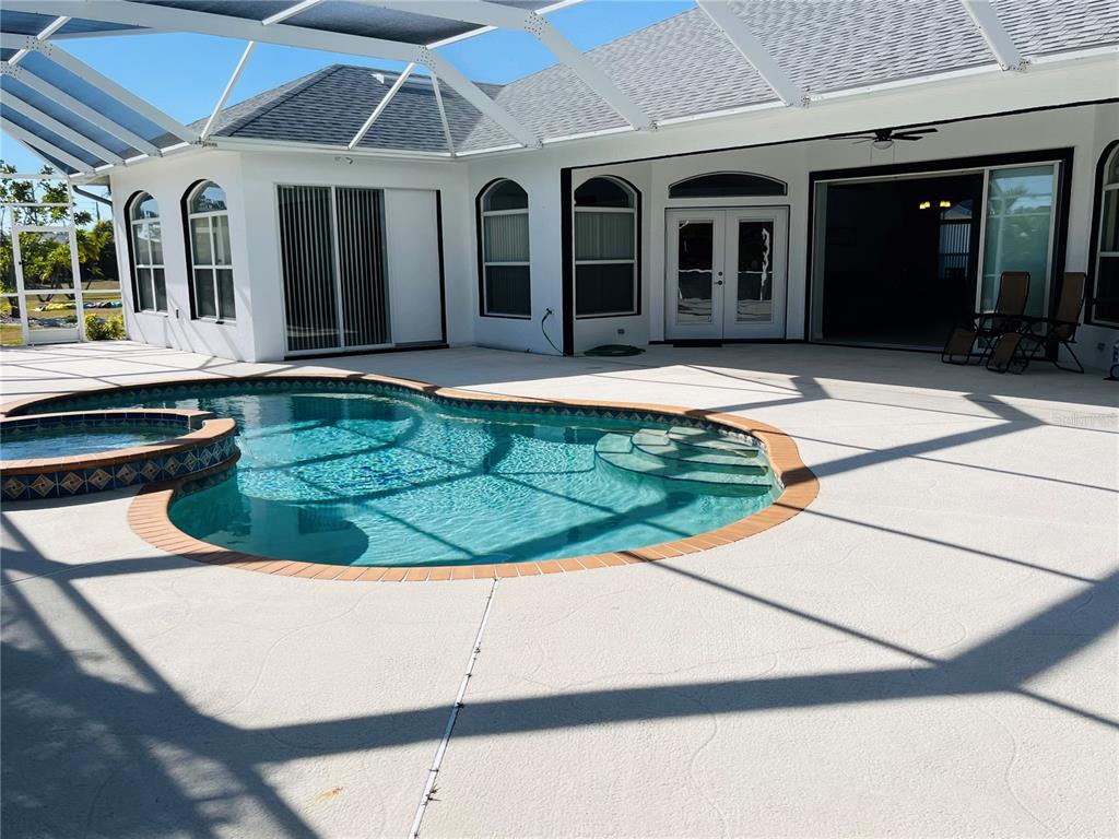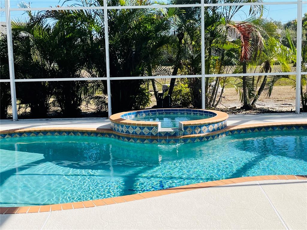 Imagine coming home to relax in your spa-like retreat. The grand entrance leads you to stunning views of the 48x18 pool & hot tub with a cascading waterfall. Beautiful morning sunrises and evening sunsets. This custom built home not only has a spacious living room w/10 ft. ceilings but also an 18x18 family room (pool table included)! The dream kitchen has Corian countertops with a peninsula w/bar seating and a center island. Loads of storage space and modern appliances. In addition to the breakfast nook with a view of the pool, you have a formal dining area. Plenty of space for entertaining! The split bedroom floorplan has the 2nd and 3rd bedrooms on one side and the primary w/ensuite bath on the other. Double walk-in closets, walk-in shower, soaking tub and a double sink vanity offers a relaxing place to unwind. This home also has a dedicated office with French doors for privacy. The living room opens to the huge lanai w/caged heated pool and tropical landscaping. There is also a a half bath within the lanai and a separate sun area for lounging or to barbeque. This home sits on an oversized lot (.34 acre) and on a cul-de-sac. New roof in 2023, new pool cage rescreen, exterior paint and landscaping in 2024. Not in a special flood hazard area!! Located in Deep Creek. Close to Deep Creek Golf Course, park and Pickle Ball courts. Minutes to shopping, restaurants, and I75.