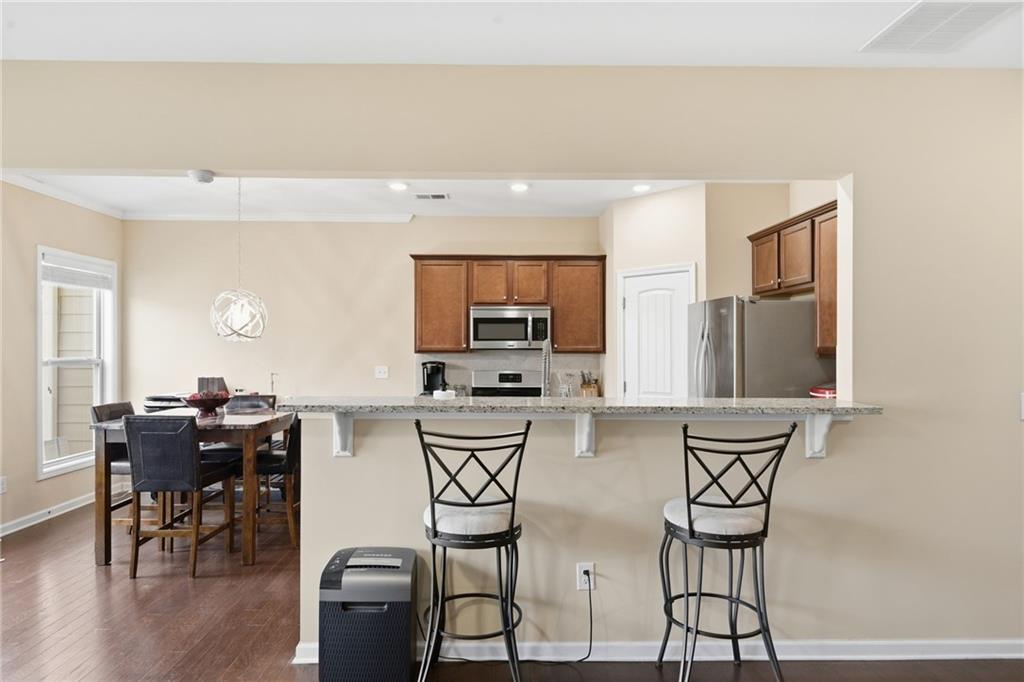 Welcome to Creekstone Village!Step into this stunning three-level home filled with thoughtful features and flexible living spaces. The open kitchen showcases granite countertops, stainless steel appliances, a dining or sitting area, and an oversized island with breakfast bar—perfect for everyday living and entertaining. Just off the kitchen, enjoy your morning coffee on the charming balcony.