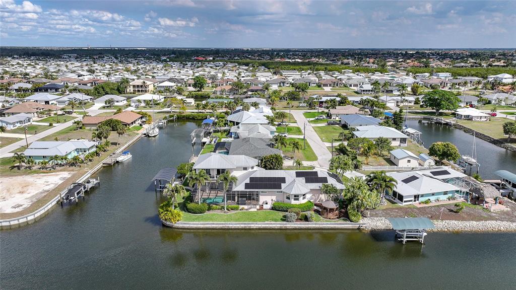 Experience the ultimate Southwest Florida waterfront lifestyle with this exceptional sailboat access canal home in Punta Gorda, offering over 4,100 square feet under air and designed for both luxury living and effortless boating.This impressive 4-bedroom, 3.5-bathroom waterfront home features a bi-level layout with expansive living spaces, soaring vaulted ceilings, and stunning water views from multiple areas of the home. The great room creates a bright and open atmosphere, perfect for entertaining or relaxing while overlooking the pool and canal.At the heart of the home is the chef-inspired kitchen, thoughtfully designed with two large islands, granite countertops and backsplash, wood cabinetry, stainless steel appliances, and elegant pendant lighting over the bar. The generous layout provides abundant prep space and seating, making it ideal for gatherings and everyday living.The first-floor primary suite is a true retreat, featuring beautiful views of the pool and sailboat-access canal, along with two spacious walk-in closets with custom built-ins. The luxurious ensuite bathroom offers a soaking tub, walk-in shower with rain-glass door, and dual-sink vanity, creating a spa-like experience at home. A second bedroom on the main level provides flexibility for guests or a home office. The adjacent bathroom also serves as a pool bath and includes additional storage and a rain-glass shower door. A convenient half bath off the kitchen adds extra functionality for guests.Upstairs, the third and fourth bedrooms share access to a walkout terrace overlooking the pool and canal, providing a private space to enjoy beautiful Florida sunsets and tranquil water views.Outdoor living is where this property truly shines. The large screened lanai features a sparkling pool, spa, and separate hot tub, creating the perfect setting for relaxing or entertaining year-round. Boating enthusiasts will appreciate the private dock and 9,000-lb boat lift, with quick 10–15 minute sailboat access to Charlotte Harbor and the Gulf beyond.Additional highlights include an 868-square-foot garage, hurricane impact windows, a durable metal roof, and 35 paid solar panels on the south and west sides of the home that keep electric costs remarkably low—a basic monthly electric charge from FPL of approximately 30. The property sits on a rare tip lot, providing excellent water frontage and scenic canal views. With no deed restrictions, there is plenty of flexibility to park RVs, boats, or trailers in the driveway.Ideally located just 10 minutes from historic downtown Punta Gorda, you'll enjoy easy access to waterfront dining, boutique shopping, marinas, parks, and entertainment while still enjoying the privacy of a peaceful canal setting.This property offers the rare combination of luxury waterfront living, quick sailboat access, energy efficiency, and no HOA restrictions—a true gem for those seeking the Florida boating lifestyle.