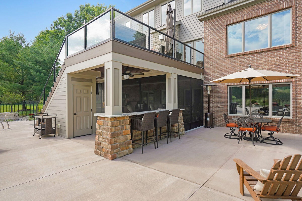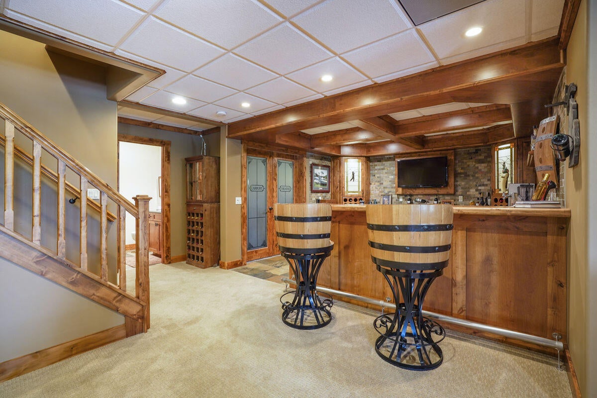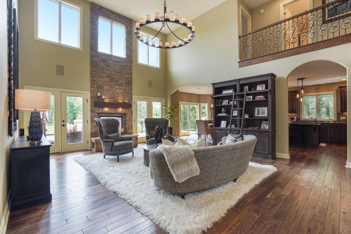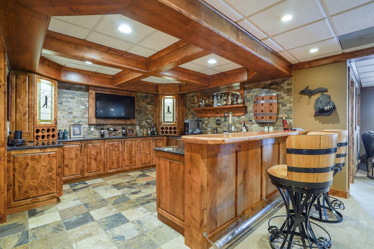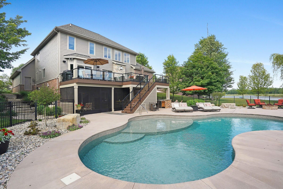 House of Distinction in Tullymore Resort Adjacent to Canadian Lakes. Welcome to a truly exceptional residence in the prestigious Tullymore Resort community, perfectly positioned adjacent to the beauty and lifestyle of Canadian Lakes. From the moment you arrive, the stamped concrete drive and striking arched stone entry set the tone for the elegance that awaits within. Step inside to soaring vaulted ceilings and a dramatic floor-to-ceiling, two-way fireplace that anchors the great room while also enhancing the expansive composite deck--creating seamless indoor-outdoor living.The thoughtfully designed main level showcases an outstanding floor plan, highlighted by a luxurious primary suite featuring dual walk-in closets and a spa-inspired bath complete with jetted tub, dual vanities, and a dedicated makeup counter. The chefs kitchen is both functional and stunning, offering rich cherry cabinetry, granite countertops, stainless appliances and oak wood flooring--perfect for entertaining or everyday living. Upstairs, youll find a comfortable sitting area, two generously sized bedrooms, and a full bath--ideal for guests or family. The walkout lower level is an entertainers dream, featuring a custom bar with double tap system, a spectacular home theater, a glass-accent wine cellar, a full second kitchen, and an additional bedroom and full bath for guests. Step outside to the expansive screened three-season room overlooking the resort-style outdoor living space. The kidney-shaped pool with sun shelf is surrounded by impressive landscaping, including a stone retaining wall, wrought iron fencing, a gas firepit, outdoor lighting, and a outdoor kitchen area--creating a private oasis for relaxation and entertaining. Additional highlights include meticulous wood detailing, coffered ceilings, a 3-car garage with ample storage, an under-deck drainage system, surround sound, and numerous newer appliances--reflecting both quality craftsmanship and thoughtful upgrades throughout. This is more than a home--its a lifestyle defined by luxury, comfort, and the best of resort living.