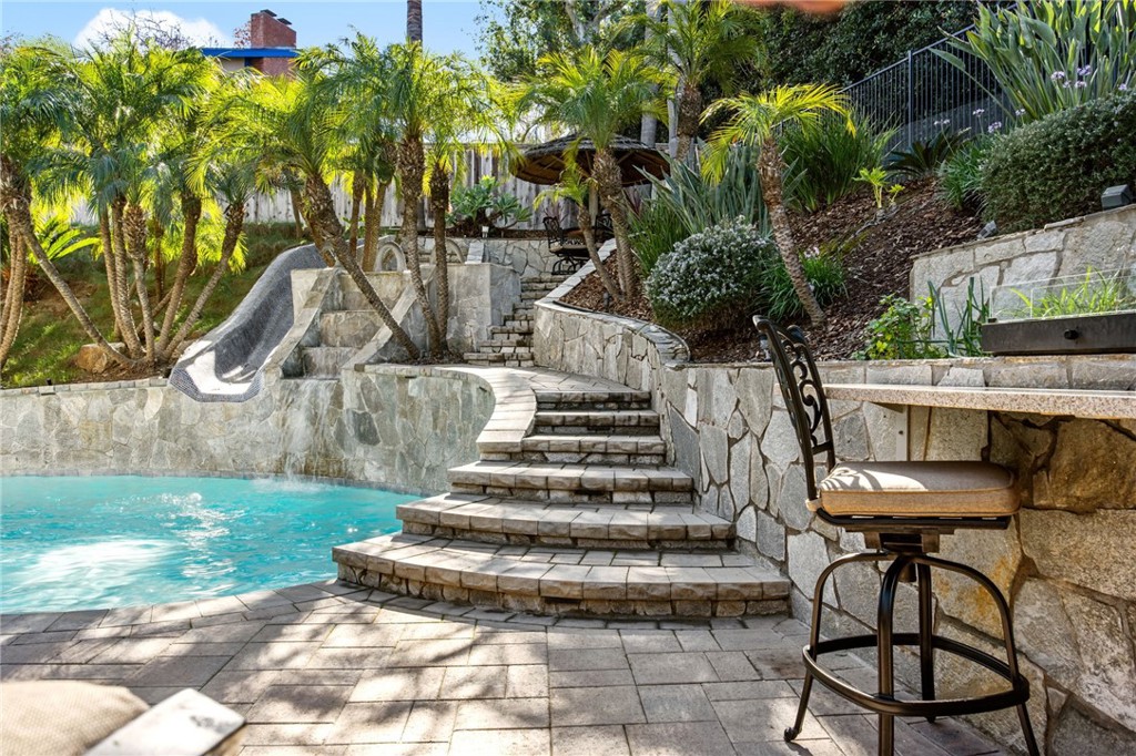The Bar Was Raised to Top Notch Platinum! This Home is The One, Cul-de-sac Pool Home, 4 Bedrooms, 3 full bathrooms, and 1 outside poolside bathroom with outdoor shower area. Upgraded features throughout include, newer roof, European custom kitchen cabinets and granite countertops, impressive stainless range hood, family room with media room features; surround sound, black-out shades and sound proof built walls. Newer windows, HVAC, 2 water heaters; 1 designated for primary master. A separate spiral staircase entry boasts a library/office space with all built in shelves and desk. Downstairs bedroom has built in desk and queen size murphy bed. Master bedroom and bathroom is extremely spacious, which includes a 2 person tub and vanity area. Side yard has front gate, for easy access to the backyard paradise, you can feel like your on vacation daily; waterfall, slide, palapa bar seating area, firepit, bar seating with countertop, best entertaining setup around. Lush tropical landscaping with the ultimate privacy on this corner lot. You won't find any better location, comfort and privacy like this one! Pride of Ownership shines in each room of this home, approaching 50 years of the family owning, one of kind! With additional bonuses, near by you have top-rated schools, shopping, and dining, this home offers the blend of everything! Finished garage with built in cabinets, ceiling storage racks, attic storage has finished floor and drop down ladder. Home also provides a security system and cameras. Neighborhood has parks, hiking trails, basketball, tennis and pickleball courts. Must visit to truly see everything, too many items to list it is worth a tour. Not to mention POOL was completely replastered!!Come See You Won't Want to Miss!!