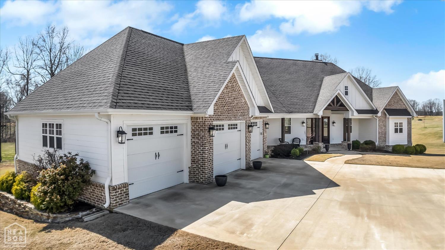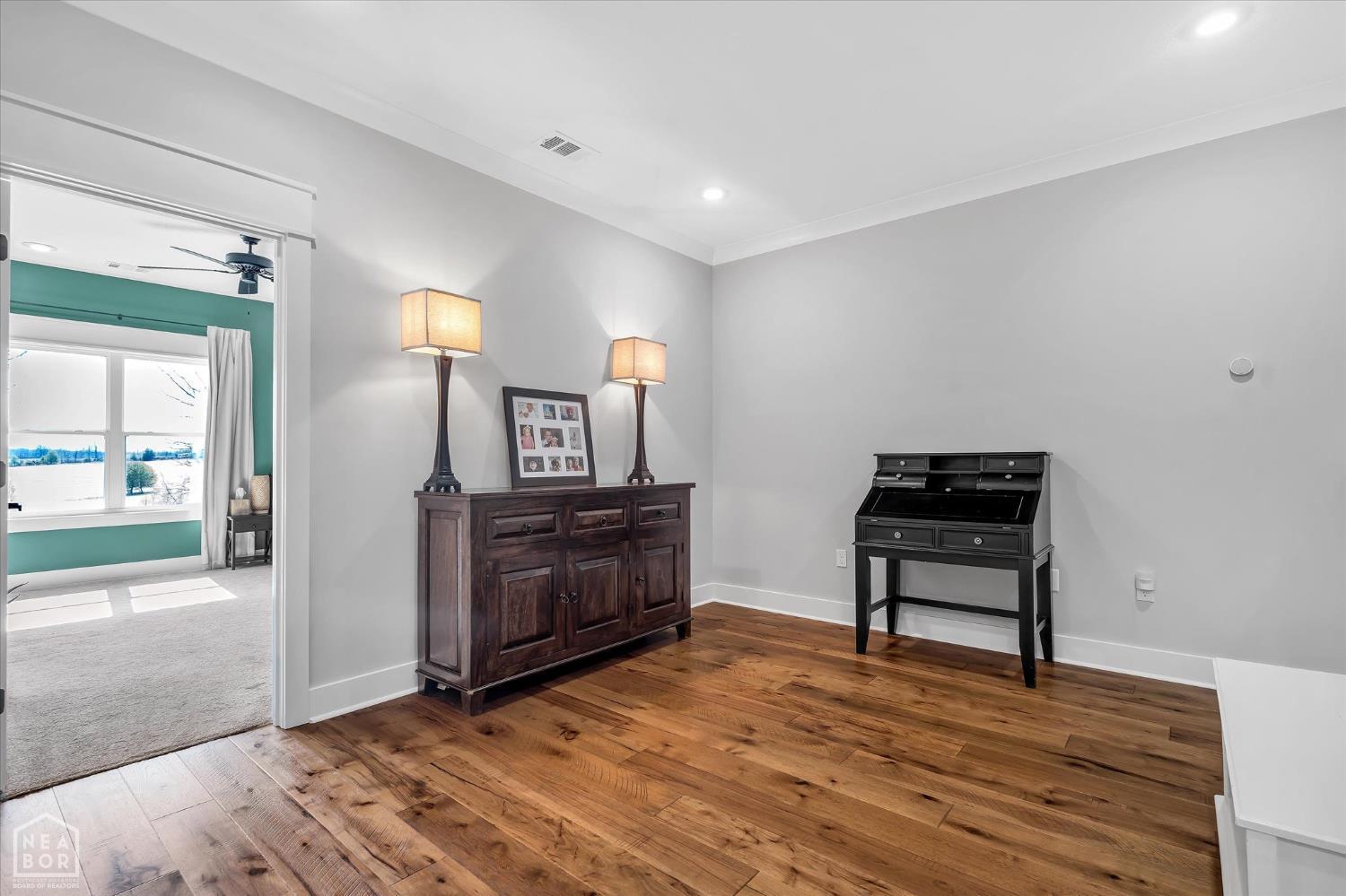 Built in 2019, this stunning custom home is in the highly desirable Greensboro Ridge, offering both privacy and stunning surroundings. Situated on 1.77 acres. Designed with comfort, filled with stunning natural light and perfect for entertaining! This 5-bedroom, 3.5-bath home features a thoughtfully laid-out floor plan across three levels. The main level has a spacious primary suite, a convenient half bath, a dedicated laundry room, and a private office. The living space centers around a cozy wood-burning fireplace, while the kitchen showcases granite countertops. Upstairs, you'll find two additional bedrooms with a jack and jill bathroom, along with an oversized bonus room and a separate seating area, ideal for a second living or play area. The fully finished basement with two more bedrooms and a partial kitchen complete with a covered basement walkout for guests or entertaining. A hidden safe room, cleverly designed behind a standard door for a seamless aesthetic, offers security along with plenty of storage space. The basement also features a workshop area with a garage door, providing easy indoor-outdoor access. This home truly has it all!
