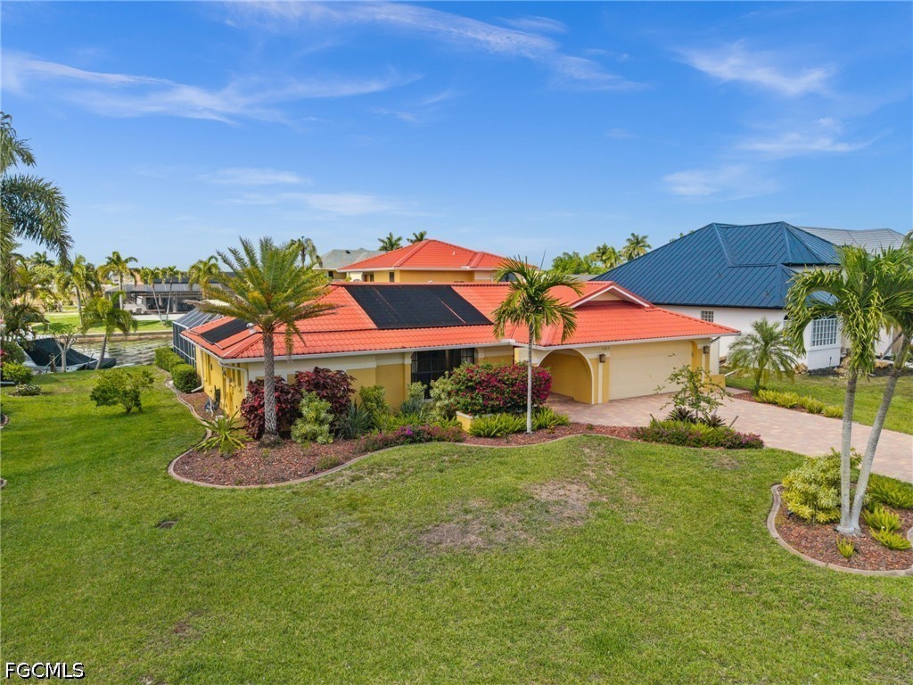 JUST A SHORT BOAT RIDE AND NO BRIDGES TO OPEN WATER! DIRECT GULF ACCESS, 2-STORY HOME WITH 2 PRIMARY SUITES, POOL, AND 125-FOOT WIDE CANAL VIEWS! Welcome to 1223 SW 51st St in the sought-after Unit 64 area of SW Cape Coral. This 4-bedroom den, 3 bath, 2-story waterfront home offers 2,856 square feet, a DIRECT DEEP WATER SAILBOAT ACCESS location, and one of the boating setups serious boaters are looking for. Situated on the Finn Canal, a 125-foot-wide canal off the Gloriana Canal, this home offers NO BRIDGES and NO LOCKS, with quick access out to the Caloosahatchee and on toward the Gulf, beaches, Cape Harbour, Tarpon Point, and more. The cul-de-sac location adds to the appeal, while the wide canal views, mature neighborhood, and established lot give this property a setting that is hard to duplicate. The homeowners also note a major recent investment in the outdoor waterfront living, including lanai pavers, pool tile and surfacing, balcony work, and an expansion-ready dock. Inside, the layout is flexible and spacious, with two separate living areas, a bright open kitchen, indoor and outdoor dining flow, and a den that works well as an office, bonus room, or extra gathering space. One of the standout features is the TWO PRIMARY SUITES, one downstairs and one upstairs, making the home especially appealing for multigenerational living, guests, or buyers who want extra privacy. The upstairs primary suite occupies the second floor and includes its own waterfront sitting area and private balcony, while the downstairs primary suite offers convenient access to the pool area. The guest bedrooms are generously sized, and the guest bath doubles as a pool bath with a large soaking tub. The kitchen and interior finishes were updated with the kind of improvements buyers will notice, including custom soft-close cabinetry, quartz countertops, updated appliances, and tile flooring that fits the Florida boating and pool lifestyle well. Major system and feature updates include a metal roof, 2 complete A/C systems, updated electrical panel, water heater, impact-resistant windows in key areas, custom shutters, new interior and exterior paint, remodeled baths, LVP flooring upstairs and on the stairs, epoxy garage floor, and more. The pool is solar heated and has an above-average size and depth, with an approximately 6-foot deep end. The property is also wired for fiber internet. If boating, poolside living, and a prime Southwest Cape Coral location are on your list, you need to see this home!