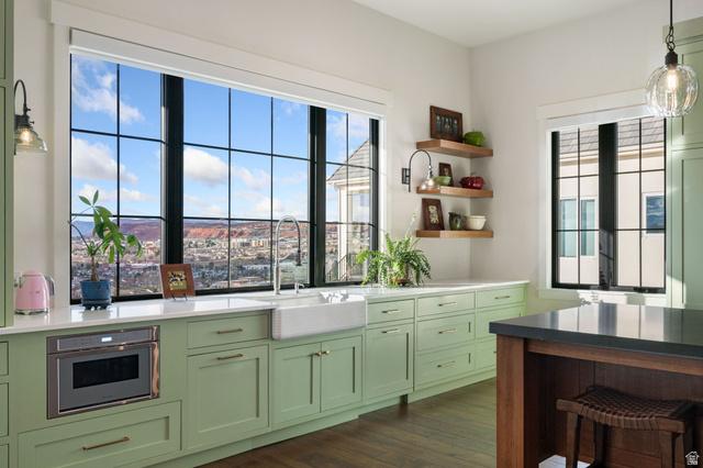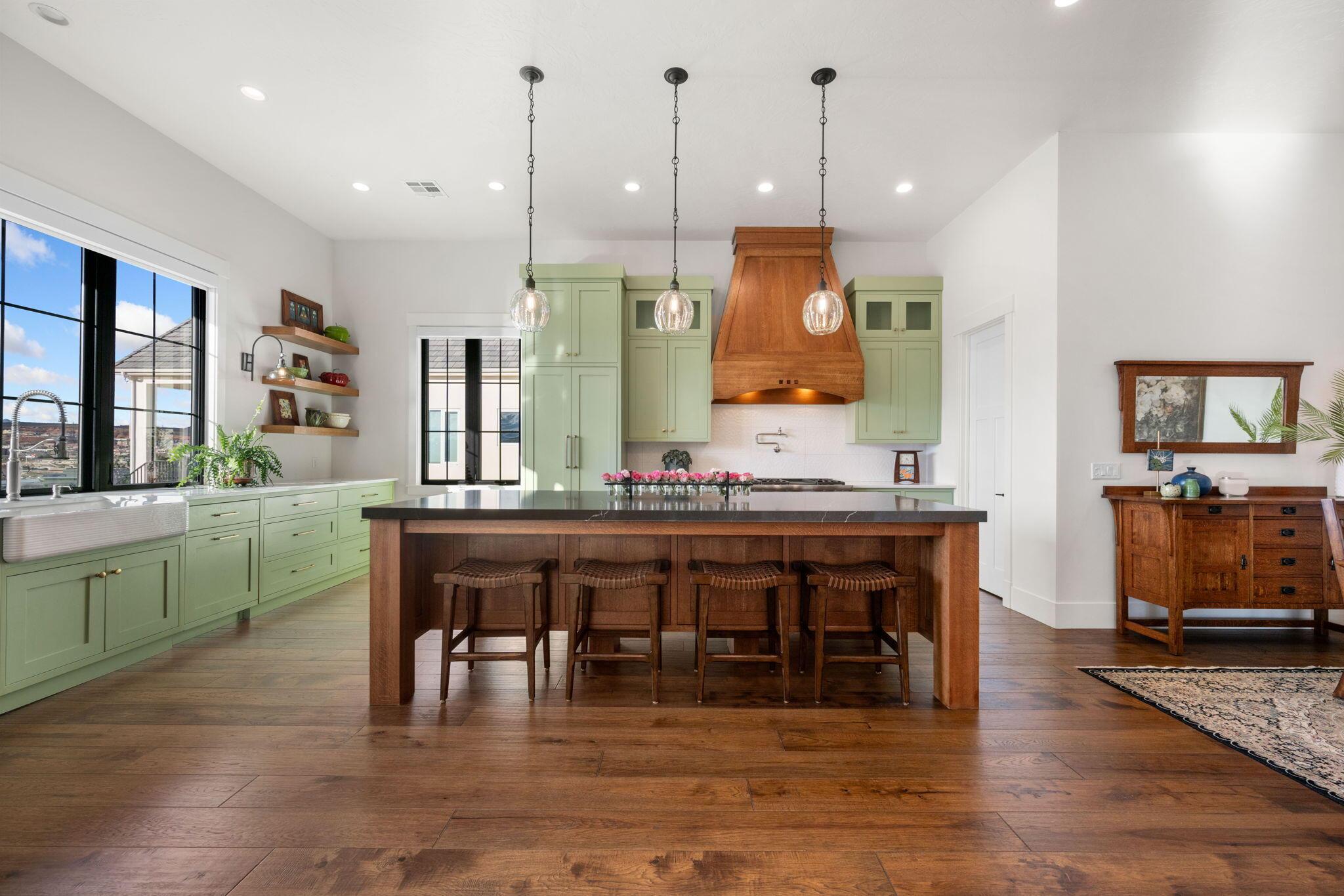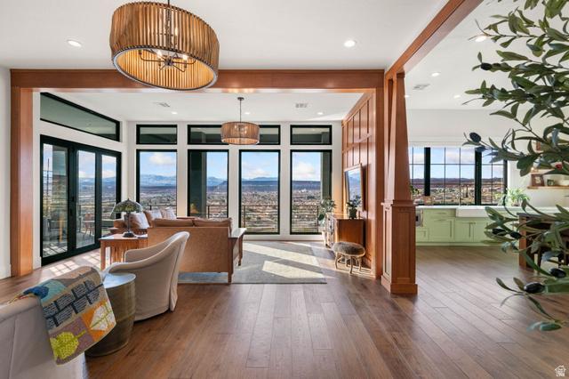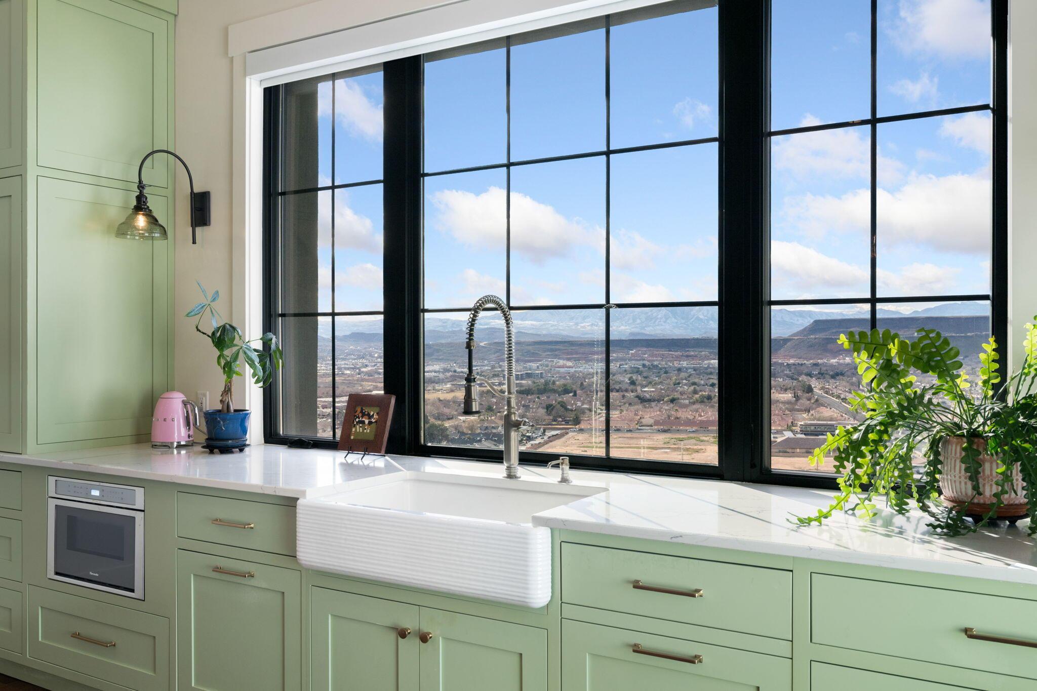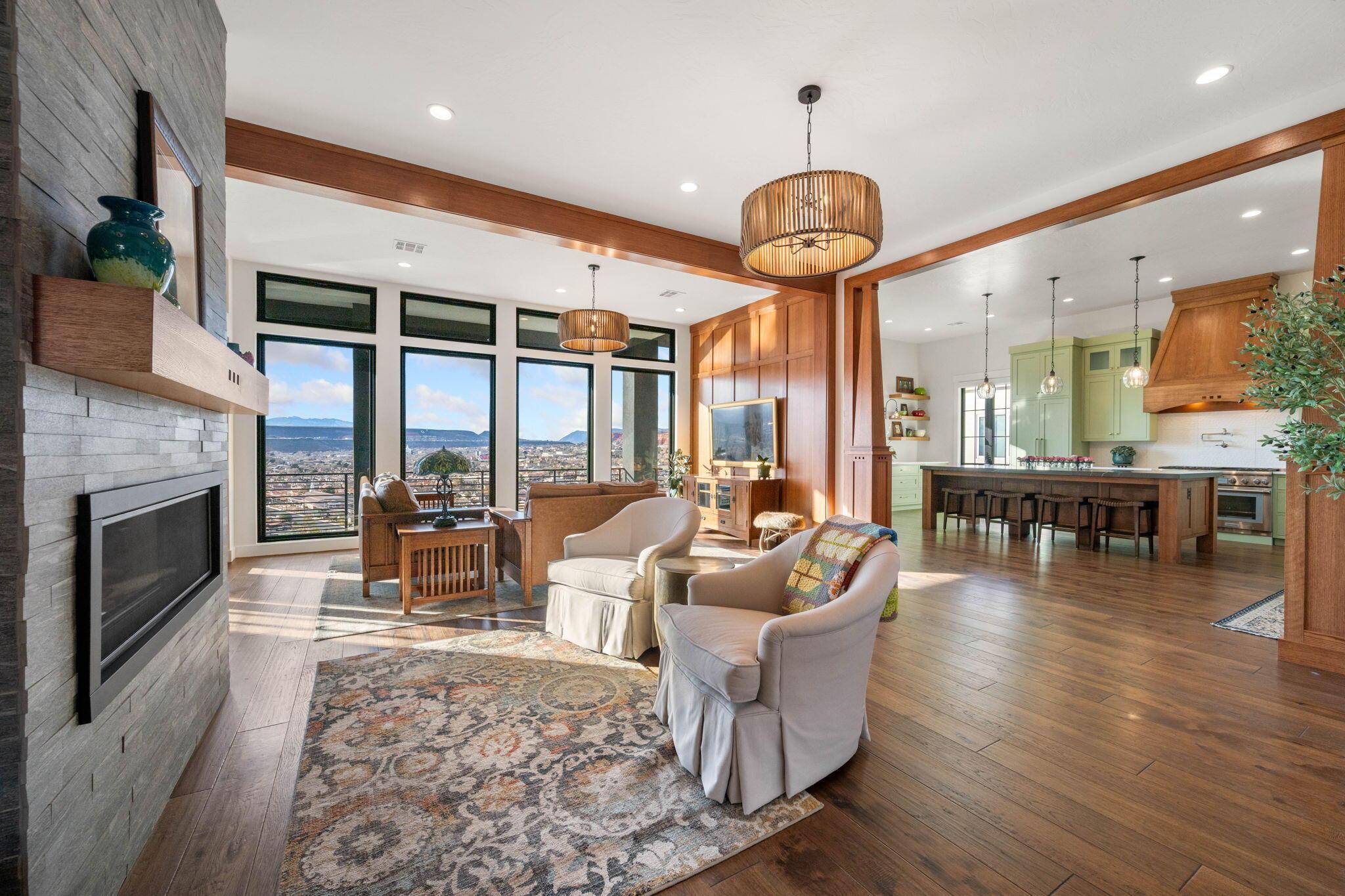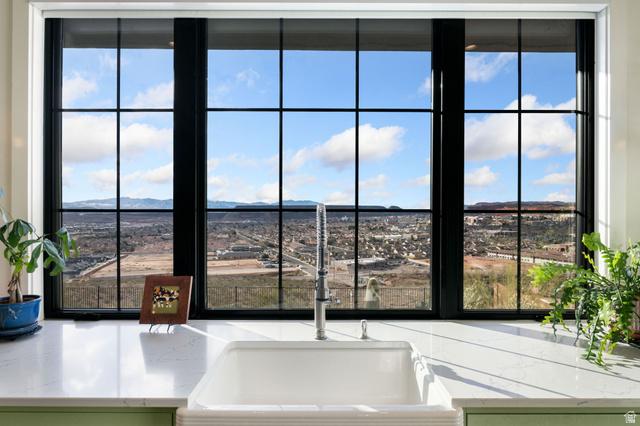This gorgeous home was built and designed to impress with an open floor plan and unobstructed views, perfectly perched on South Rim at Foremaster. Step outside to a backyard oasis with a large in ground pool featuring a baja shelf, two umbrella stands, and an extra-large spa that seats 8. The kitchen features 12 ceilings, a large island, upgraded appliances, and endless views from the window. The living room showcases dramatic floor-to-ceiling windows beneath soaring 11 ceilings, while the entry rises to 13. A stunning 10-panel folding glass door functions as both a standard door and an accordion system, opening to a wide 10-foot span for seamless indoor-outdoor living. The home offers 5 bedrooms, including two primary en-suites - one with an 11-13 tray ceiling, and 5.5 bathrooms. Enjoy covered patios and an expansive deck with unobstructed views of downtown St. George, Tech Ridge, Red Mountain, and the distant Utah mountains. Exterior highlights include fully fenced and landscaped yards, a gated driveway perfect for trailers, and a spacious courtyard with a raised stucco planter and water feature. Low-maintenance xeriscape includes a 10-foot saguaro cactus, drip irrigation, and a tiered front yard. Additional features include an oversized 3-car garage with epoxy floors and a steel front door with a convertible glass panel. No HOA, minutes to Intermountain Hospital and downtown St. George.