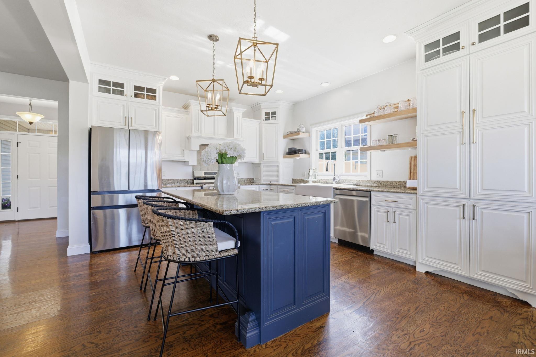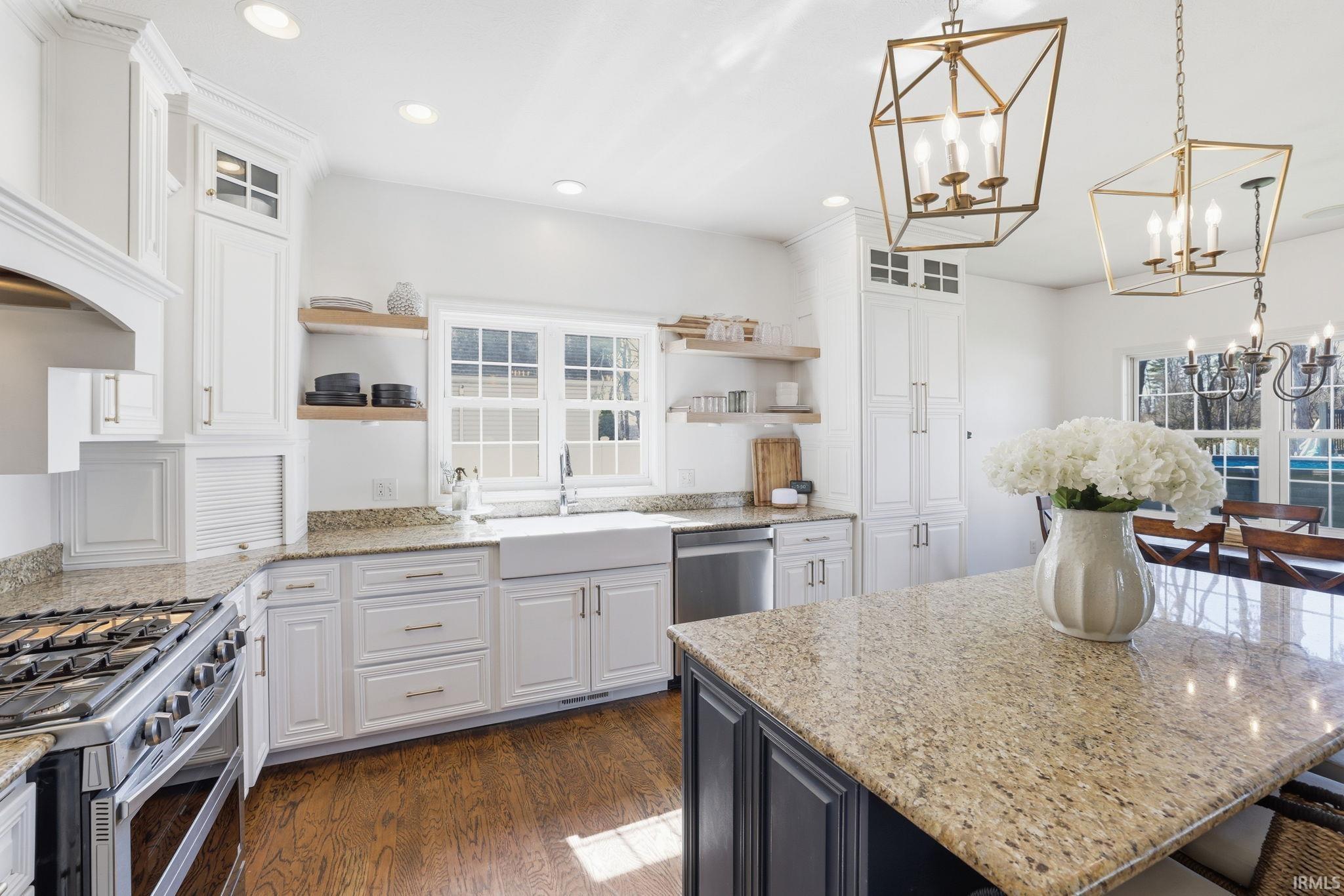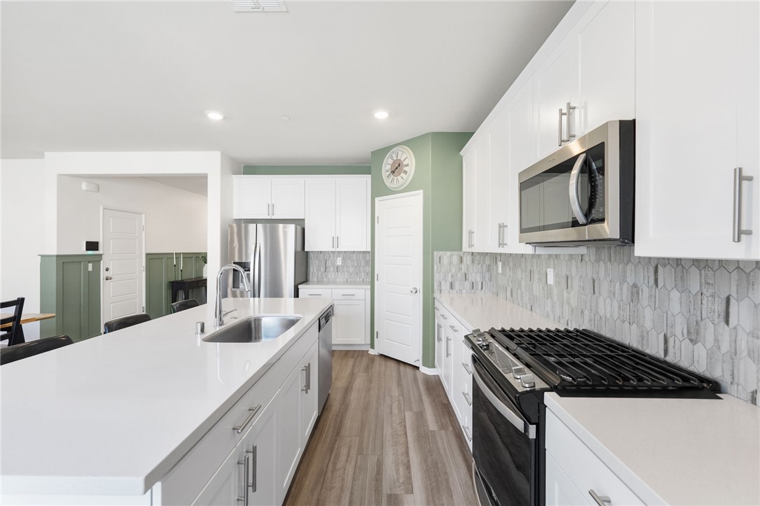 Welcome to this beautifully remodeled home where modern design meets everyday comfort. The stunning kitchen is a true showpiece, featuring a large center island, sleek white cabinetry, premium Cafe appliances, elegant quartz countertops complemented by a seamless quartz backsplash. Striking light fixtures add a sophisticated touch throughout.