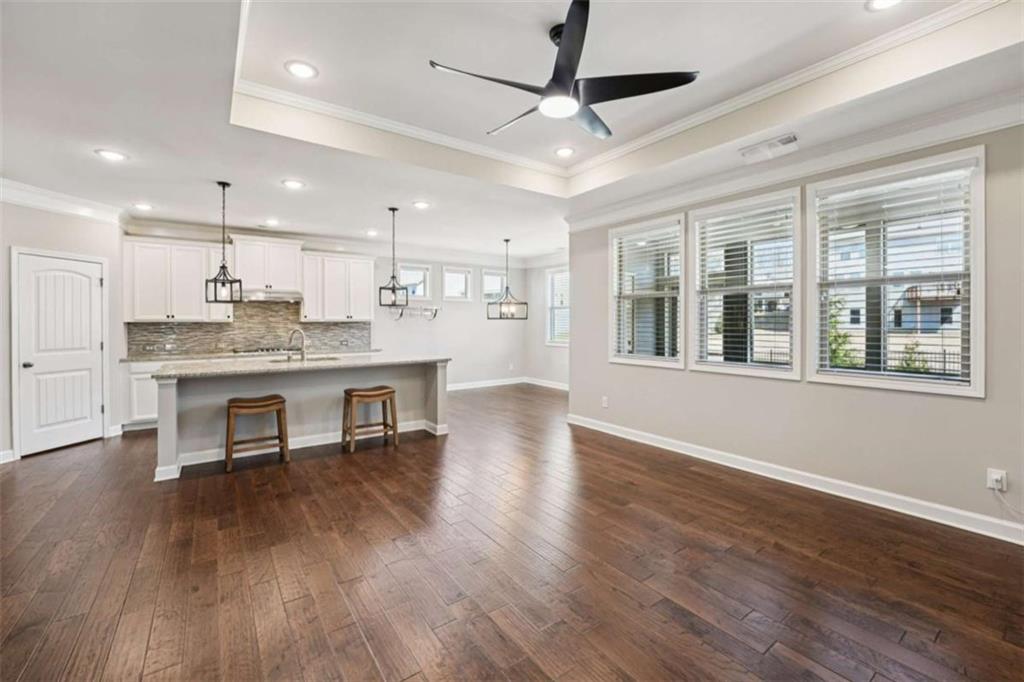 Two-story home offering 3 bedrooms and 2.5 bathrooms with 1,491 sq ft of living space on a 5,400 sq ft lot. The interior features an open-concept living and dining area with vaulted ceilings and recessed lighting, creating a bright and functional layout.