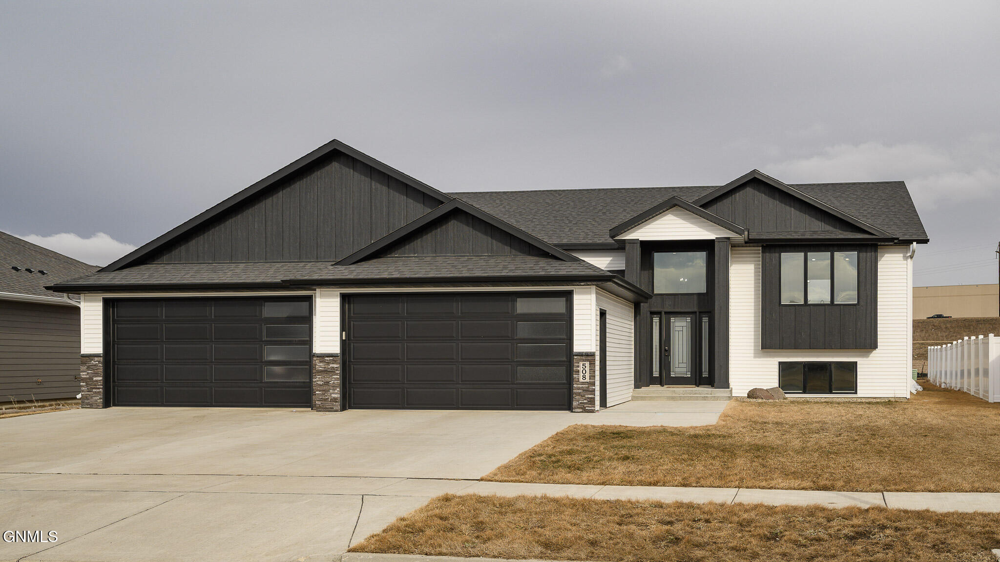 Located in NW Bismarck, this home is ready for its next chapter. A spacious entry welcomes you inside and leads to an impressive upper level featuring a bright, open floor plan designed for everyday living.The kitchen is stylish with white cabinetry, a center island, and all appliances included. Vaulted ceilings enhance the open feel as the living room, dining area, and kitchen connect seamlessly.The upper level includes a primary bedroom with a private bath and a generous closet, along with a second bedroom and full bathroom.The lower level expands the living space with a large family room that also serves beautifully as a recreation area, highlighted by an electric fireplace. Two additional bedrooms and a ¾ bathroom provide additional living space.Practical features continue with a separate laundry room, a large storage closet lined with shelving, and additional under-stair storage.Car enthusiasts and hobbyists will appreciate the fully finished and heated four-stall garage, offering exceptional space year-round.Outside, the yard is complete with a sprinkler system and a Maintenance free deck, creating an enjoyable outdoor setting.A wonderful opportunity in a NW Bismarck location near schools and everyday conveniences--this home is truly move-in ready
