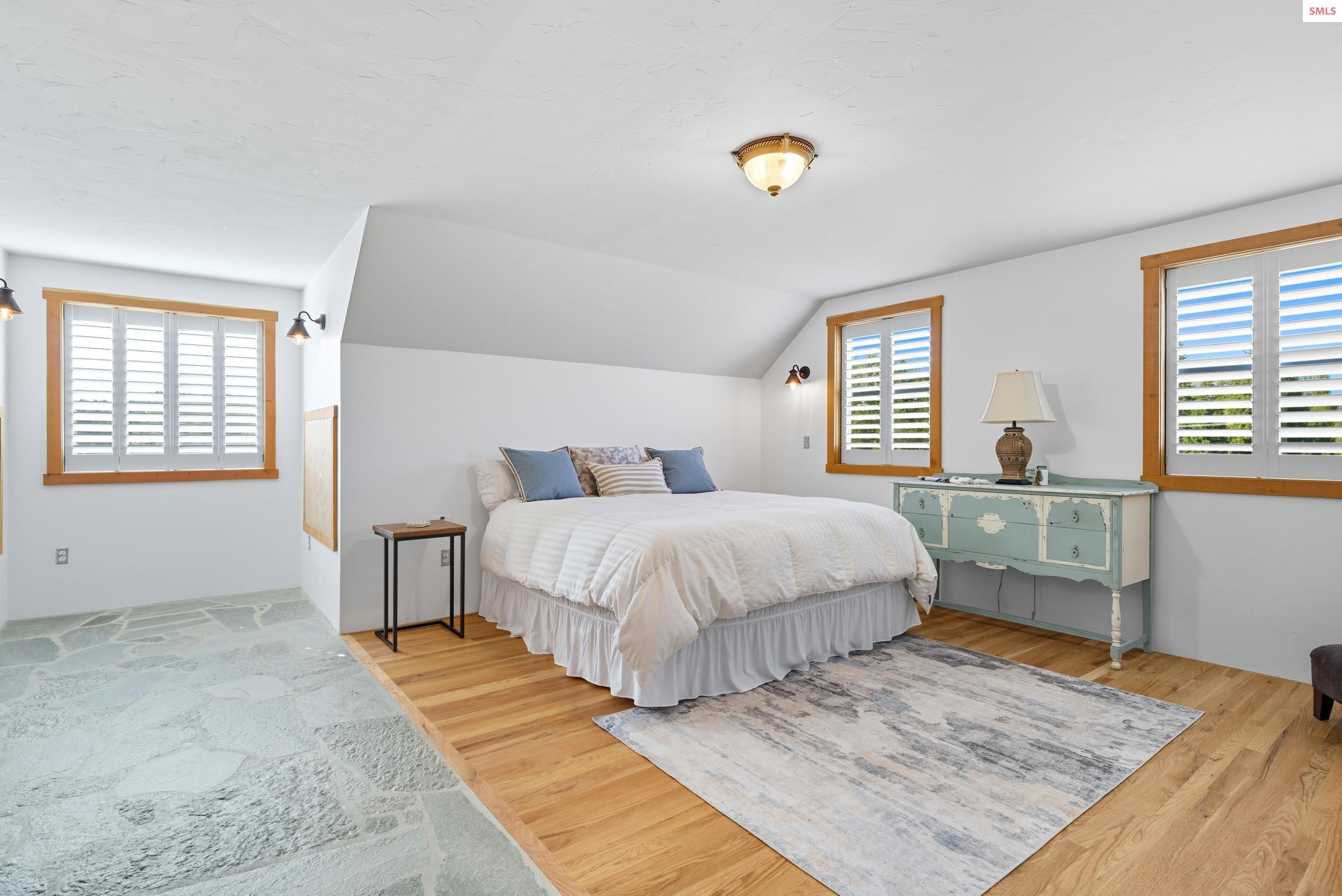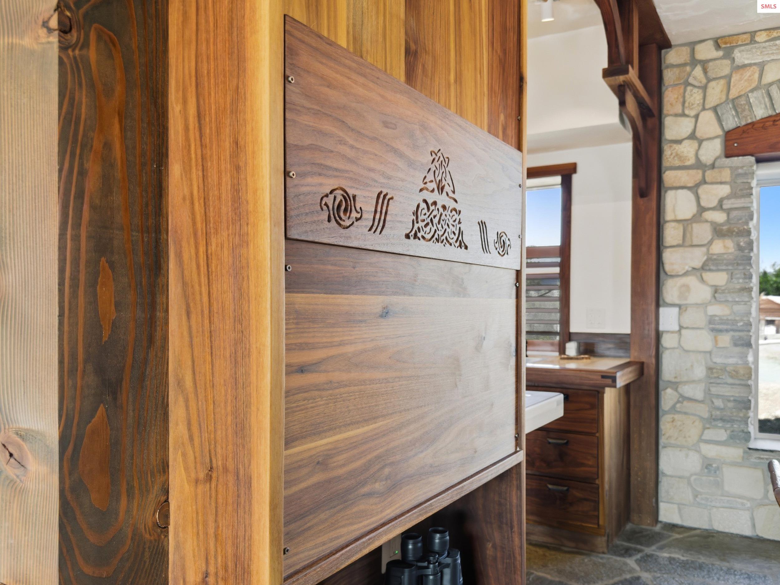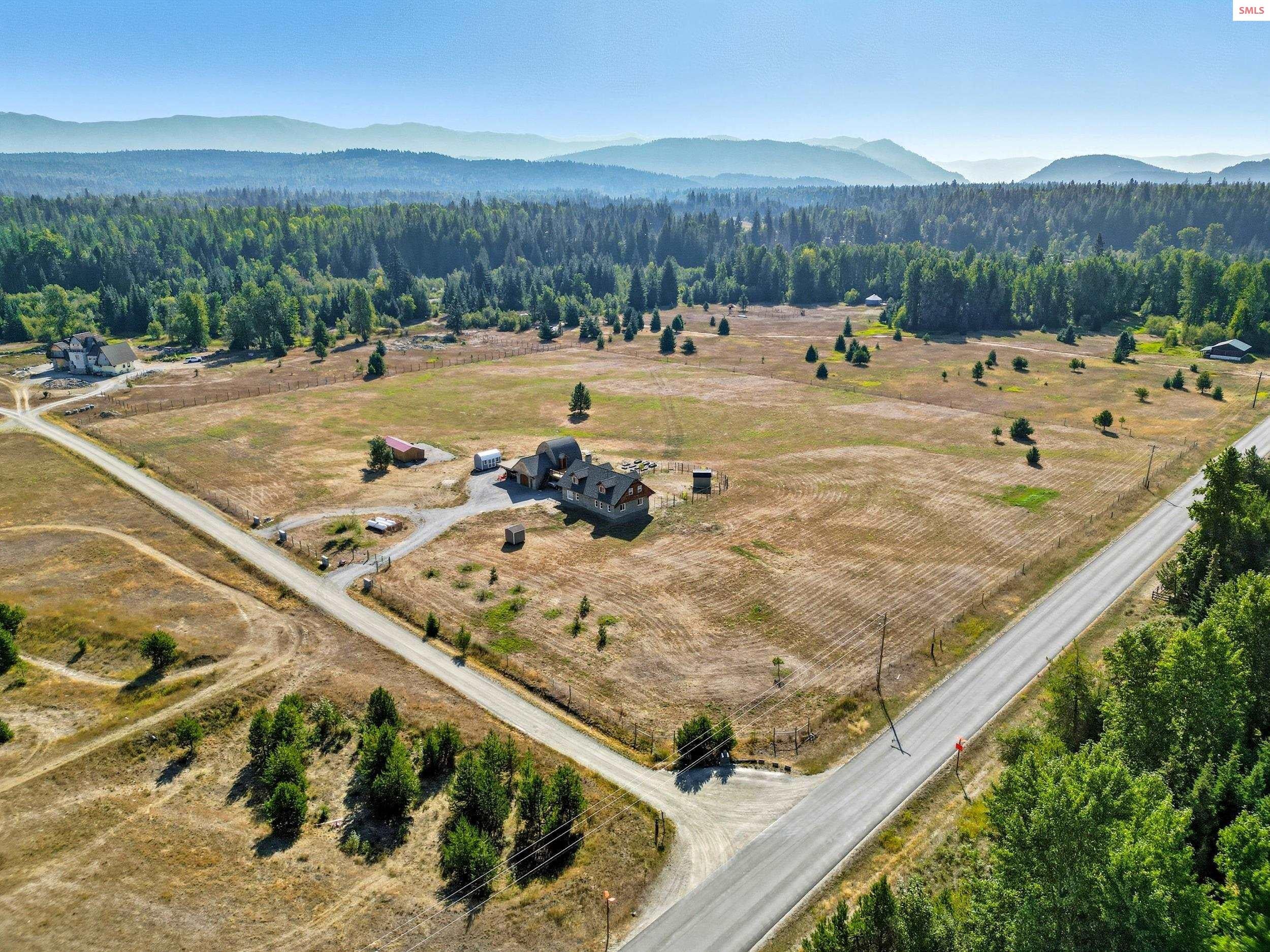 Welcome to your private storybook escape on 10 pristine acres with Grouse Creek frontage. This extraordinary stone estate, built by a renowned castle builder, blends old-world craftsmanship with modern comfort. Set at the end of a private drive in Sandpoint’s picturesque Selle Valley, the home captivates with its dramatic rooflines, hand-laid shingles, and porte cochere entry, all surrounded by fenced meadows, treed horizons, and serene creek frontage. A 40x50 gravel pad is already in place, ideal for a future barn, shop, or additional structure. A propane Generac generator, supported by two 1,000-gallon propane tanks, provides exceptional peace of mind during wind and snow storms, ensuring reliable power to the property year-round. Crafted entirely of timeless materials, the residence features double wall construction with river rock exterior, stone interior walls, solid oak and quartzite slate floors with in-floor hydronic heating, a tankless on demand gas water heater for hot water all the time and an additional 50-gallon backup hot water heater. The entire system of the home can run on a backup gas powered generator or tie into solar power for self-reliability at all times. Inside, every detail reflects artistry: custom dark walnut cabinetry, walnut-trimmed windows and porcelain countertops, Norman wood shutters, Hunter Pirouette shades, solid wood doors, and exquisite hand-carved accents including a detailed banister and arches. A Russian inspired dual-use open flame brick fireplace and woodstove adds extra warmth on those long cold winter nights emitting heat from the thermal stone mass of custom laid bricks. Imported Bertazzoni ovens from Italy enhance both the homes function and design. Adding to the magic, the gothic-inspired garage features front and back handcrafted carriage-style doors that swing open, whimsical wide-plank man doors, and an additional attached carport. Above the garage, a sunlit studio and spa retreat await. The studio showcases floor-to-ceiling picture windows, a mini woodstove, artist loft, wet bar with wine fridge, and a spa-inspired bath with soaker tub and full sauna. A hand-carved balcony overlooking the property completes this retreat, while the porte cochere with an expansive open deck seamlessly connects the studio to the main house. This is a home where castles inspire, fairy tales begin, and old-world charm awaits. A one-of-a-kind estate crafted with a level of artistry that cannot be replicated. A rare residence that evokes timeless European charm for generations to come. With its private setting and separate studio retreat, the property also offers exceptional potential as a bed and breakfast or short-term rental destination.