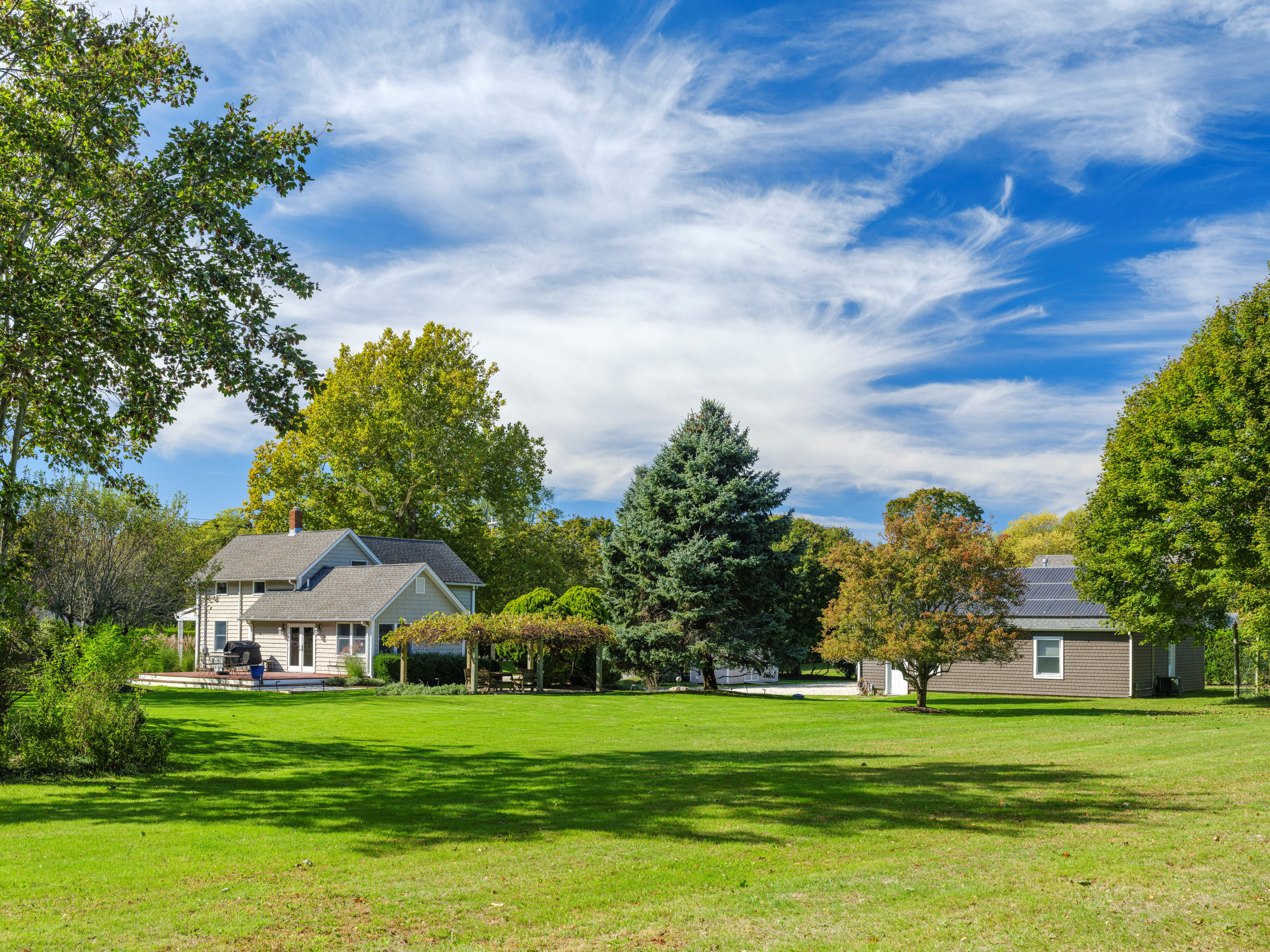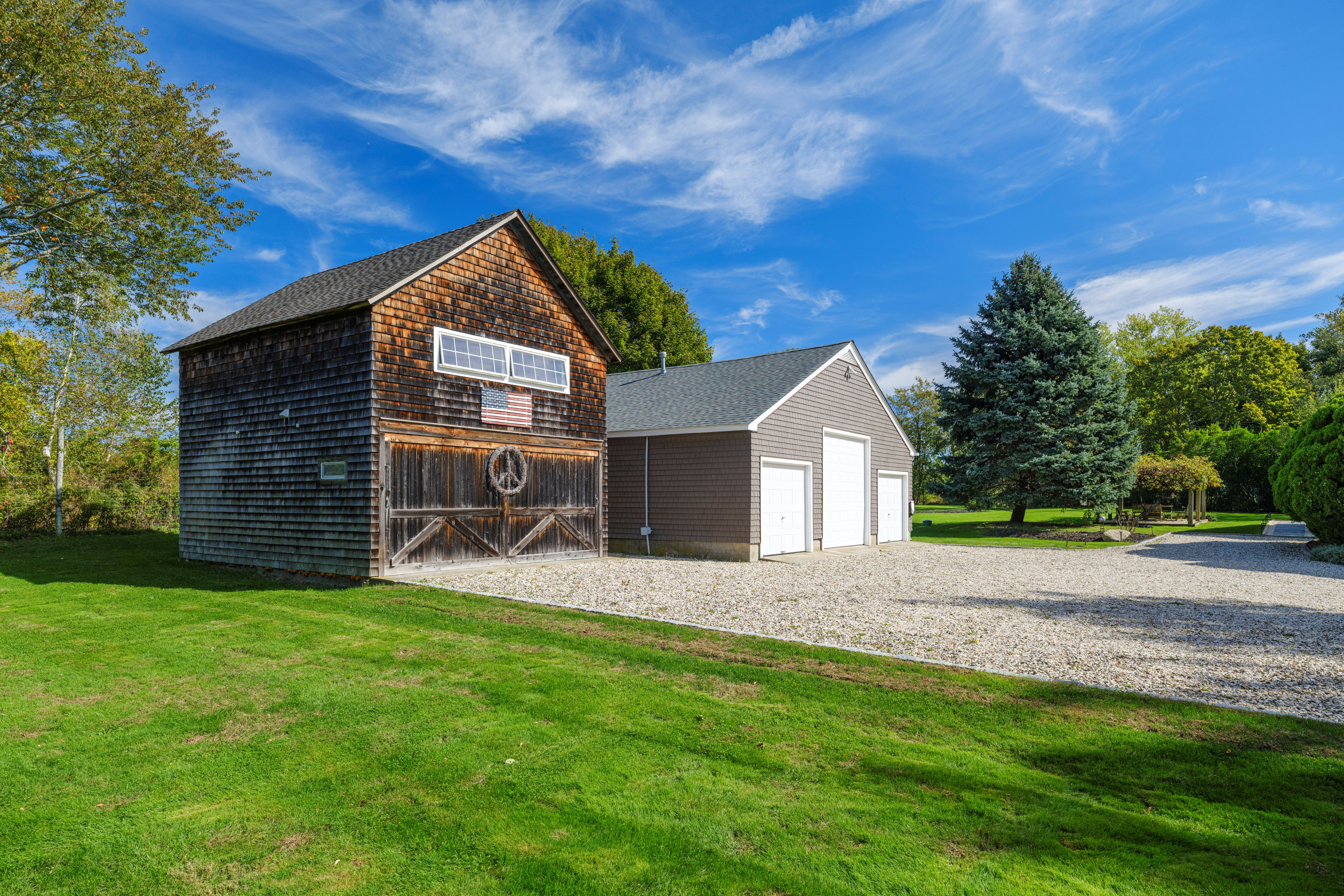 Set on 1.16 acres of beautifully landscaped and private grounds, this charming North Fork property offers space, versatility, and serene farm vistas. The main home features 4 bedrooms, 1.5 baths, an eat in kitchen, living room, and sitting area filled with natural light. A remarkable 6 car garage currently houses a Michael Phelps lap pool with hot tub and sauna, creating a unique year round wellness retreat and offering endless possibilities for a contractor, artist, car enthusiast, or home gym. A separate guest house barn with wood burning stove provides additional comfort and flexibility. Solar panels with EV charging keep electric costs extremely low, approximately 17 per month. Central air, oil heat, and public water add convenience. Mature landscaping, exceptional privacy, and room for a pool or tennis or pickleball court complete this special offering.