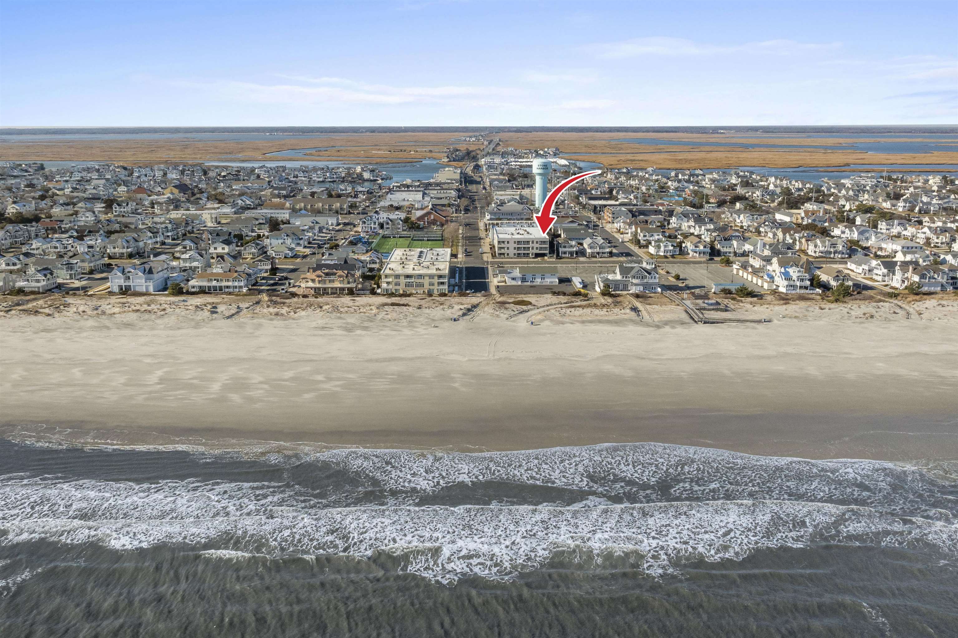 Opportunity to own on iconic 96th Street Stone Harbor, just a half block to the beach. This top-floor Beach Club residence offers parking plus secured storage for all your beach gear. New recreation facilities across the street include an expansive and inclusive playground, 6 shuffleboard courts, 2 synthetic turf bocce courts, 3 all-weather soft tennis courts, 3 platform tennis courts and a basketball court. After relaxing at the beach or playing across the street head down to the center of Stone Harbor's entertainment district. Enjoy shopping, mini golf and ice cream, waterfront dining, or cocktails and a movie just a block away. Take the Beach Club elevator to the top floor and step into Unit 304, refreshed with bright finishes by an island interior designer. Highlights include quartz countertops and premium vinyl plank flooring for lasting style and easy maintenance. A tiled entry opens to the main living area with kitchen, dining, and living room, illuminated by large glass doors leading to a covered balcony. Enjoy an ocean view from the balcony, perfect for checking beach conditions from the comfort of home. Inside, the spacious primary suite offers flexible layout options plus a dressing area, walk-in closet, and double-shower en suite. With two bedrooms, two full baths, laundry, ample closet space, an open living area, and a large balcony, this condo is a standout in Stone Harbor.