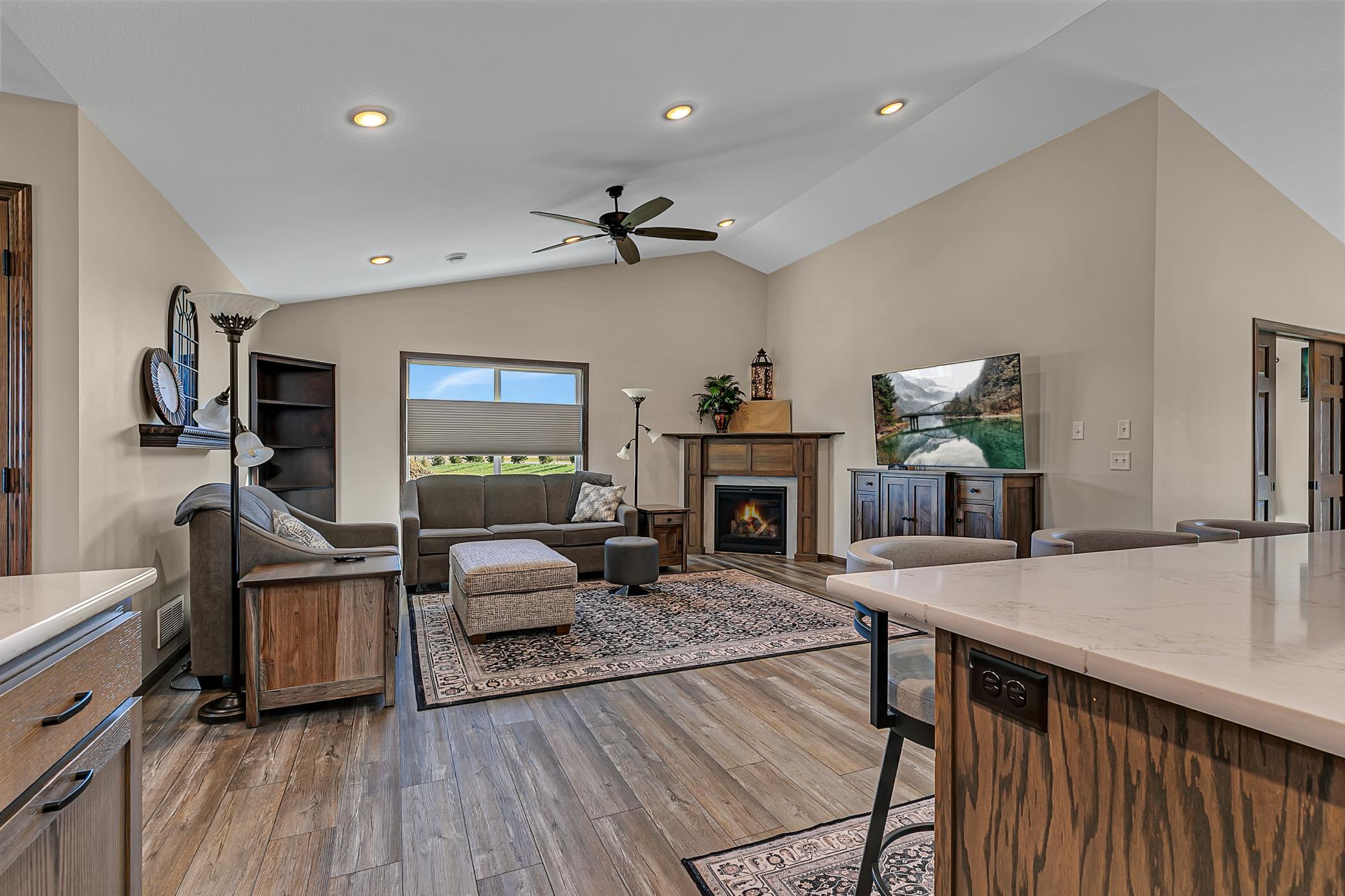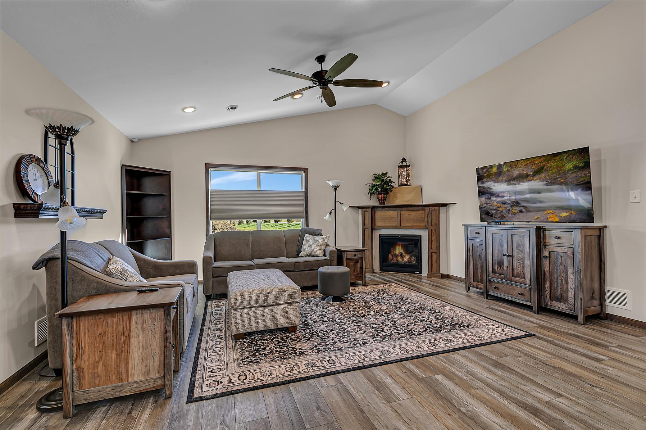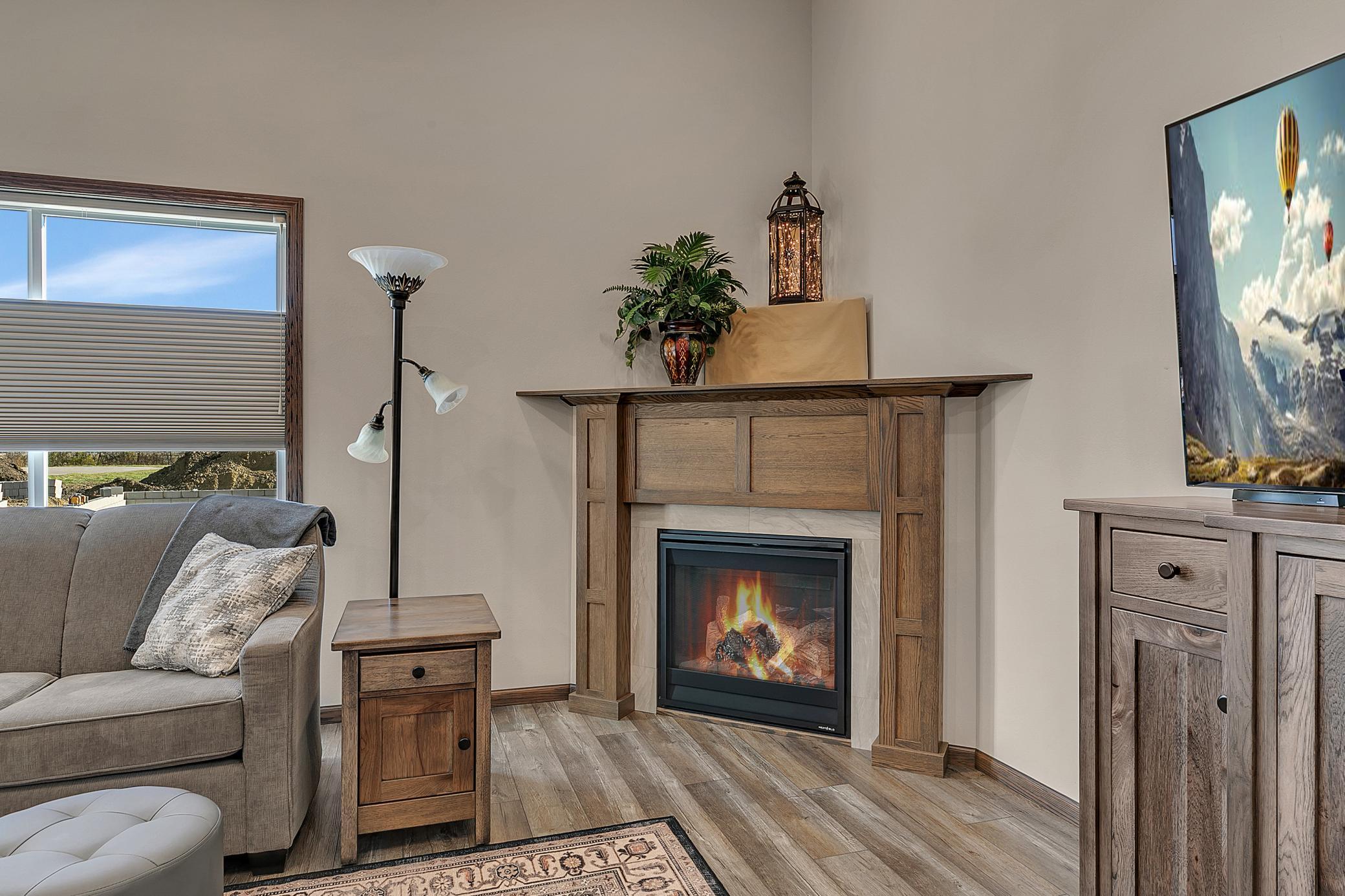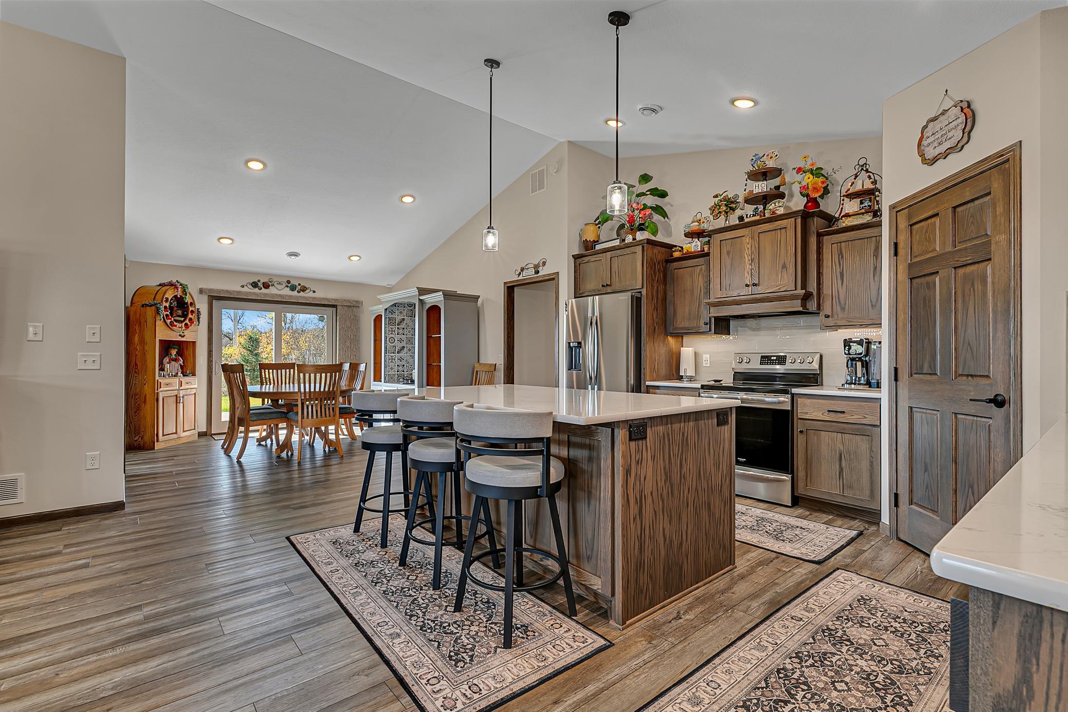 Discover effortless luxury and timeless design in this beautifully crafted 3-bedroom, 2-bath patio home, where every detail reflects quality and comfort.Step inside to experience a warm, open-concept layout with vaulted ceilings spanning the foyer, bathroom, living room, dining area, and kitchen—flooded with natural light and designed for both style and function. The home offers true one-level living with luxury flooring and in-floor heat, recessed lighting, and refined finishes throughout.The heart of the home is a stunning kitchen featuring quartz countertops, a large center island with additional storage and outlets, a tiled backsplash, a walk-in corner pantry, stainless steel appliances, a custom drawer microwave, and abundant soft-close cabinetry.Additional highlights include an elegant gas fireplace, a secure safe room, advanced security system, reverse osmosis system for drinking water, a four-season sunroom with pocket doors, a sand point well used for the in-ground sprinkler system, and a spacious laundry room with motion-activated lighting for added convenience. Outside, two storage sheds provide additional space.The heated 3-stall garage, equipped with two heaters, provides ample space for vehicles, storage, or use as a workshop. With no stairs and no association restrictions, this home combines sophistication, comfort, and independence—crafted for those who appreciate quality at every turn.