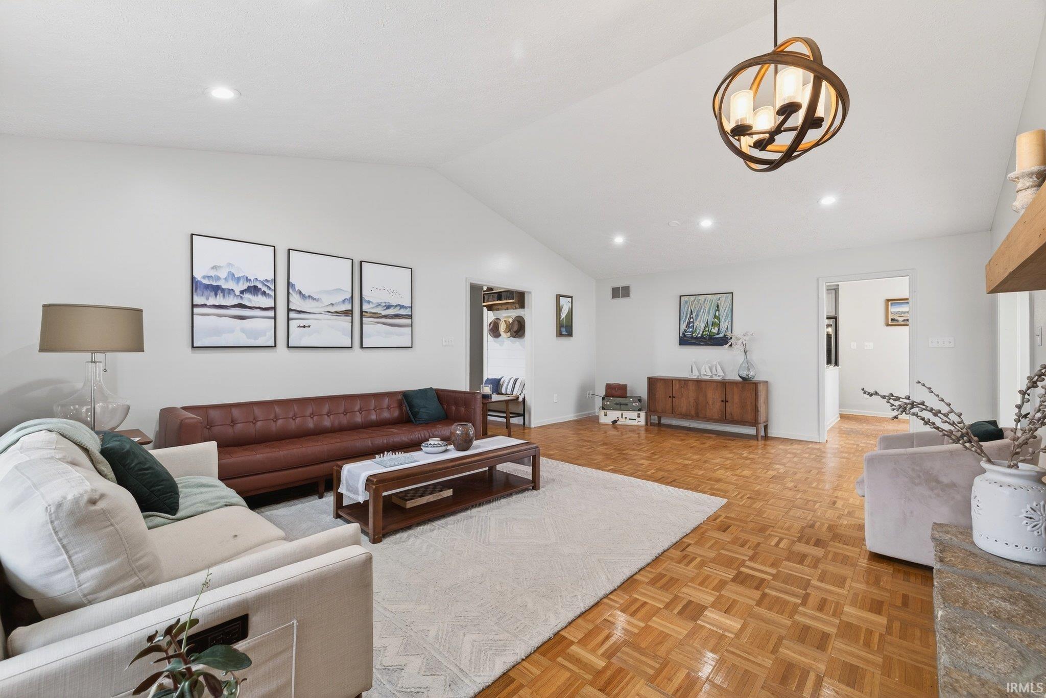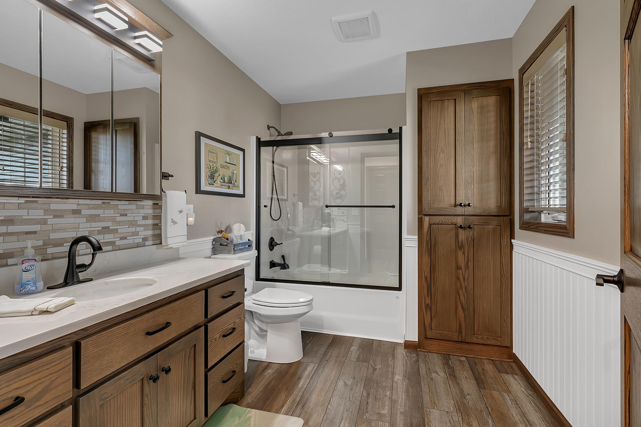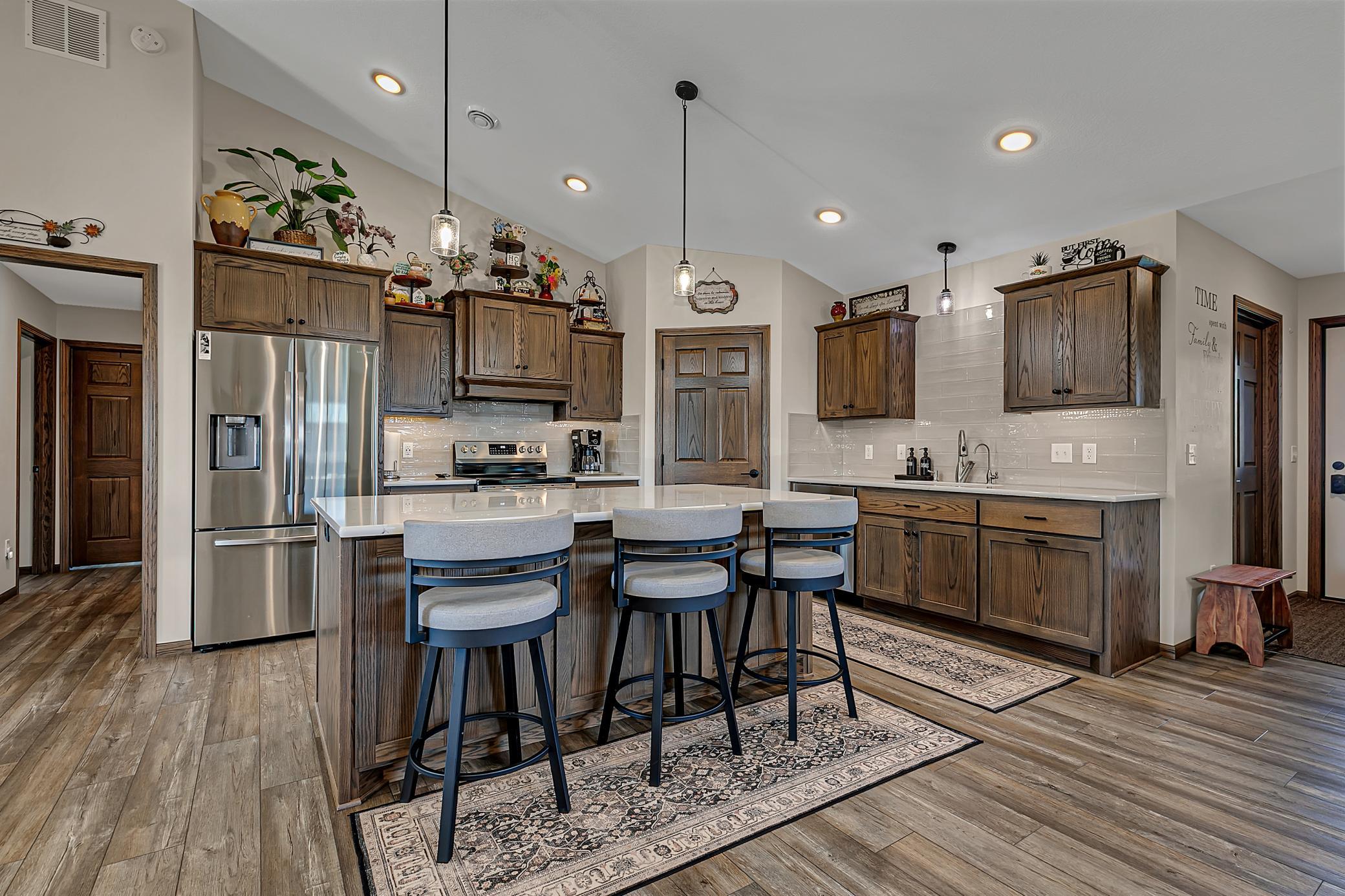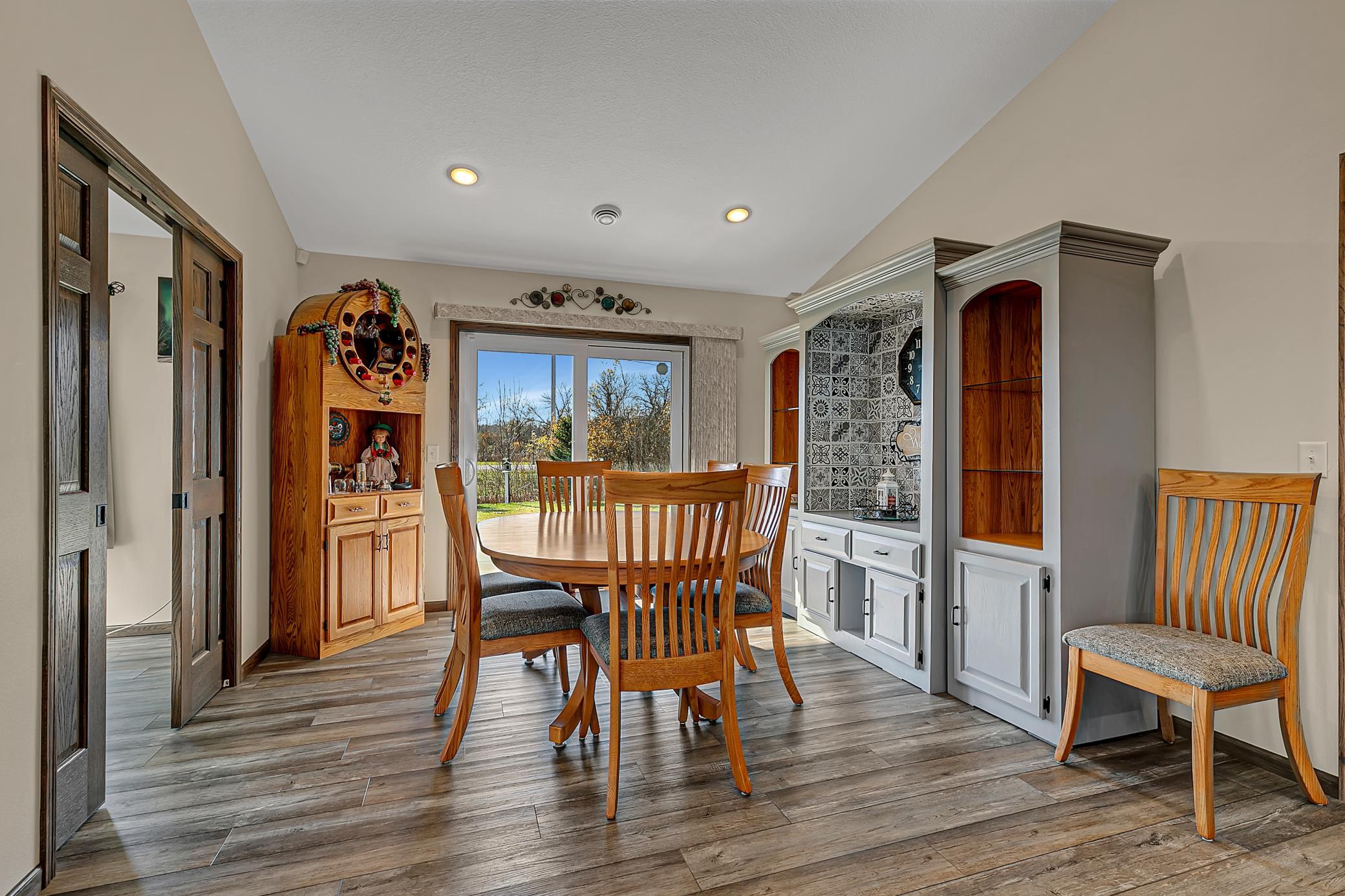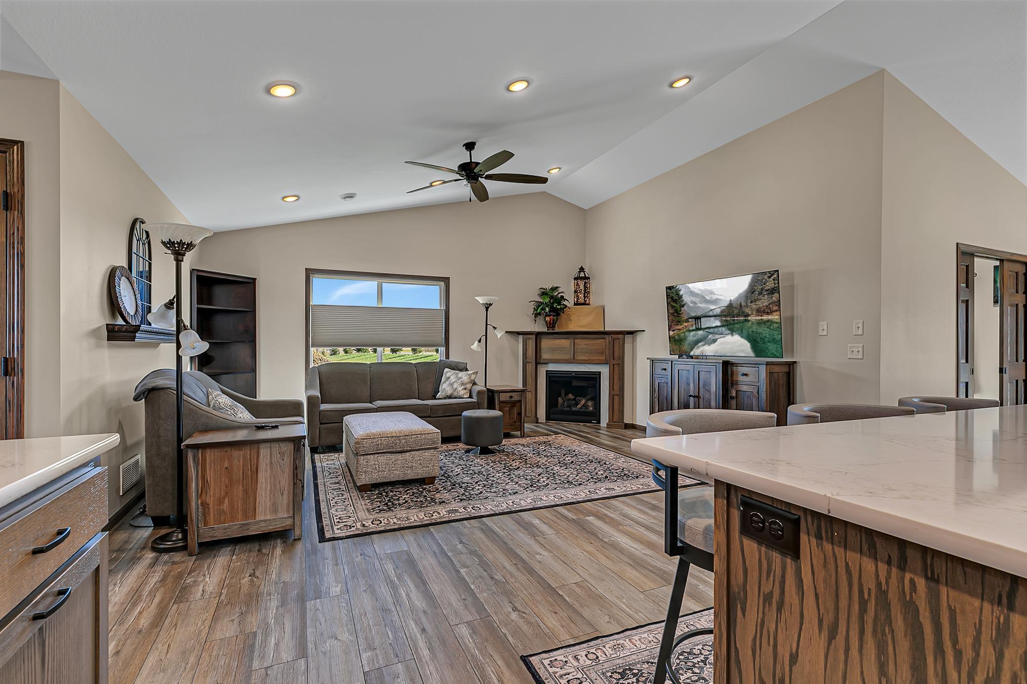 Discover effortless luxury and timeless design in this beautifully crafted 3-bedroom, 2-bath patio home, where every detail reflects quality and comfort.Step inside to experience a warm, open-concept layout with vaulted ceilings spanning the foyer, bathroom, living room, dining area, and kitchen—flooded with natural light and designed for both style and function. The home offers true one-level living with luxury flooring and in-floor heat, recessed lighting, and refined finishes throughout.The heart of the home is a stunning kitchen featuring quartz countertops, a large center island with additional storage and outlets, a tiled backsplash, a walk-in corner pantry, stainless steel appliances, a custom drawer microwave, and abundant soft-close cabinetry.Additional highlights include an elegant gas fireplace, a secure safe room, advanced security system, reverse osmosis system for drinking water, a four-season sunroom with pocket doors, a sand point well used for the in-ground sprinkler system, and a spacious laundry room with motion-activated lighting for added convenience. Outside, two storage sheds provide additional space.The heated 3-stall garage, equipped with two heaters, provides ample space for vehicles, storage, or use as a workshop. With no stairs and no association restrictions, this home combines sophistication, comfort, and independence—crafted for those who appreciate quality at every turn.