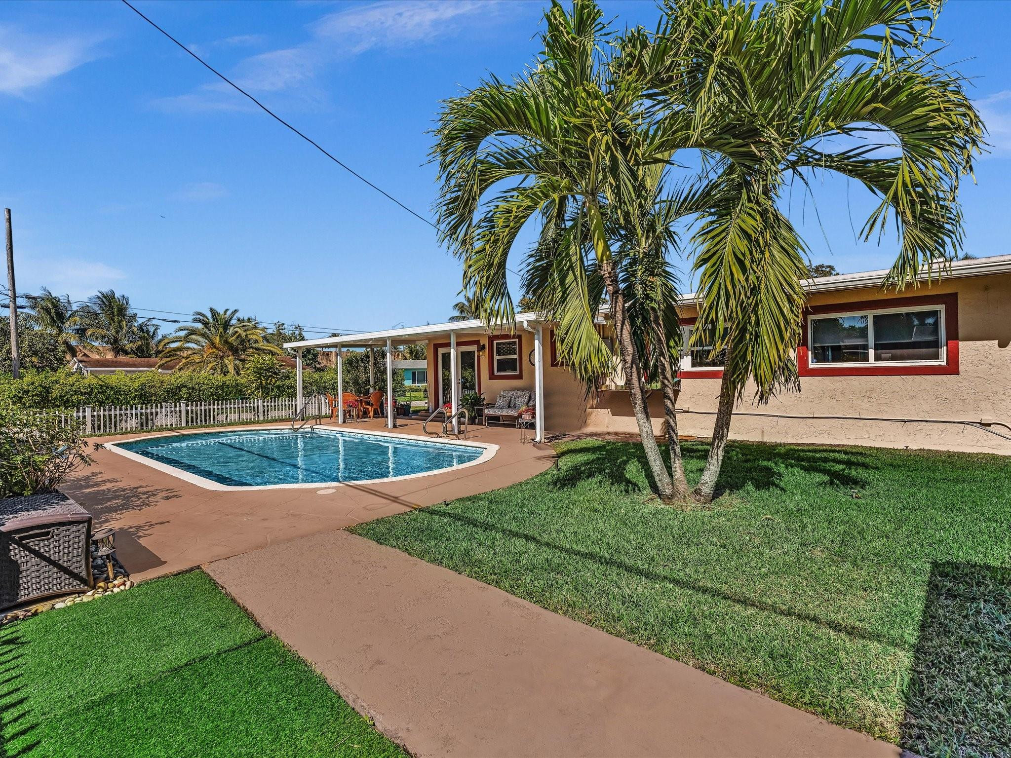3BR/2BA flex room, pool home on oversized corner lot, impact windows, updated kitchen & baths, circular drive, move-in ready.Located in a desirable neighborhood with tree-lined streets and a community park, this well-maintained home offers both space and flexibility.The updated kitchen and bathrooms feature tasteful finishes, while impact windows provide storm protection, energy efficiency, and insurance benefits.Enjoy a generous shaded patio overlooking the private pool — ideal for entertaining or relaxing outdoors year-round.Flexible floor plan includes three bedrooms plus a bonus flex room perfect for a home office, guest room or expanded living space.Additional features include a circular driveway, carport, sprinkler system and large backyard shed for storage.