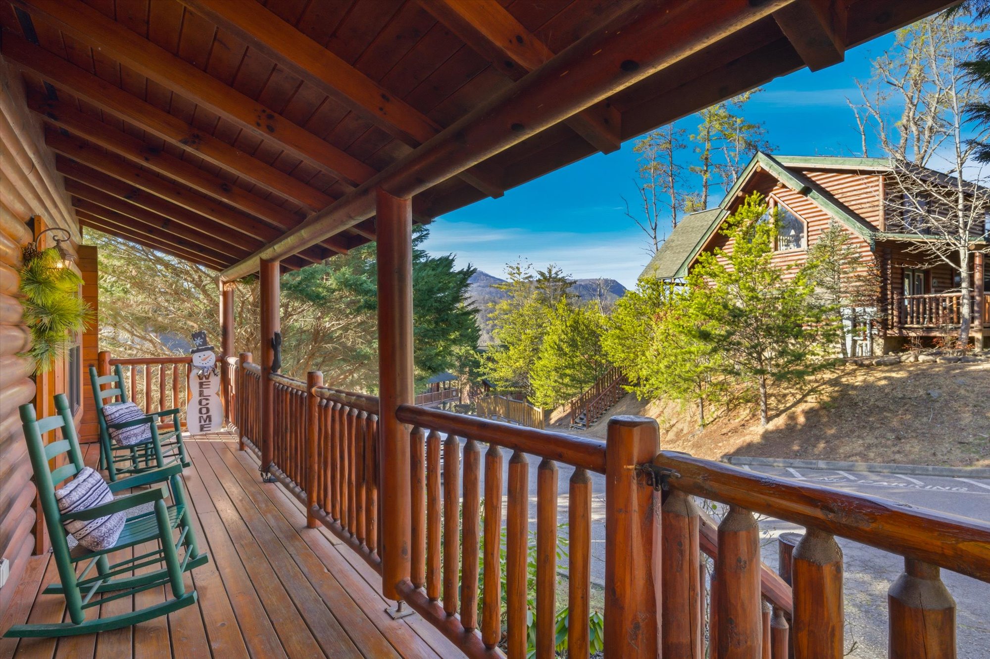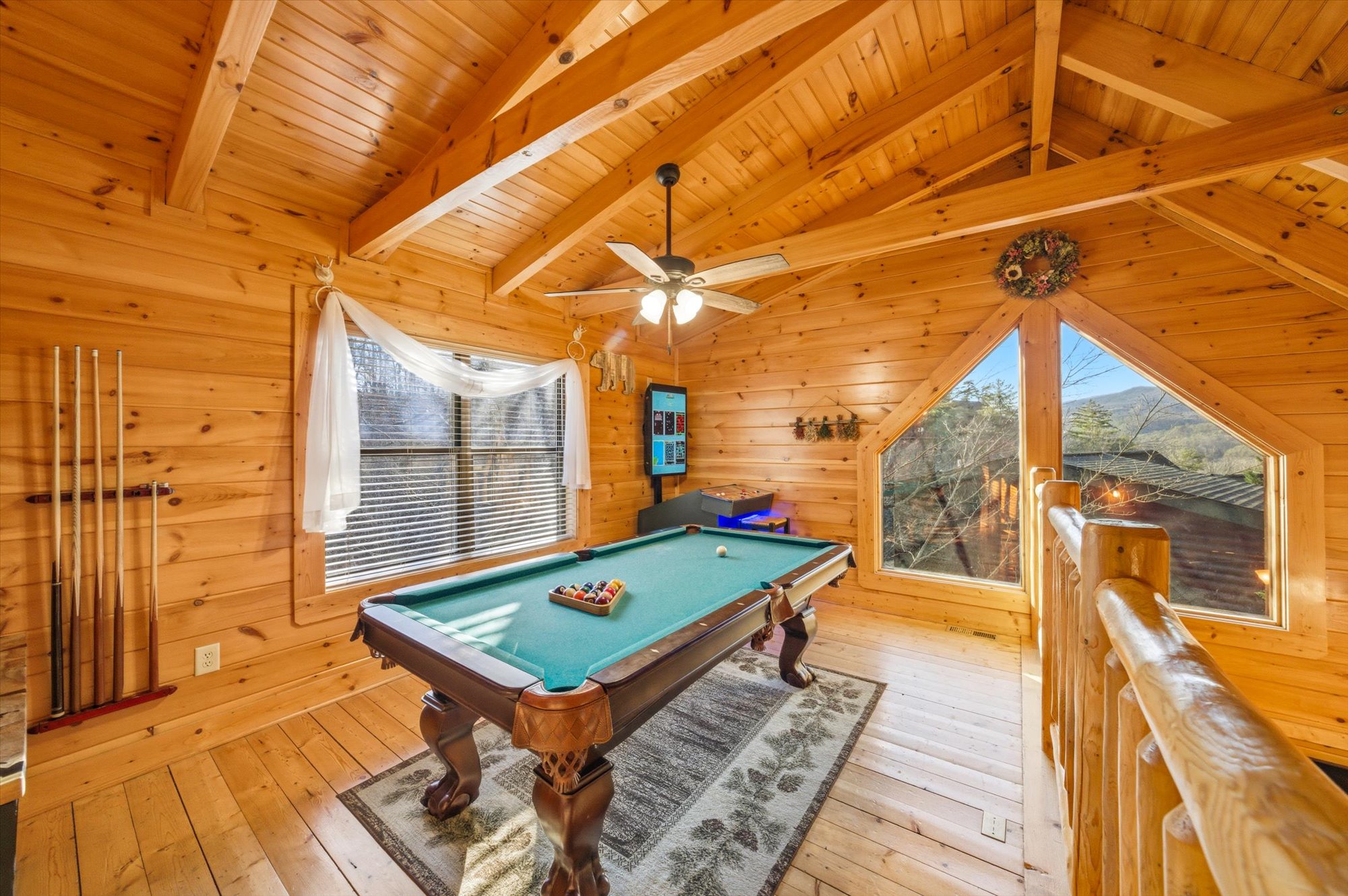 Fabulous log cabin with 466 top-rated Airbnb reviews and Guest Favorite status, offering a 2-bedroom, 2-bath layout plus a game loft, just minutes from downtown Pigeon Forge. Guests love the community pool and convenient access via multiple back roads—approximately 12 minutes to The Island and 20 minutes to Dollywood. The open-concept living and kitchen area features gleaming hardwood floors and a cozy stone fireplace, with easy access to the back porch to relax in rocking chairs or soak in the hot tub. The cabin offers two king-size suites, one on each level: the main-level suite includes wood-beam ceilings, a jetted tub, and a private bath, while the upper-level suite features cathedral ceilings, a sitting area, and a private bath, plus an airy loft with a pool table and arcade. Enjoy close proximity to all Pigeon Forge attractions without steep mountain roads, along with public utilities and high-speed internet. The property has been well maintained with a new roof (02/2025), new hot tub (04/2020), exterior staining (04/2020), rebuilt front steps (2024), furniture updates, etc.