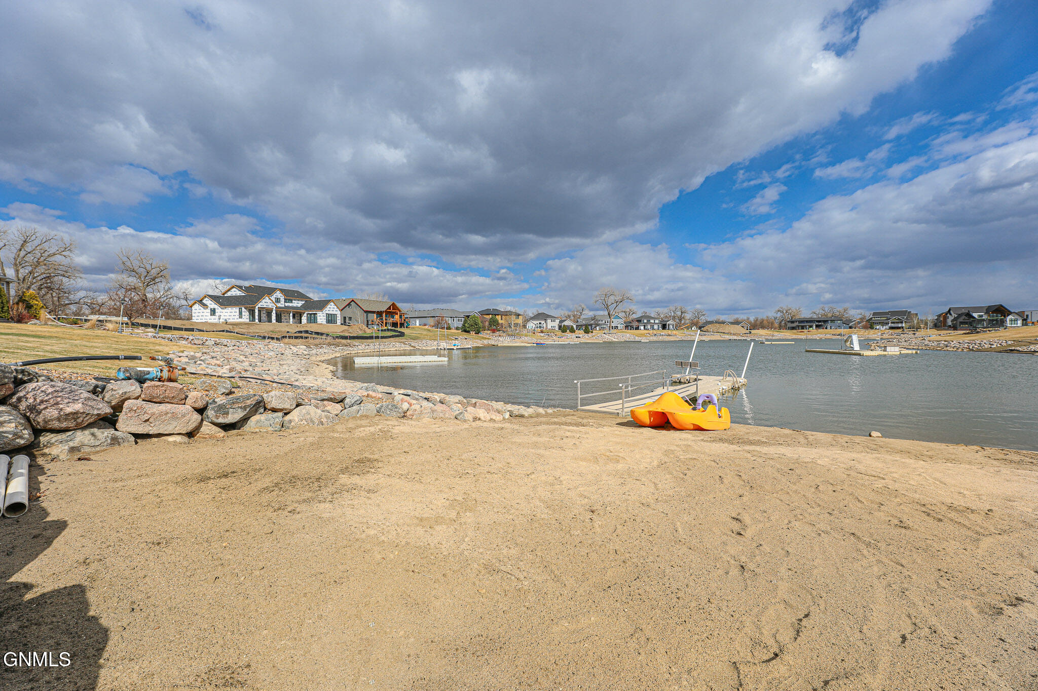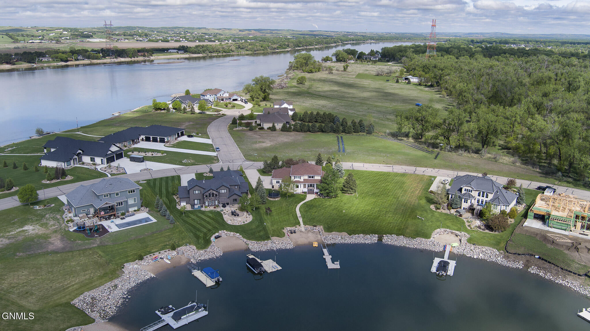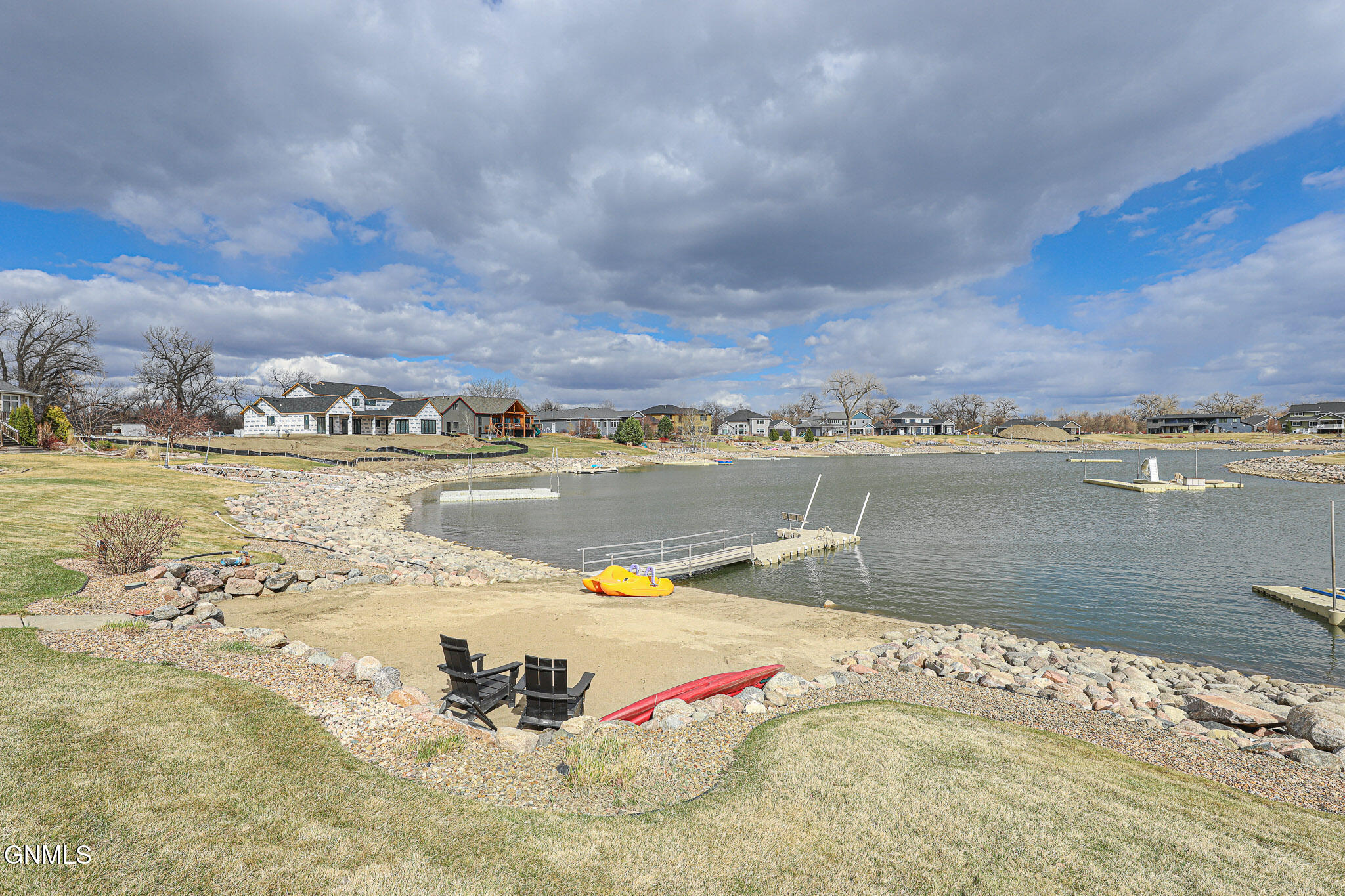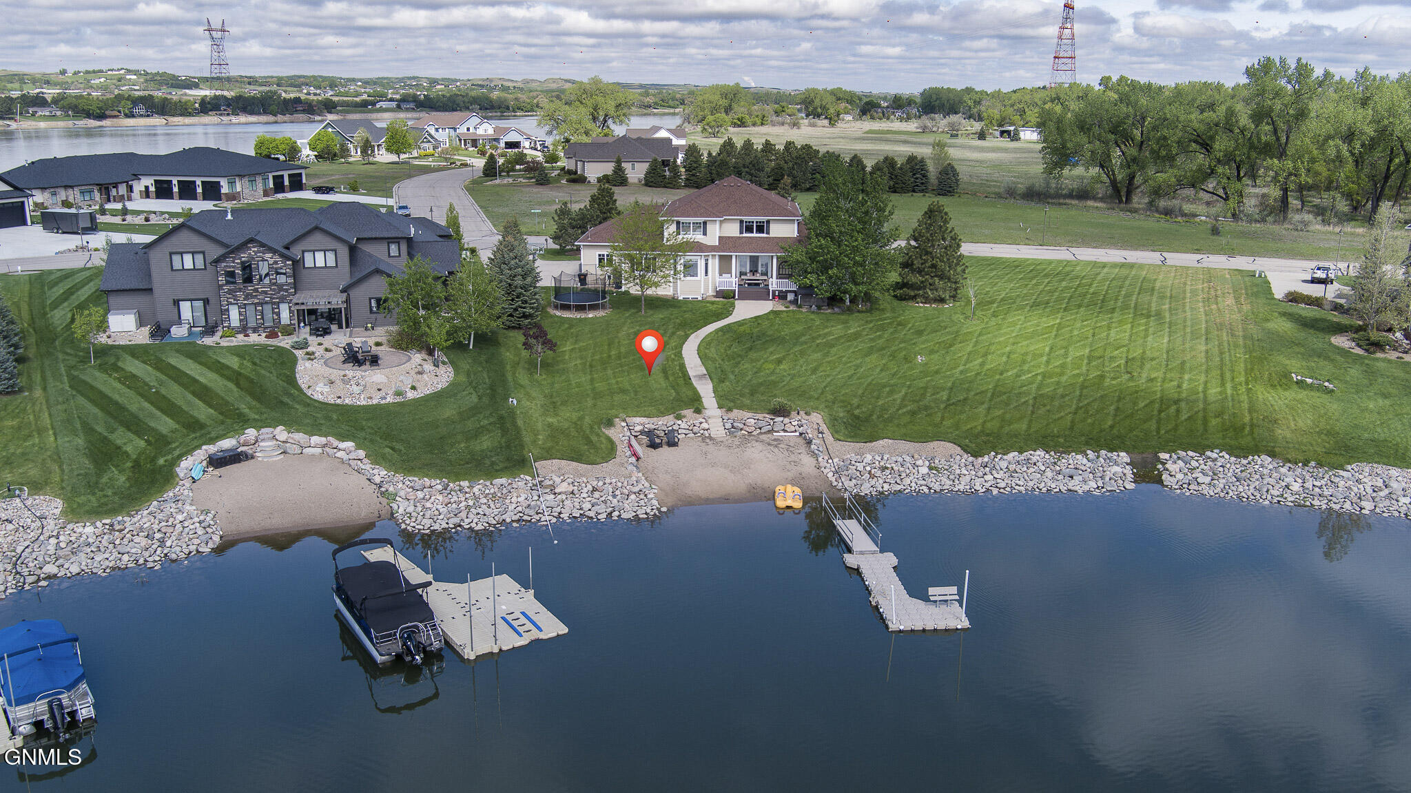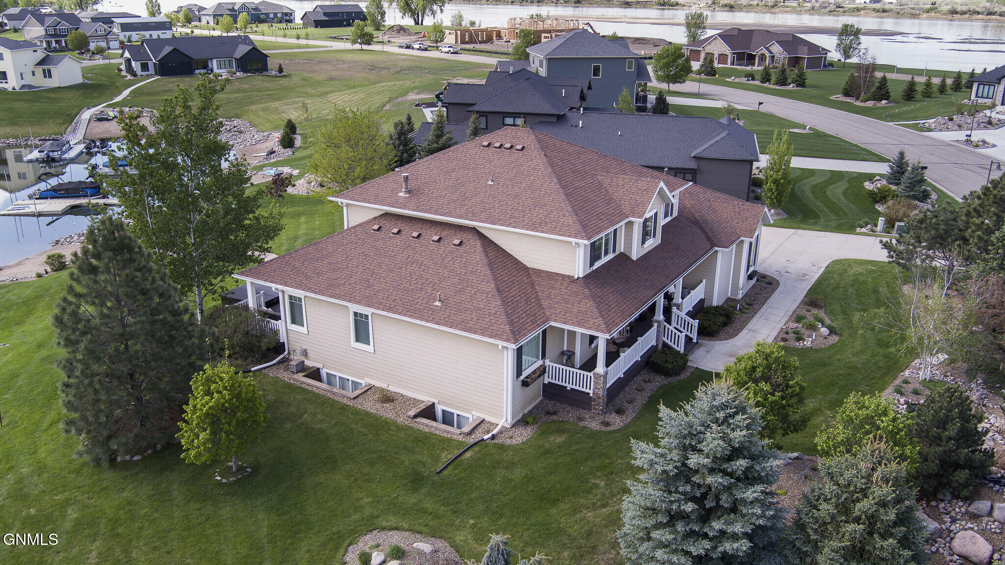 Welcome to 6501 Misty Waters Drive - where luxury meets the rhythm of everyday life. Tucked within one of Bismarck's premier neighborhoods, this stunning residence sits on just under a half-acre and offers 6 bedrooms, 6 bathrooms, and 5,734 square feet of curated comfort with direct access to the Missouri River via the Misty Waters bay. A charming front porch sets the tone for a thoughtfully crafted interior that's both inviting and effortlessly elegant. Step inside to a spacious entryway that flows effortlessly into the main living area—where large windows frame breathtaking bay views and a statement brick fireplace anchors the space with organic texture. Built-in cabinetry adds both function and elegance, while neutral tones and natural finishes create a calming, polished aesthetic throughout.The kitchen is both refined and functional, featuring quartz countertops, a gas stove, stainless steel appliances, a porcelain farmhouse sink, and under-cabinet lighting. Just beyond, a beautifully designed butler's pantry connects to the formal dining room, complete with additional cabinetry, a prep sink, and the ideal spot for a coffee bar or hidden appliances—seamlessly supporting everyday living and effortless entertaining. Adjacent to the kitchen, the everyday dining space is bathed in natural light and captures panoramic views of the backyard and bay—turning even casual meals into something special. Both the living room and dining area offer access to the expansive, maintenance-free deck overlooking the private beach, lush landscaping, and included boat dock.The primary suite is a retreat of its own—tucked off the main living space for added privacy. It features a cozy brick fireplace, generous windows with serene views, dual closets, a spa-inspired tiled shower, soaking tub, separate water closet, and dual vanities. For added pleasure, the suite also offers direct access to the maintenance-free deck—perfect for stepping outside to enjoy quiet mornings or beautiful evening views.A versatile main-level room, currently used as a music room, includes a closet and functions beautifully as a home office, library, or playroom. A full bathroom is conveniently located just off this space. On the opposite end of the main floor, a separate hallway leads to the mudroom, laundry room with scenic views, and an additional spacious ¾ bathroom situated near the garage entrance.Upstairs, three bedrooms and two full baths provide ample space and flexibility. One bedroom features a private en suite and walk-in closet, while the other two share a Jack and Jill bathroom with a beautifully tiled shower/tub surround. A timeless built-in display adds charm to the upstairs landing. Brand new carpet (2025) has been installed throughout the main and upper levels.Downstairs, the lower level is designed for both comfort and entertaining. The cozy family room includes a wet bar. A stunning 800-bottle climate-controlled wine cellar, a fully equipped theater room, and a mirrored home gym take functionality to the next level. Two additional bedrooms, a large full bathroom, and furnace/storage space complete the basement layout.The three-stall heated garage spans 982 square feet and features an epoxy floor, utility sink, and direct access to the backyard. Out back, the yard unfolds like a resort—complete with professional landscaping, mature trees, a peaceful water feature, front and rear sprinklers, and a sidewalk leading down to your own sandy beach shoreline and included private boat dock. It's a space designed for quiet mornings, sunset gatherings, and everything in between. With direct access to the Missouri River, this property offers not just a home, but a lifestyle—where every day feels like a retreat.