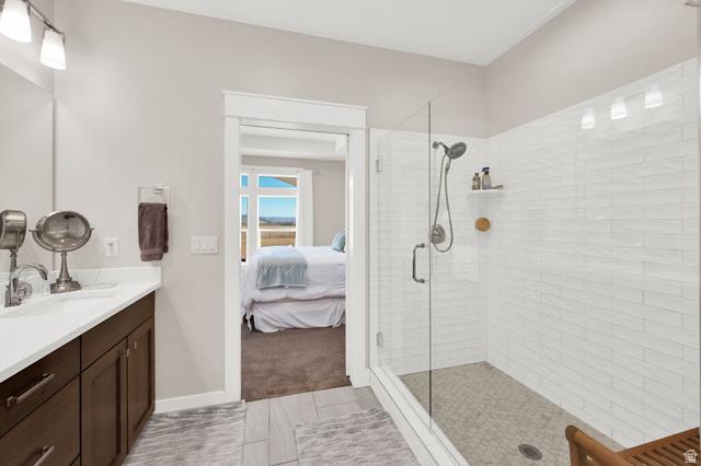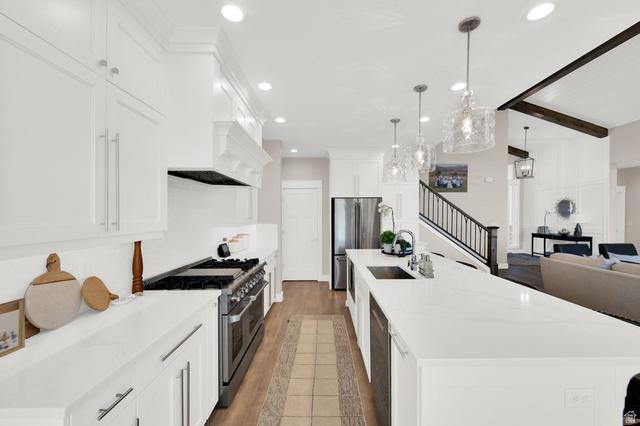 Extraordinary custom-built Craftsman masterpiece thoughtfully designed with intention, quality, and comfort at every turn. Perfectly situated on a full acre of flat, fully fenced and meticulously landscaped grounds, this property offers the ideal blend of luxury, functionality, and outdoor enjoyment. Pride of ownership and attention to detail truly set this home apart. Beautifully curated living space offers single-level living with a spacious and open floor plan. Enjoy generously sized bedrooms and three full bathrooms, designed to provide both comfort and privacy. Ceilings with stunning exposed beams and board & batten accent wall create warmth and architectural character, while custom flooring and intricate tile work elevate every room. The heart of the home is the gourmet farmhouse kitchen, an entertainers dream. Features include quartz countertops, stunning stainless steel Thor appliances, a walk-in pantry, and expansive prep space, this kitchen seamlessly flows into the main living and dining areas, making it ideal for hosting gatherings of any size. The luxurious primary ensuite serves as a private retreat, offering a gorgeous bathroom and a spacious walk-in closet designed for both beauty and functionality. Every finish throughout the home reflects careful craftsmanship and timeless style. Car enthusiasts and hobbyists alike will appreciate the enormous five-car heated, pull-through garage, providing ample space for vehicles, toys, storage, or workshop needs. Additional RV parking ensures there is room for all your adventures. The expansive yard provides endless possibilities, while the stunning flagstone patio creates a natural gathering space complete with an oversized gas fire pit, perfect for hosting unforgettable evenings under the stars or relaxing. Tastefully designed for both entertaining and everyday living, this exceptional property offers the rare combination of refined craftsmanship, expansive outdoor space, and modern comfort in one remarkable package!