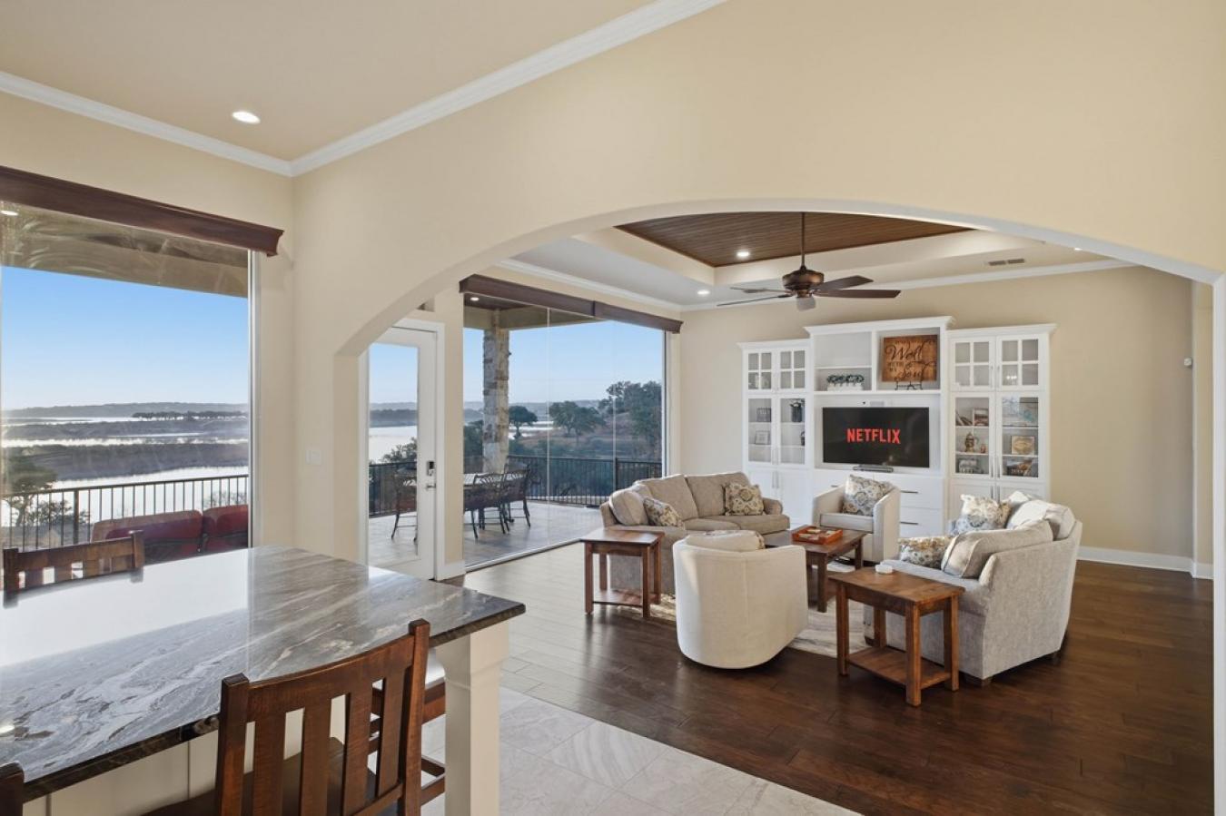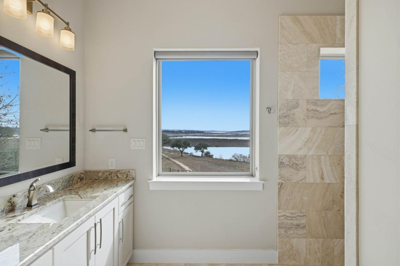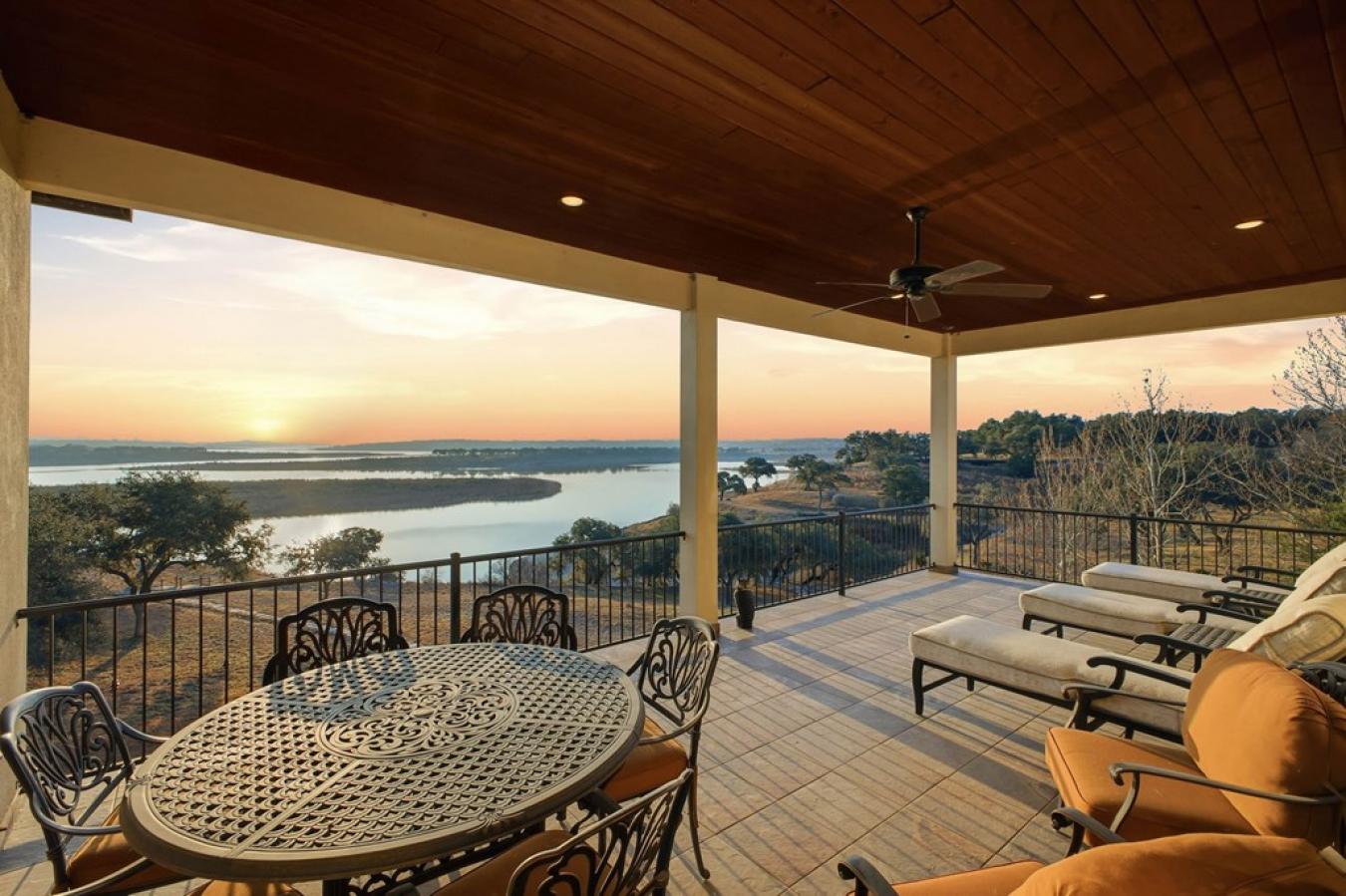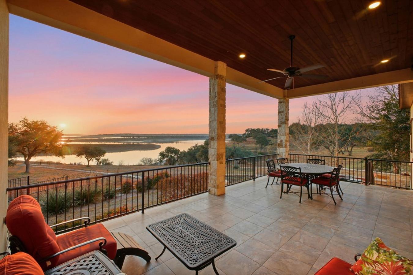 Experience true lakefront living in this stunning custom home located in the gated Peninsula at Mystic Shores on Canyon Lake. Set on 1.71 acres of prime waterfront with shoreline access, this 3,987 sq ft residence offers breathtaking, unobstructed lake views through expansive floor-to-ceiling windows that flood the home with natural light. This thoughtfully designed home features 4 bedrooms, each with its own private en suite bathroom, and 4.5 baths. The open-concept living area showcases beautiful wood-paneled ceilings in both the main living room and primary suite, creating a warm yet refined atmosphere while framing panoramic water views. The large kitchen offers plenty of storage and workspace, ideal for entertaining and everyday living. A second-floor mini kitchen adjacent to the media room provides added convenience for guests or extended gatherings. Enjoy outdoor living with two spacious patios overlooking the lake, perfect for relaxing, dining, and taking in the scenery. The primary suite includes a custom walk-in closet with built-in storage for exceptional organization.