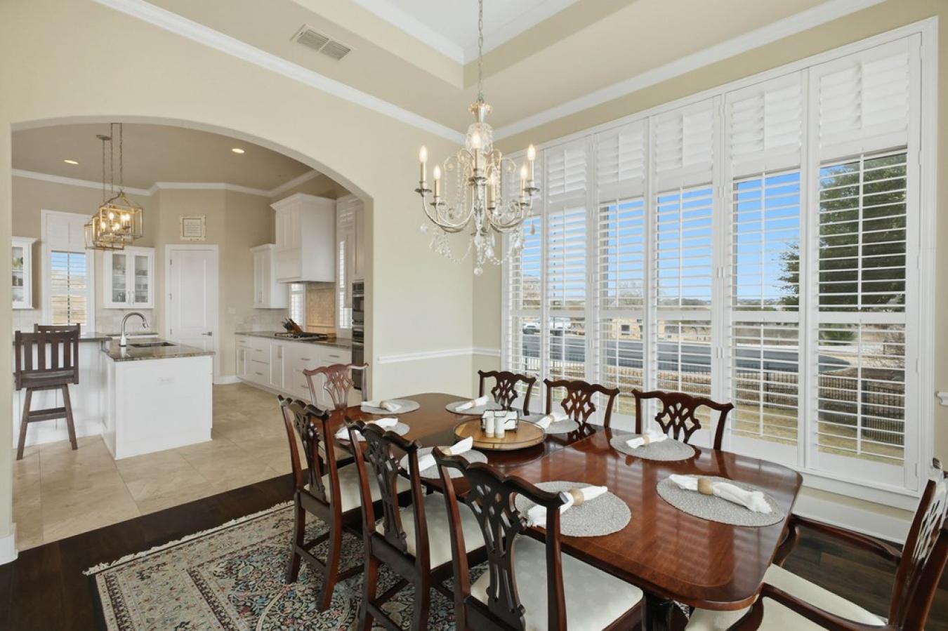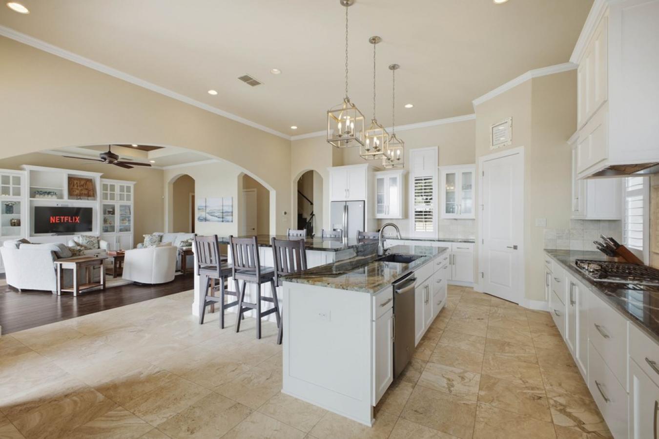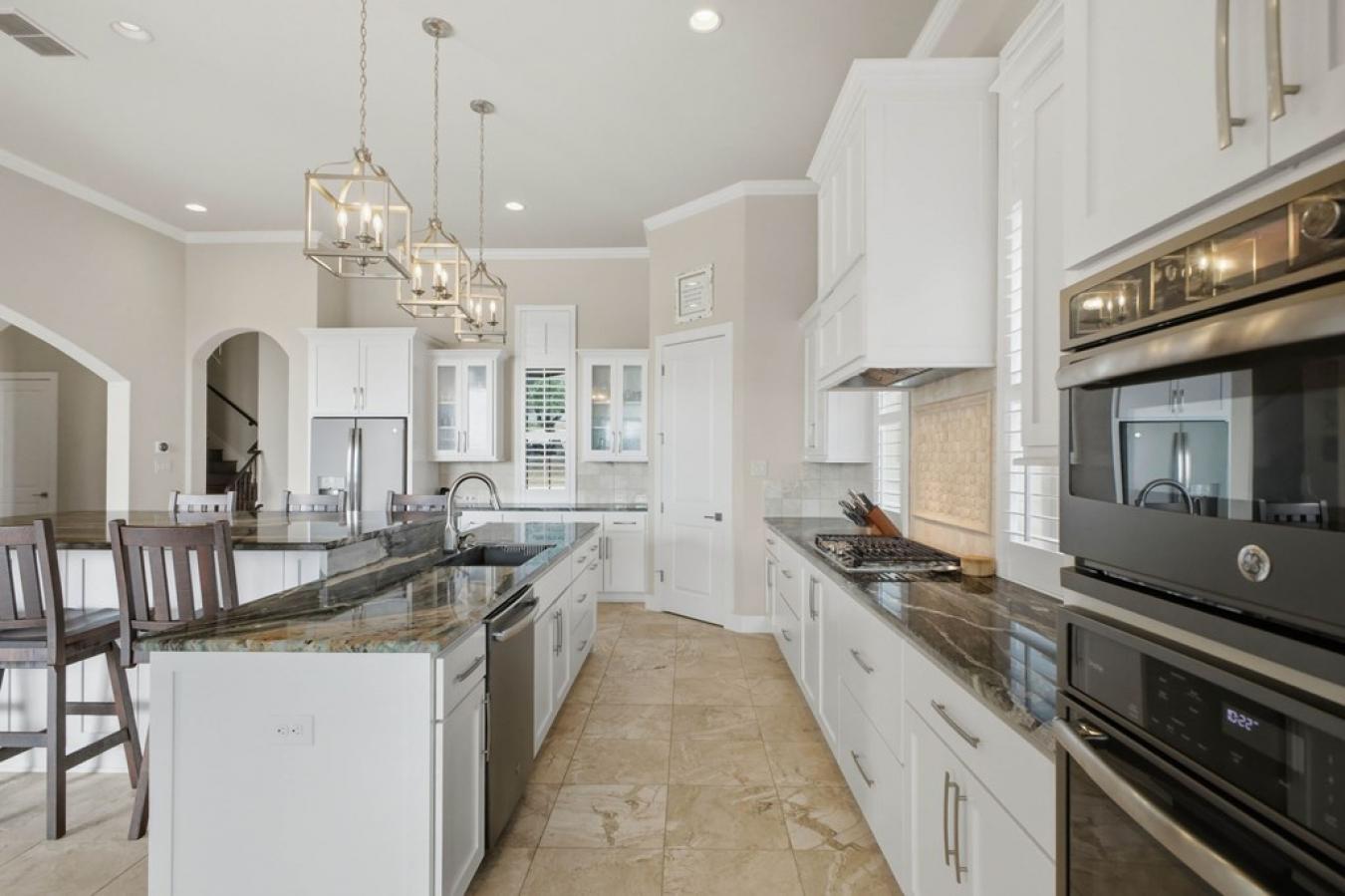 Magnificent stone estate offering timeless European elegance and exceptional walkability. This beautifully refreshed residence features five bedrooms, six full baths, two half baths, and five fireplaces, with newly painted interiors and a stunning white chefs kitchen that opens seamlessly to expansive living and entertaining spaces. A dramatic marble foyer welcomes you into light-filled rooms with walls of windows, rich Brazilian walnut and cherry floors, custom cabinetry, and exquisite designer details throughout. The main-level owners suite is a private retreat with a sitting room, dual spa-inspired baths connected by a walk-through shower, heated floors, and generous custom closets. Resort-style outdoor living includes a PebbleTec pool and hot tub, outdoor fireplace, kitchen, and beautifully landscaped grounds with private walking trails now extending both north and south of the home, connecting to the newly opened 400 Trail. Enjoy a true European lifestyle-stroll to dinner, shopping, fitness, schools, and entertainment, then walk home to your private sanctuary.