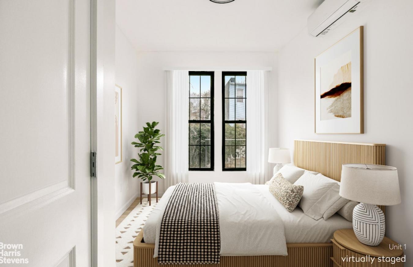 Offered for sale is an approx. 3,000-square-foot newly renovated two-family townhouse on Jefferson Avenue between Bushwick Avenue and Broadway. Comprised of an "owners duplex" and a separate 3-bedroom rental apartment, this property has been fully renovated with new kitchens and bathrooms, split A/C, and new windows. With great natural light and 18 feet of width, the exposures and proportions are ideal. The property is well positioned on a quiet residential block, nearby to the J-train at Halsey Street. The opportunity to rent out one of the two units for income is ideal-very low property taxes and separate utilities make this an ideal investment or live-with-income opportunity. Entered up the stoop, the parlor floor of this townhouse is home to an open living and dining area with a large kitchen. The living area, facing northeast and towards the front of the building, is lit by a large bay window. Adjacent to this flexible living and dining space is a spacious and well-appointed kitchen with a large island, capable of seating four. Full-sized stainless steel appliances, Caesarstone countertops, and white lacquered cabinetry complete the simple and refined look. Towards the back of the main floor, there are two bedrooms, one adjacent to a hall bathroom and the other with an en-suite bath. Both bedrooms face southeast, and one of them includes access to a deck and private backyard. Also on this floor is a washer/dryer. This duplex apartment offers layout flexibility, with a finished lower level containing an additional full bath and access to the garden. There is also a second entrance under the stoop at the front of the building. The top floor is a 3-bedroom simplex unit, which has a similar orientation and layout to the parlor floor. There are two bedrooms facing the rear gardens and one at the front of the building. The second unit also has a large kitchen with an island, a laundry room, and two full bathrooms. Please note that some photos have been virtually staged.