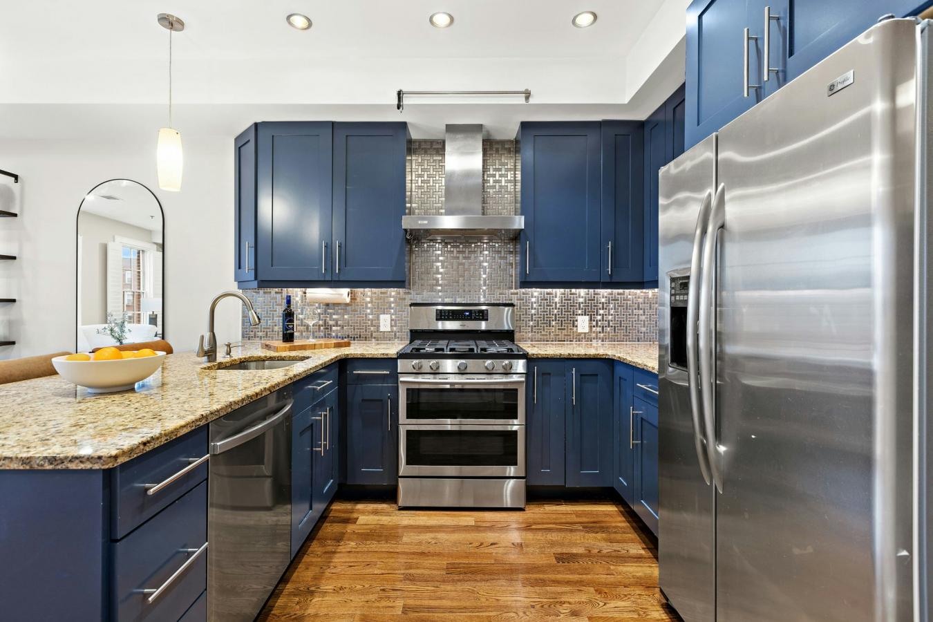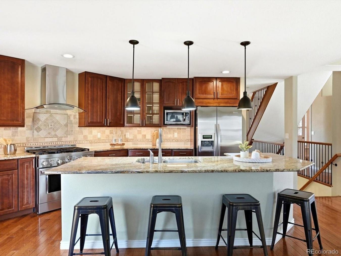 Sprawling nearly 2,000-square-foot three-bedroom, three-bathroom duplex condo with an additional bonus den area. The main level features an expansive open-concept living area, with the den thoughtfully utilized as a dining space. The chefs kitchen is equipped with granite countertops, a stainless steel backsplash, breakfast bar, and stainless steel appliances, including a built-in wine fridge.