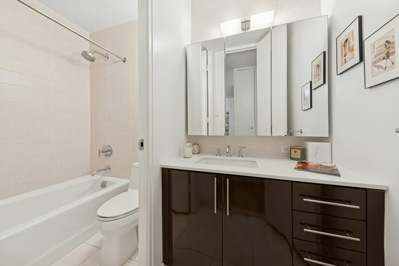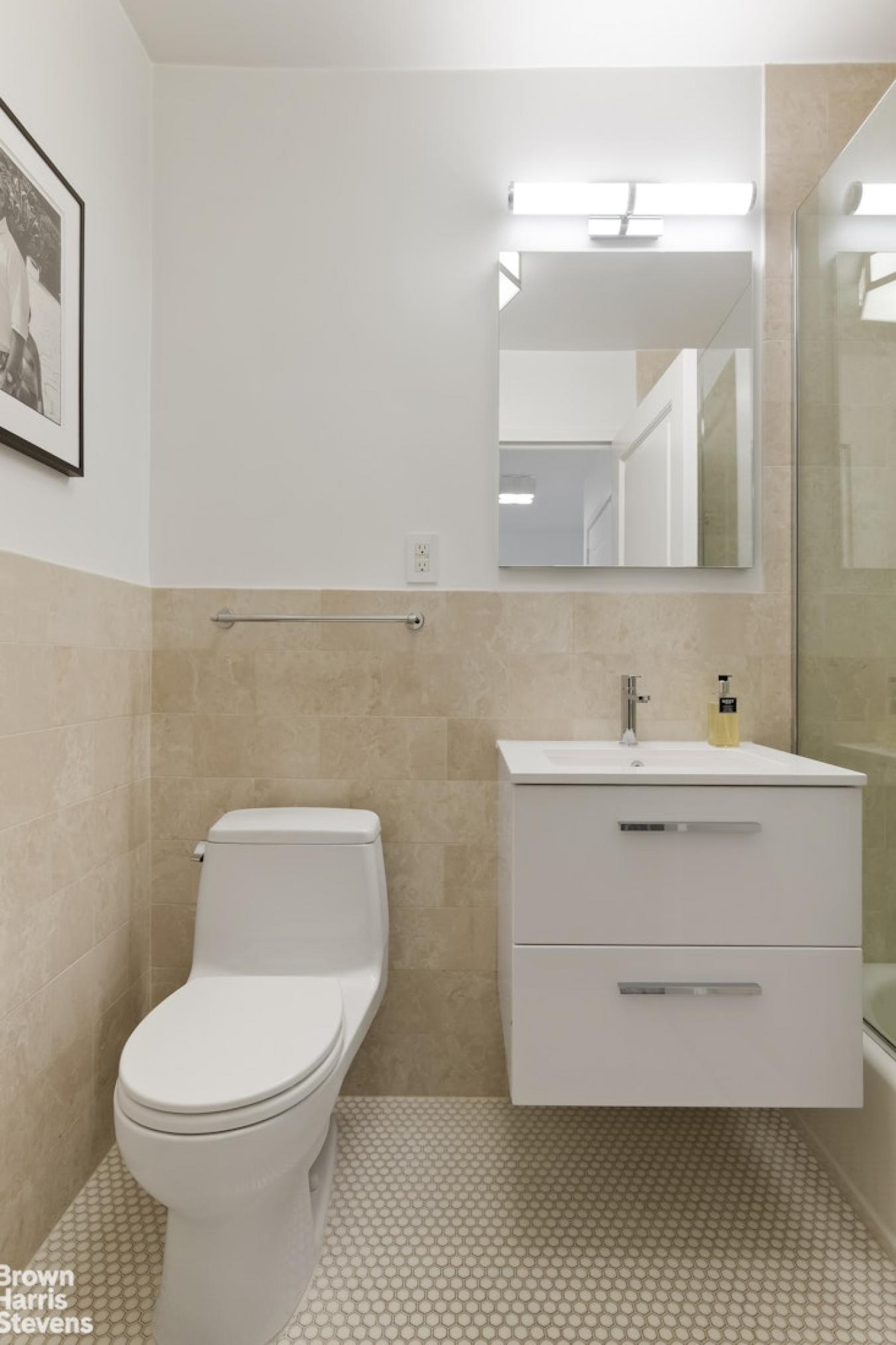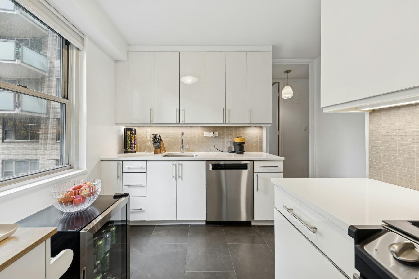 Boutique UES Decorators Condo Welcome to this beautifully designed, light-filled home featuring wood plank oak flooring throughout and a flexible, thoughtfully laid-out living space. The expansive primary suite is a true retreat, boasting wraparound corner windows, room for a king bed plus sitting and desk areas, and exceptional storage with both a walk-in and double-wide closet. The spa-like ensuite bath is finished in oversized white subway tile and intricate marble flooring, with a glass-enclosed soaking tub/shower and Toto toilet. The main living area offers distinct dining and living zones, with a wraparound windowed dining alcove currently styled as a stunning home office with a closet-easily convertible to a second bedroom. The sleek kitchen is outfitted with stainless steel appliances, a paneled dishwasher, a high-arc spray faucet, and subtly veined white quartz countertops and backsplash, plus a refrigerator with an in-door water dispenser. A deep, double-door hall closet houses a combo washer/dryer and provides abundant storage. The second full bathroom is equally refined with inlaid marble hexagonal penny tiles, full marble walls, and a glass-enclosed soaking tub/shower. Residents enjoy access to a full suite of amenities, including a lower-level fitness center (no fee), yoga room, lounge, laundry room, bike storage, and multimedia/entertainment space. The 5th-floor resident lounge features a full kitchen, bath, and large-screen TV, while the beautifully furnished rooftop offers lounge chairs, umbrellas, BBQs, and long dining tables with sweeping city views-ideal for entertaining, WFH, or relaxing. This full-service condominium offers a 24-hour doorman, concierge, live-in superintendent, porter service, video surveillance, elevator access, and on-site storage options, and pets are welcome. Subletting is allowed from day one with board approval, making this an excellent primary residence, pied--terre, or investment opportunity. Perfectly positioned on the Upper East Side, 300 East 64th Street offers convenient access to top dining, shopping, and transportation, along with nearby parks and cultural institutions. A refined, comfortable lifestyle awaits in one of Manhattans most desirable neighborhoods.