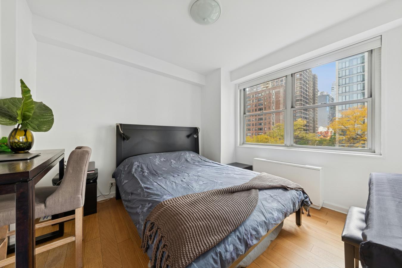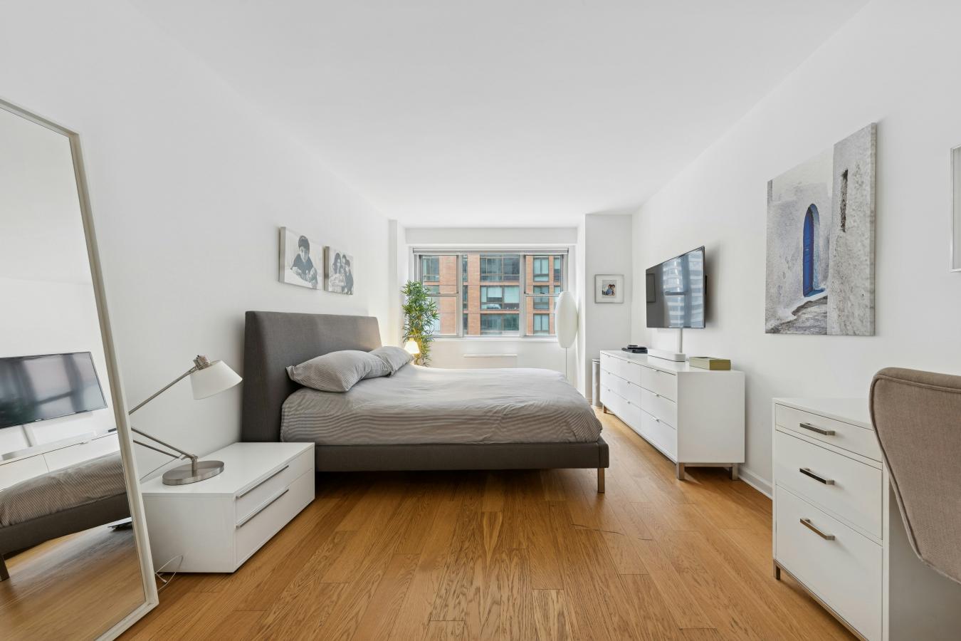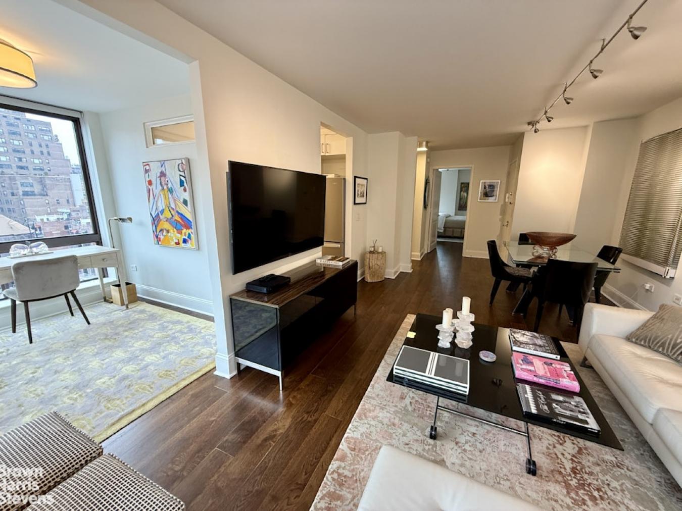 Boutique UES Decorators Condo Welcome to this beautifully designed, light-filled home featuring wood plank oak flooring throughout and a flexible, thoughtfully laid-out living space. The expansive primary suite is a true retreat, boasting wraparound corner windows, room for a king bed plus sitting and desk areas, and exceptional storage with both a walk-in and double-wide closet.