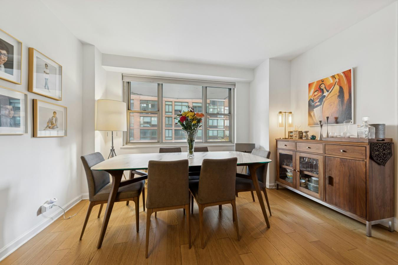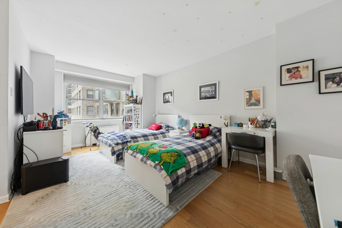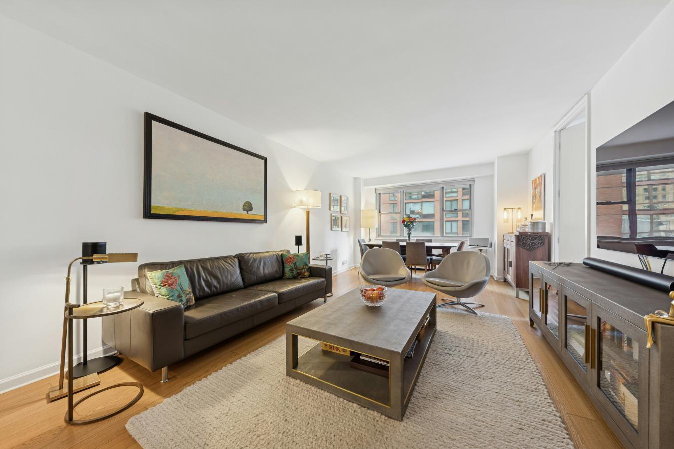 Boutique UES Decorators Condo Welcome to this beautifully designed, light-filled home featuring wood plank oak flooring throughout and a flexible, thoughtfully laid-out living space. The expansive primary suite is a true retreat, boasting wraparound corner windows, room for a king bed plus sitting and desk areas, and exceptional storage with both a walk-in and double-wide closet.