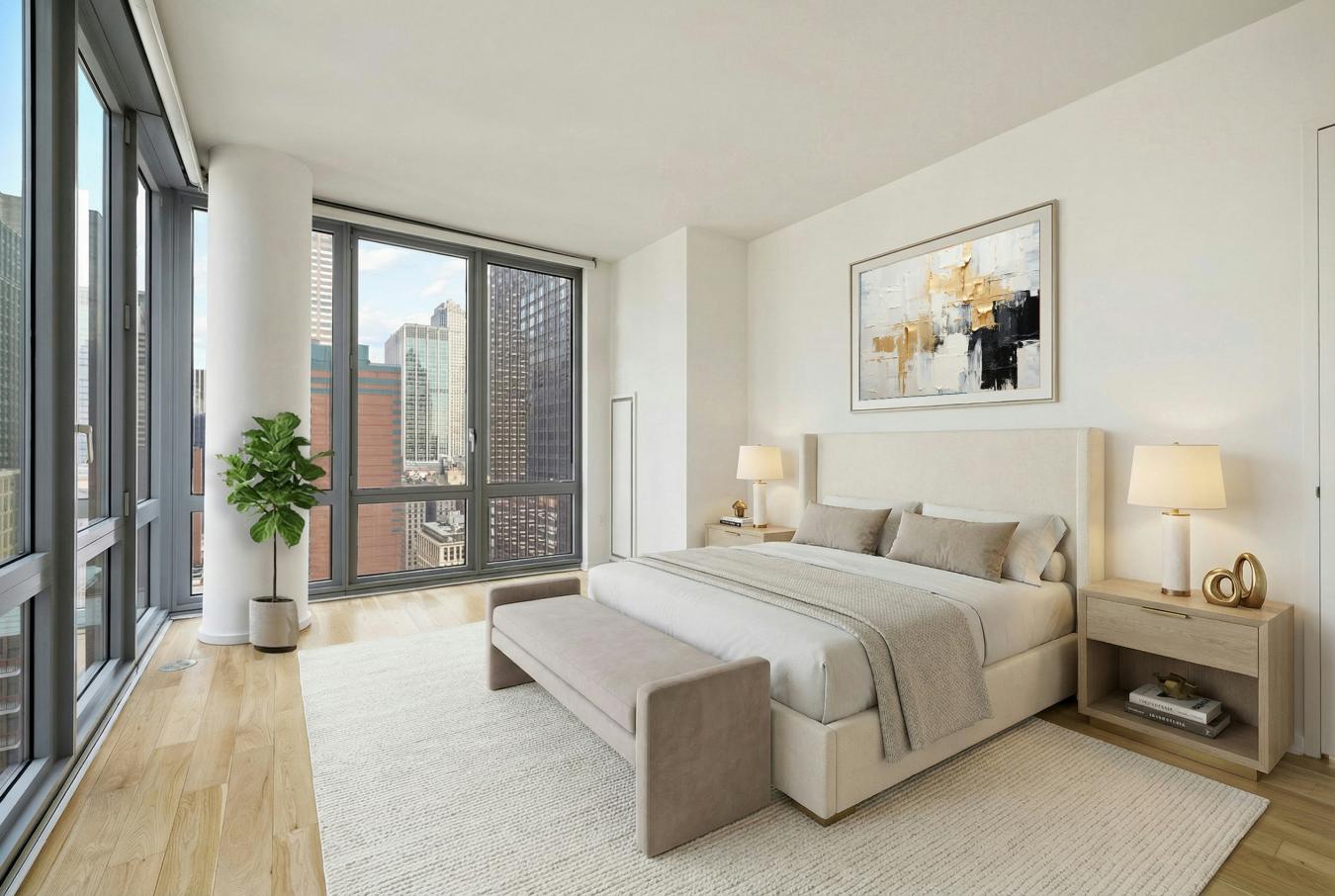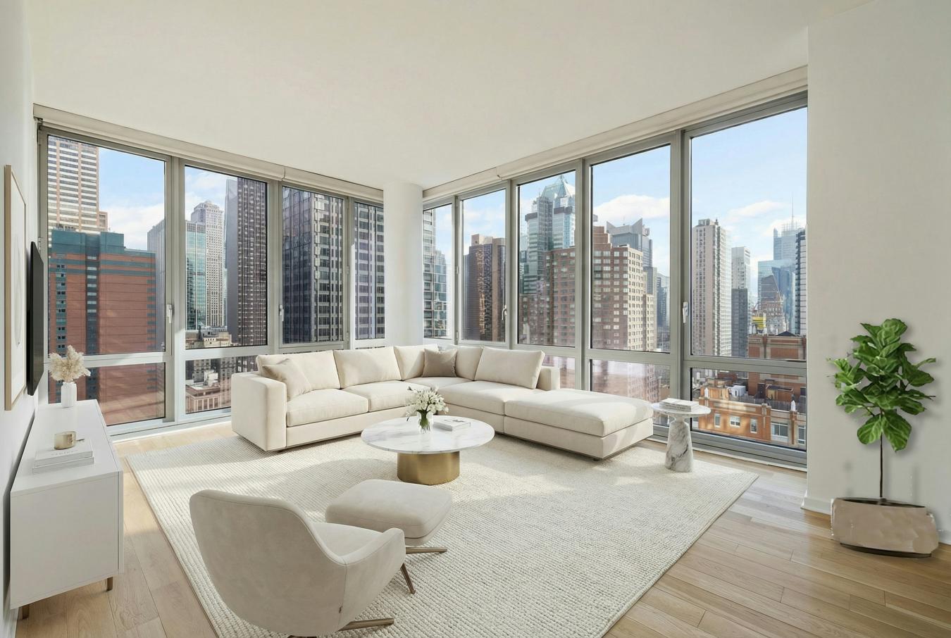 High-floor 1 bed/1.5 bath with Central Park and Hudson Yards skyline views. This oversized one-bedroom condo features three exposures to the S/E/N from its corner living room and corner bedroom. The spacious corner living room is wrapped in floor-to-ceiling glass, allowing eastern and southern light to pour into the home throughout the day while providing open vistas of the Hudson Yards skyline.