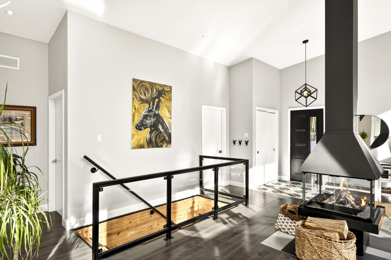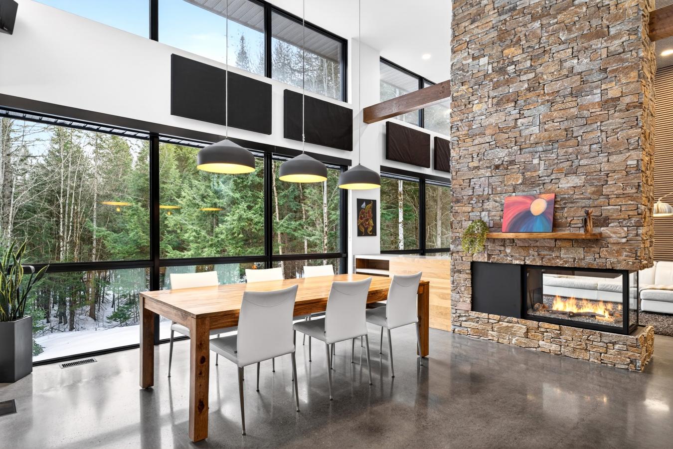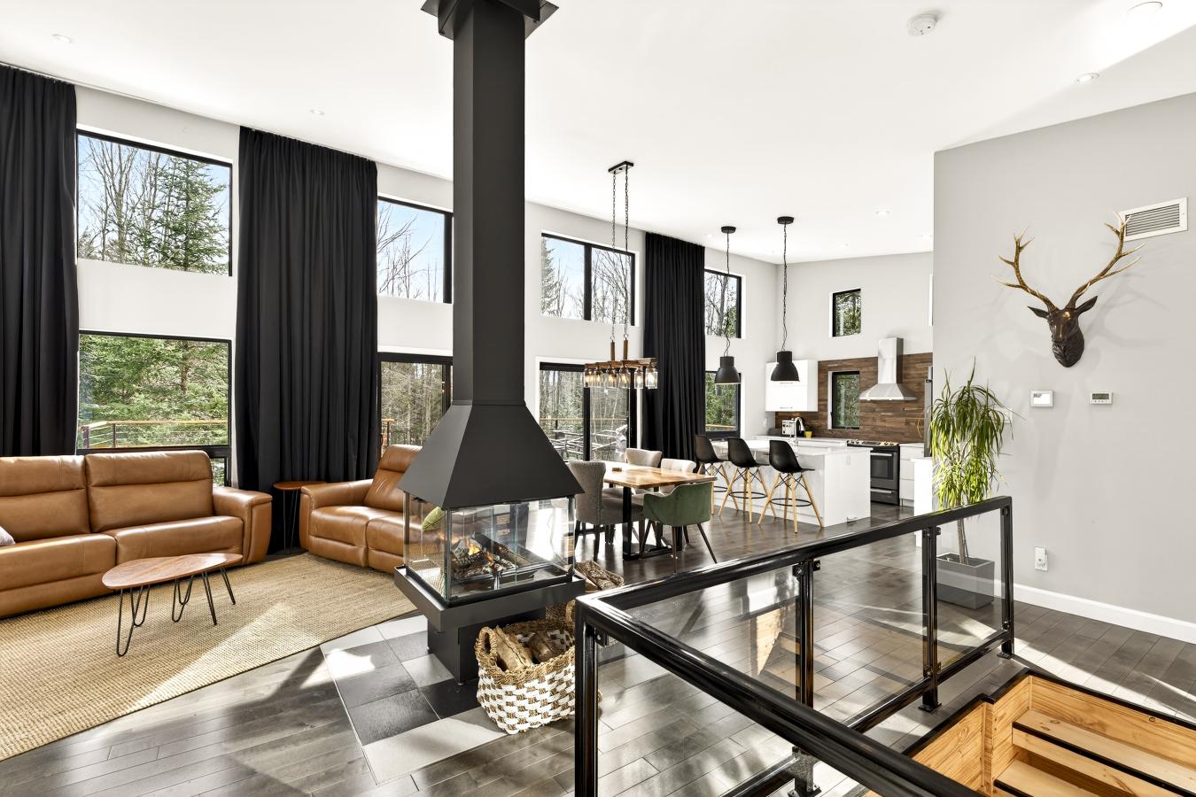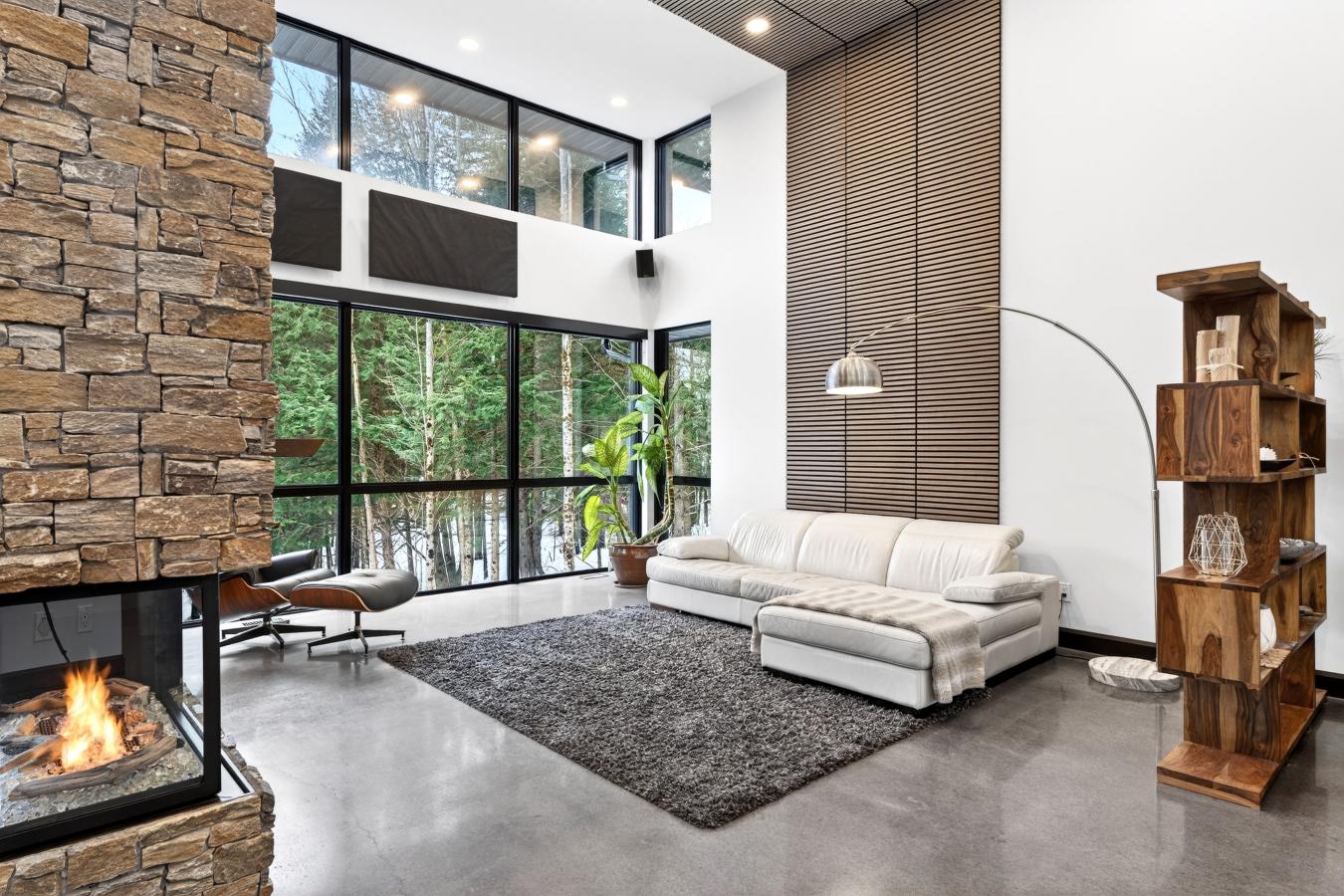 Imagine living in the heart of a peaceful, natural setting, in a property with a clean, Nordic design. Offering 32,750 sq ft of land, this home provides an exceptional living environment. Its bright, open-concept living area, enhanced by a nearly 14-foot ceiling and abundant windows, is centered around a warm, wood-burning fireplace.