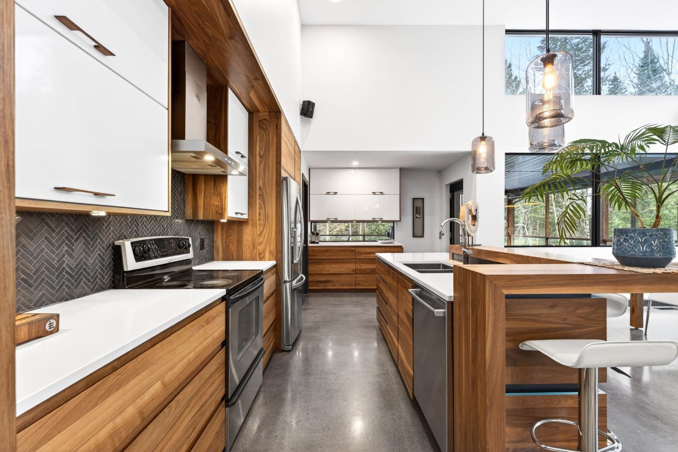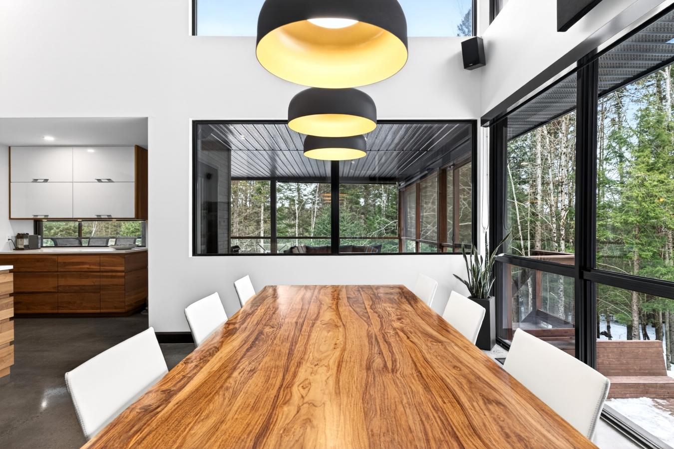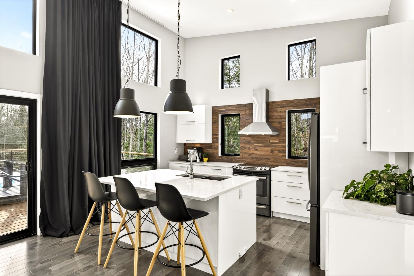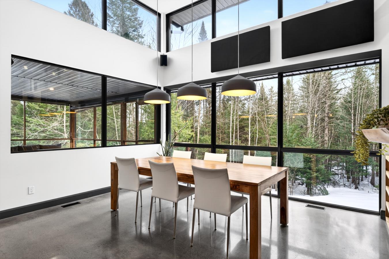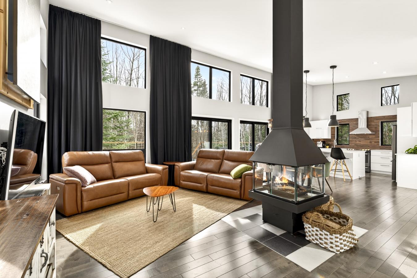 Imagine living in the heart of a peaceful, natural setting, in a property with a clean, Nordic design. Offering 32,750 sq ft of land, this home provides an exceptional living environment. Its bright, open-concept living area, enhanced by a nearly 14-foot ceiling and abundant windows, is centered around a warm, wood-burning fireplace.